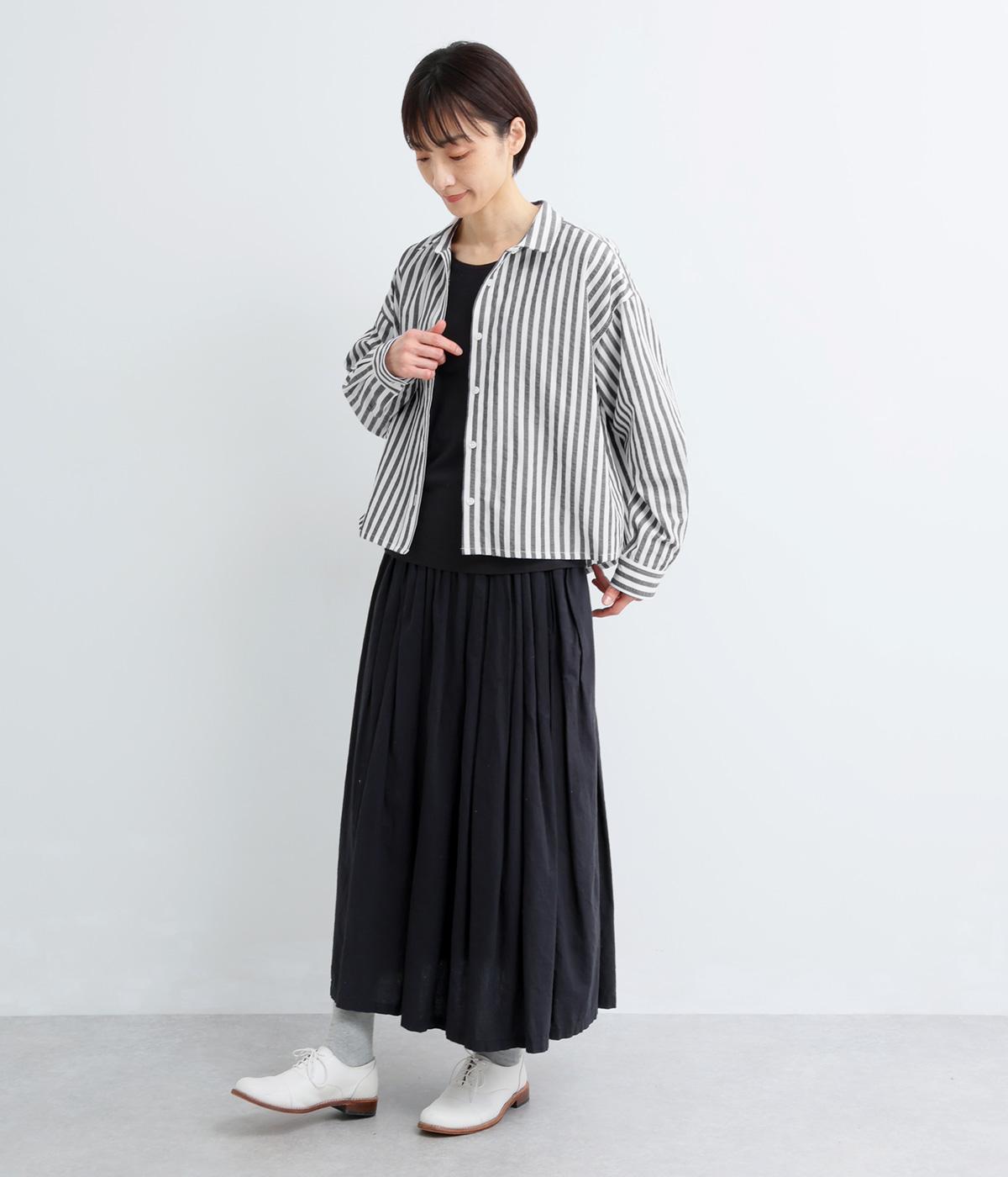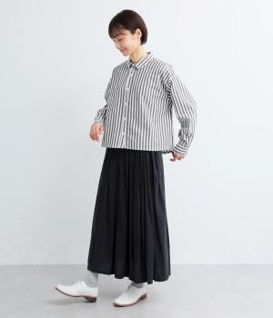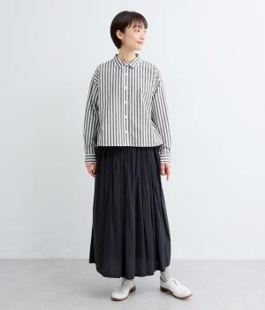 裾に向かって広がるAラインシルエットを、すっきりとした丈感で仕上げました。前後差のある裾がふんわりとしたシルエットを描き、腰まわりをさりげなくカバーします。スタイリングに軽やかな立体感をプラスしてくれる一枚です。