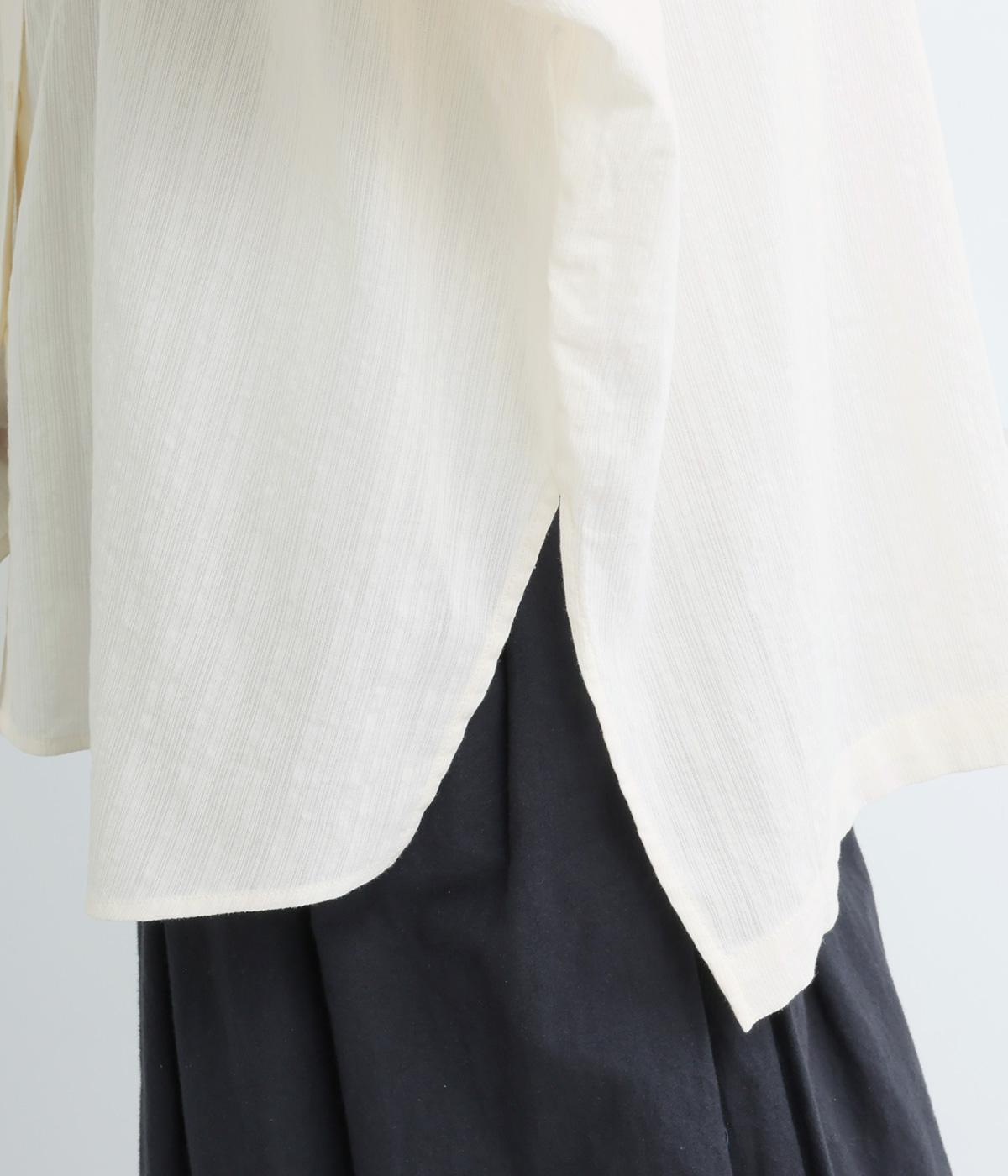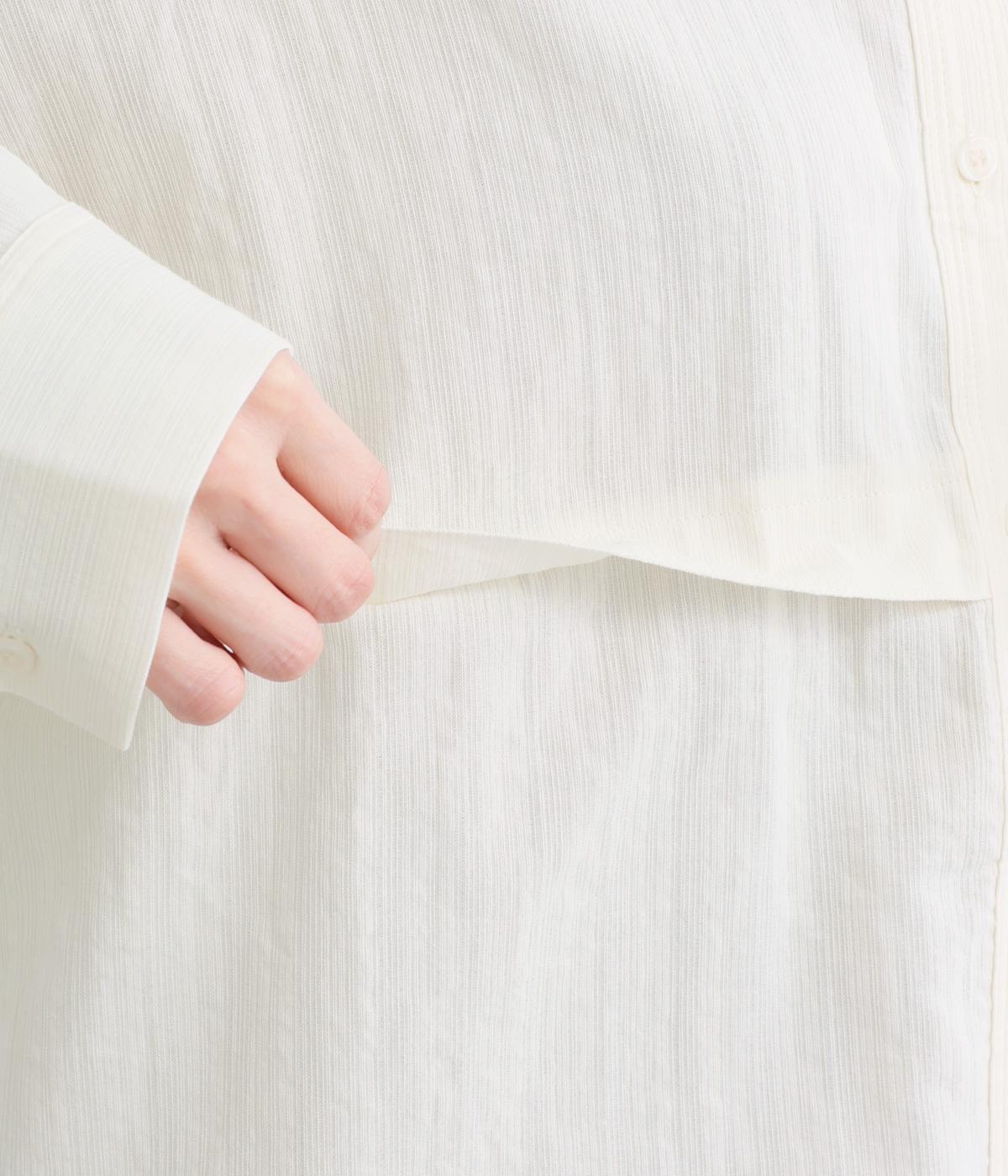 シャリ感のある手ざわりが心地よい、コットン素材を使用しました。縦に入ったスラブが、立体感のある表情を生み、洗い加工によるやわらかな風合が、ナチュラルな雰囲気を引き立てます。清涼感があり、ロングシーズン快適に着用できる素材です。
