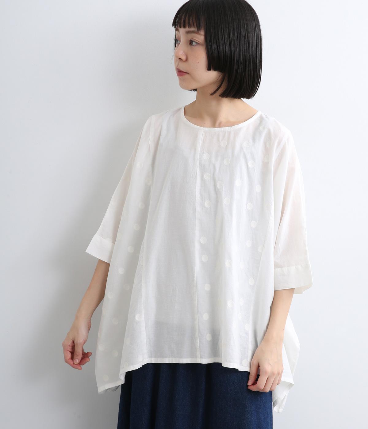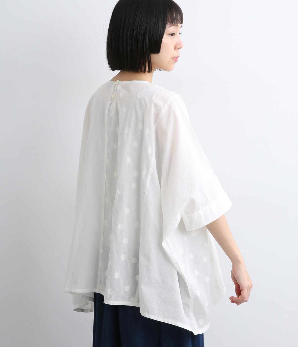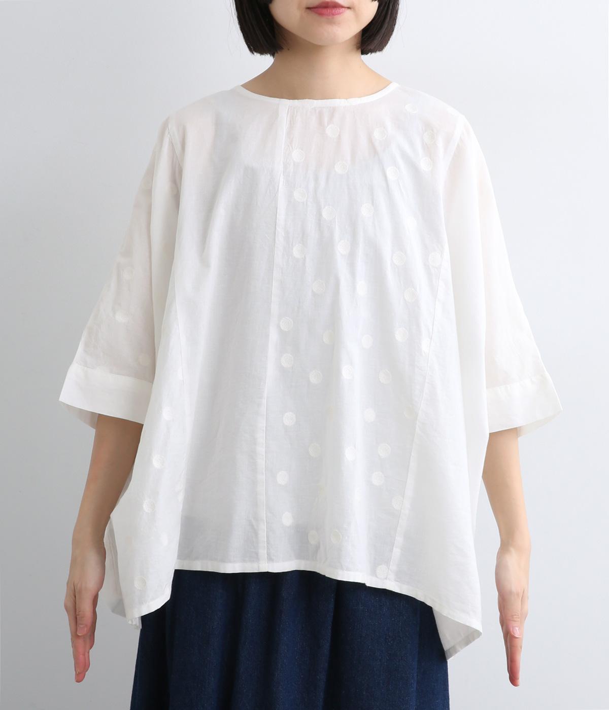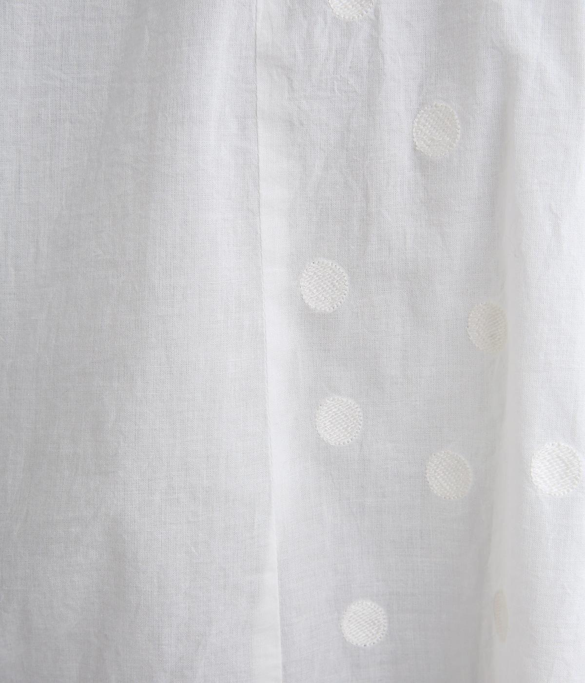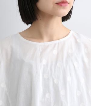 かわいらしさまとう大きめなドット刺しゅう。無地とバランスよく切り替えることで、甘すぎない大人の雰囲気に仕上がりました。軽やかな素材感を生かしたゆったりシルエットは、動きに合わせて優雅に揺れ、女性らしい表情を添えます。