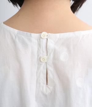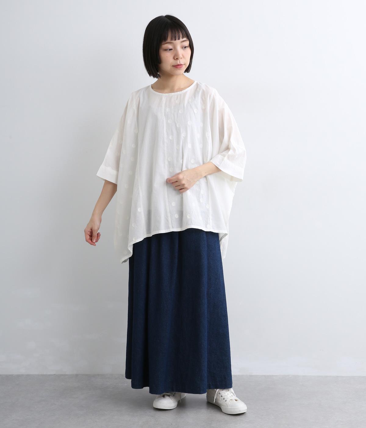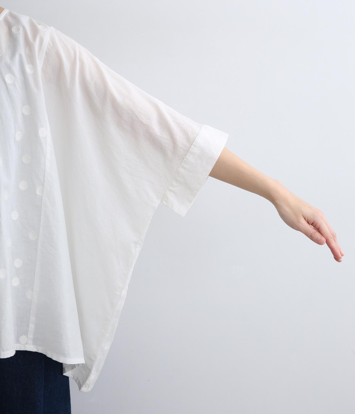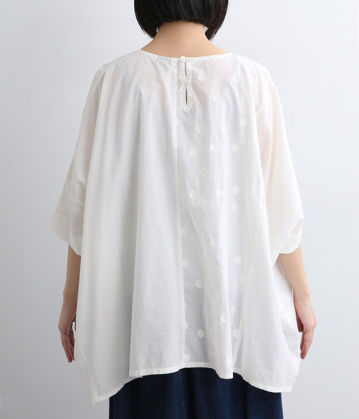 かわいらしさまとう大きめなドット刺しゅう。無地とバランスよく切り替えることで、甘すぎない大人の雰囲気に仕上がりました。軽やかな素材感を生かしたゆったりシルエットは、動きに合わせて優雅に揺れ、女性らしい表情を添えます。