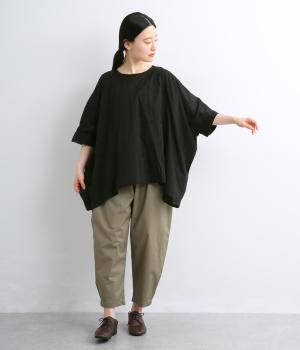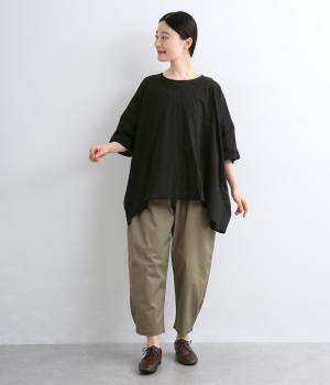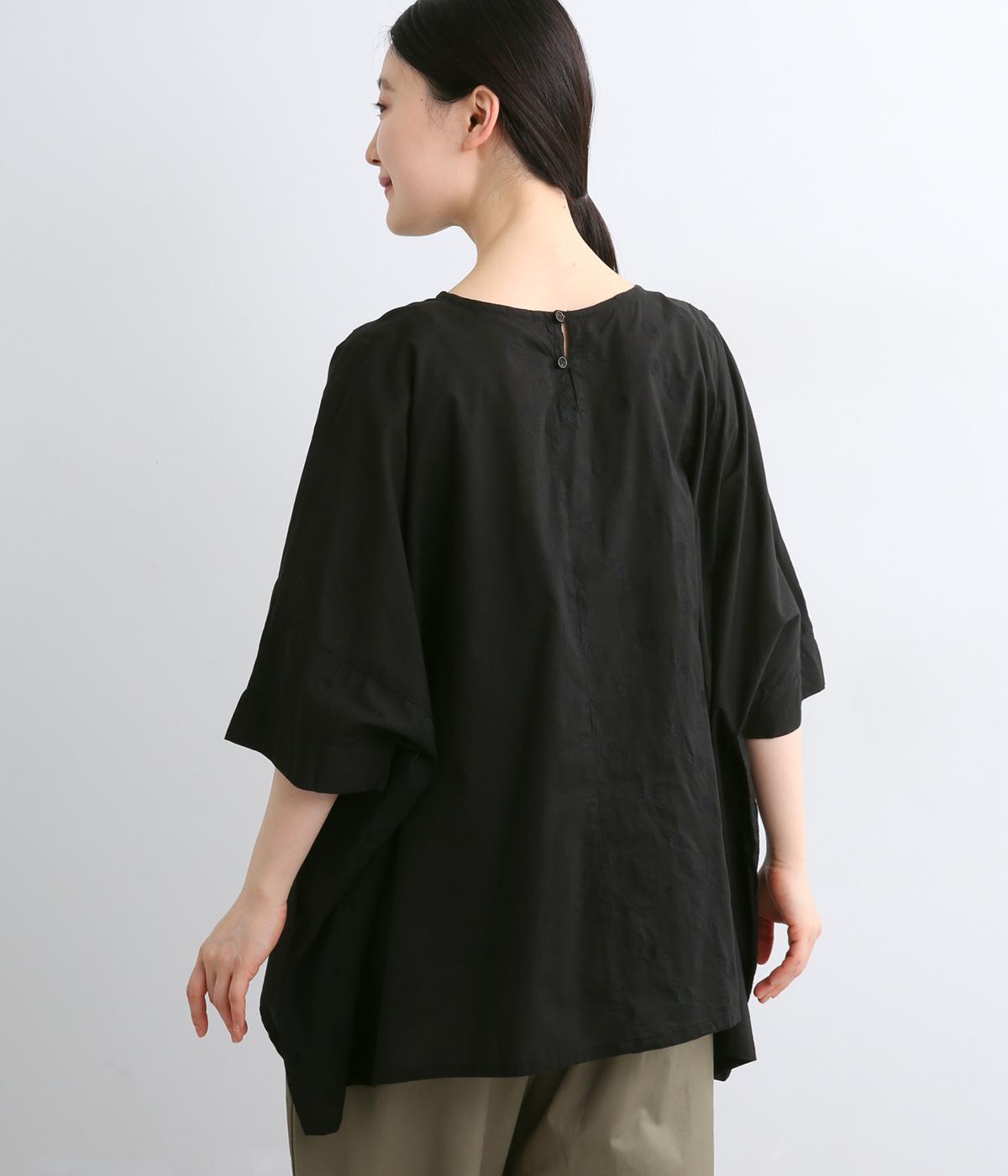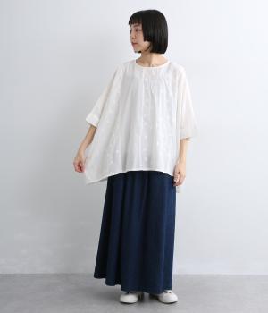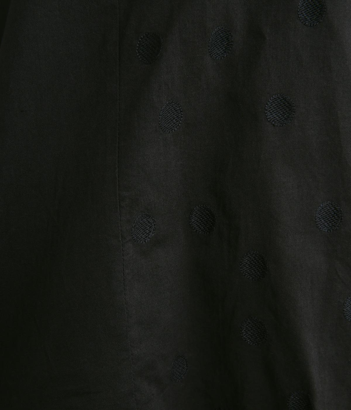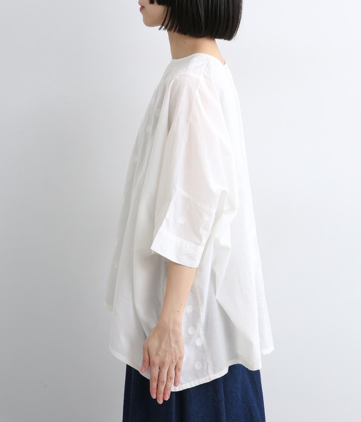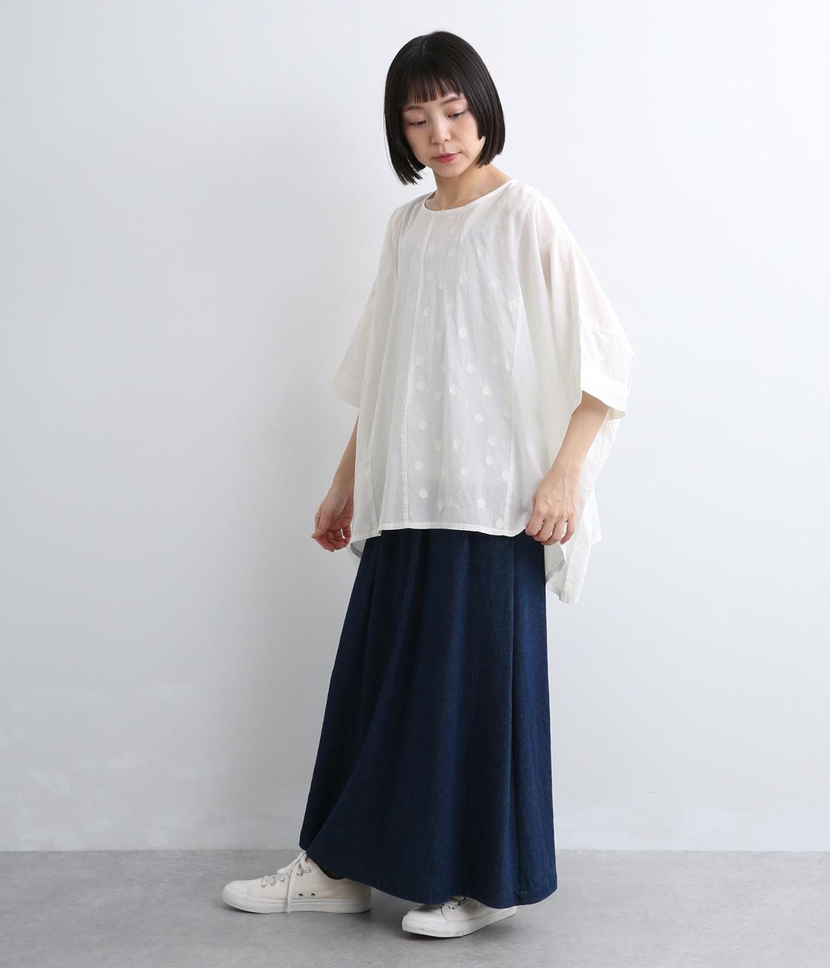 かわいらしさまとう大きめなドット刺しゅう。無地とバランスよく切り替えることで、甘すぎない大人の雰囲気に仕上がりました。軽やかな素材感を生かしたゆったりシルエットは、動きに合わせて優雅に揺れ、女性らしい表情を添えます。