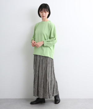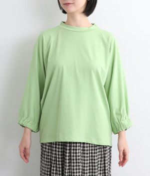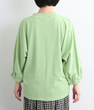 袖口はゴムを通してギャザーを入れた七分袖になっています。体のラインを拾わないゆったりとしたサイズ感に加えて、ボリューミーなドルマンスリーブでリラクシーに。襟は少し立ち上がりのある形で、さり気なく個性をプラスしました。