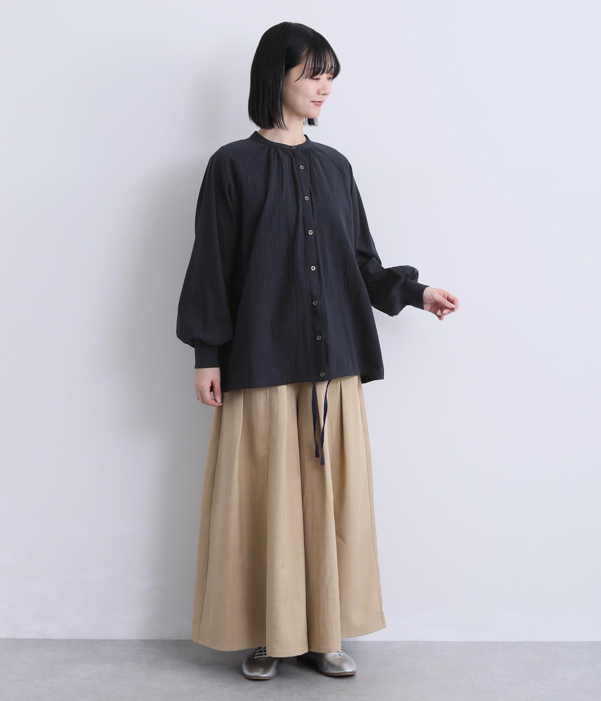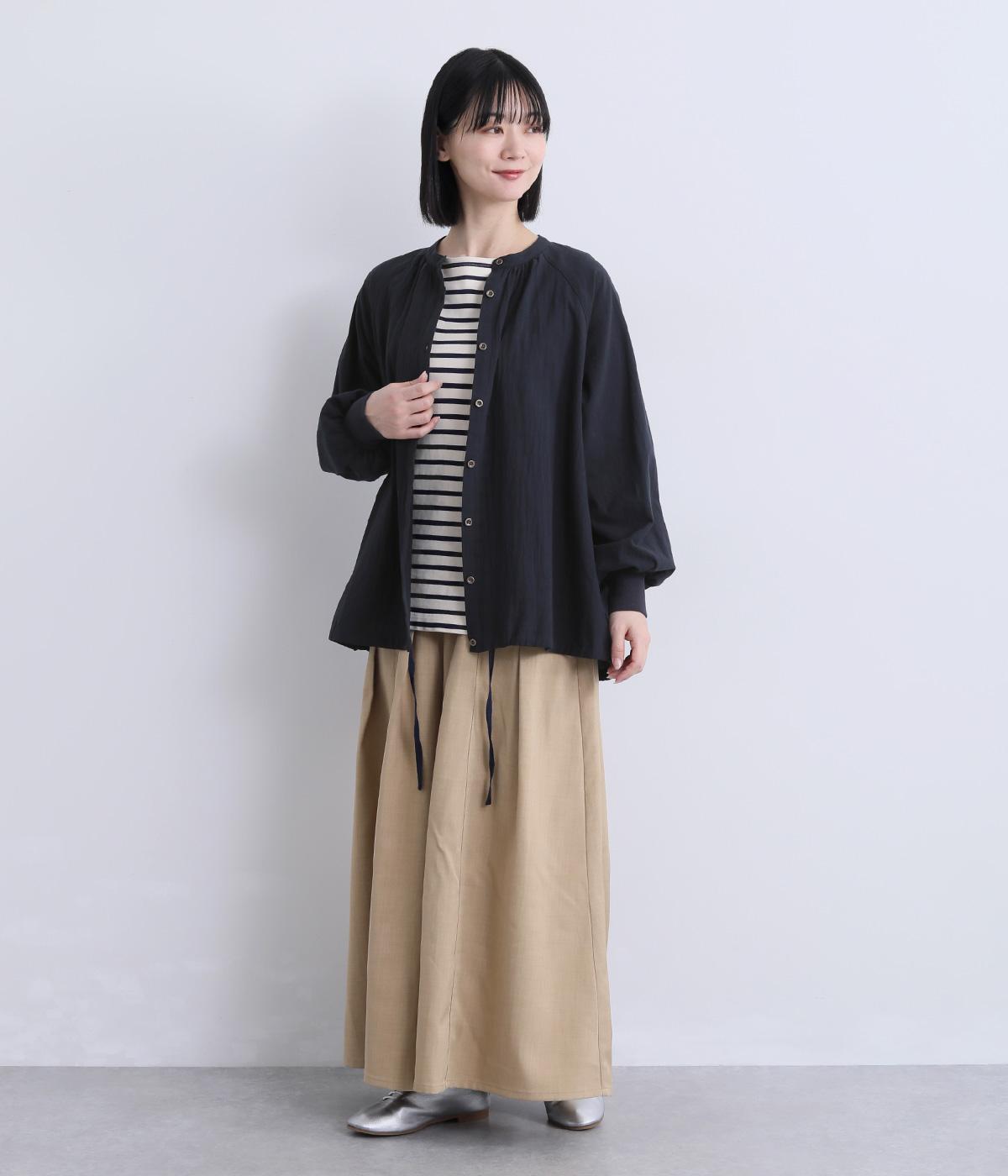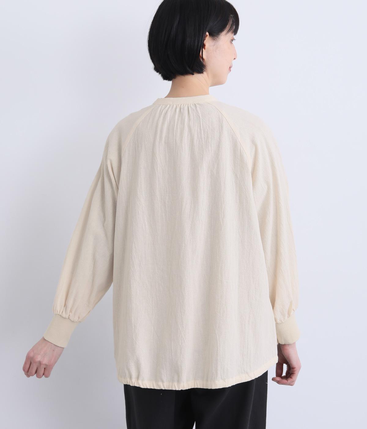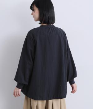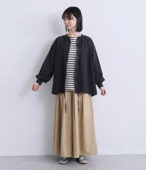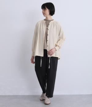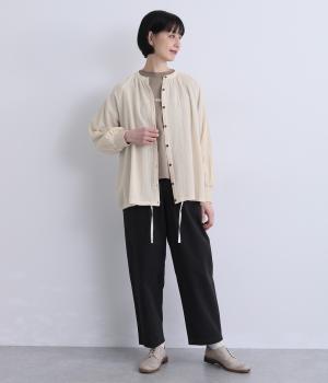 ナチュラル素材にラグラン袖でラフに羽織りやすいカーディガンを仕立てました。袖口はリブに切り替えているのですっきりとまとまり、手仕事時のたくし上げもイージー。裾の紐をしぼることでシルエットのアレンジも可能。