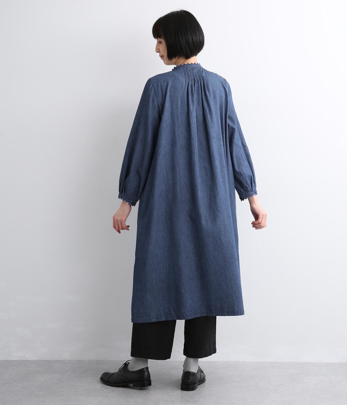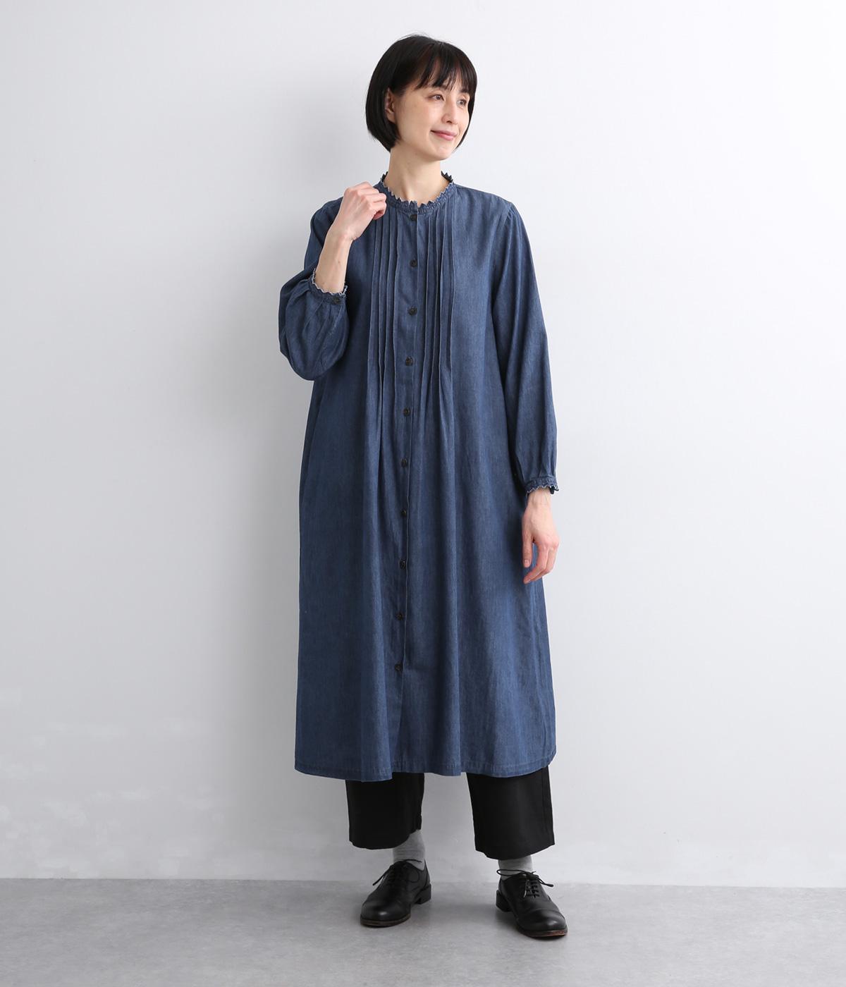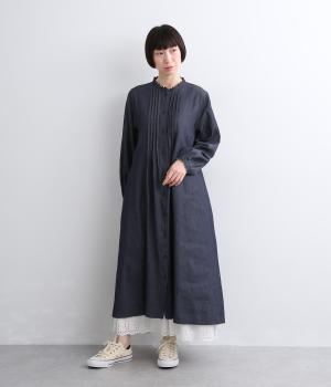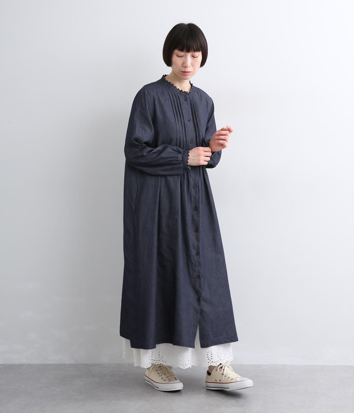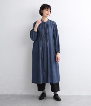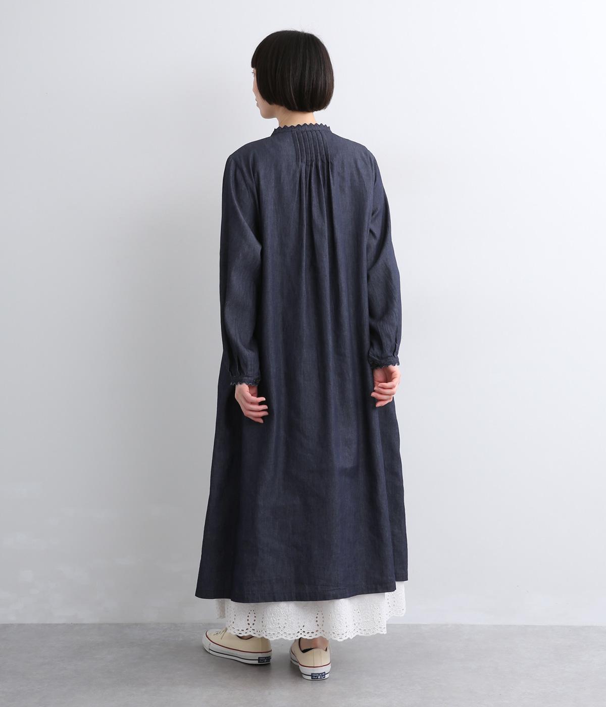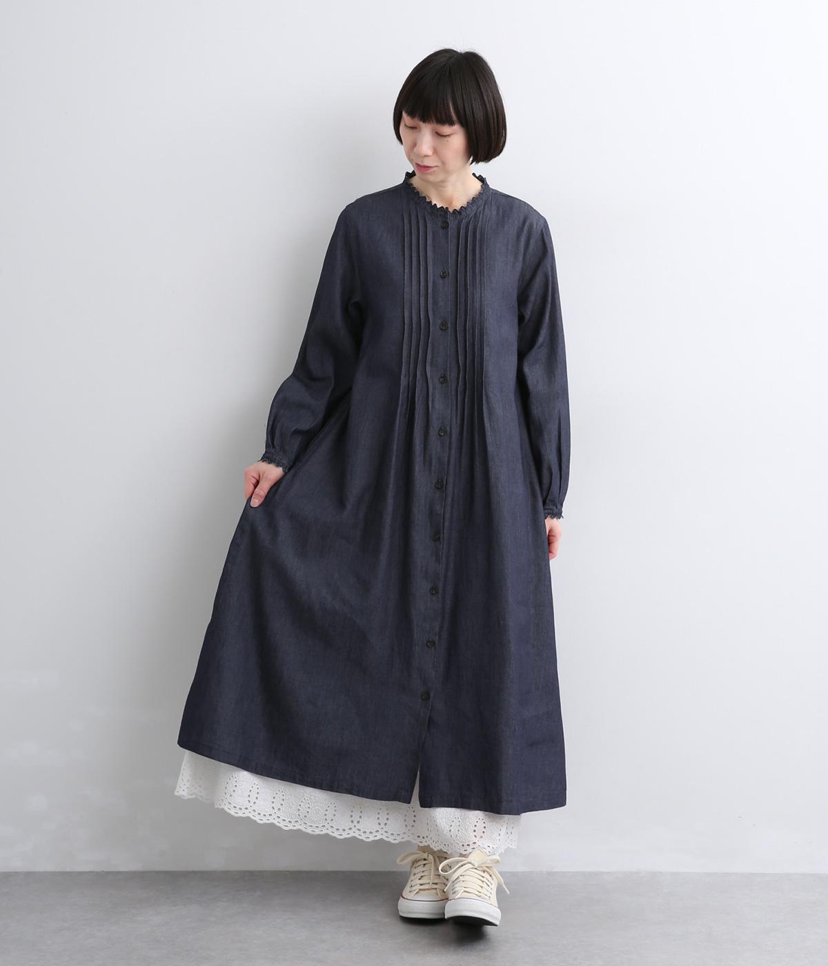 首元のスカラ刺しゅうが、顔まわりにさりげない華やかさを添えるワンピースです。フロントのピンタックはシルエットに立体感を出すと同時に、すっきり見せする効果も。前を開けて、さらっと羽織るのもおすすめです。