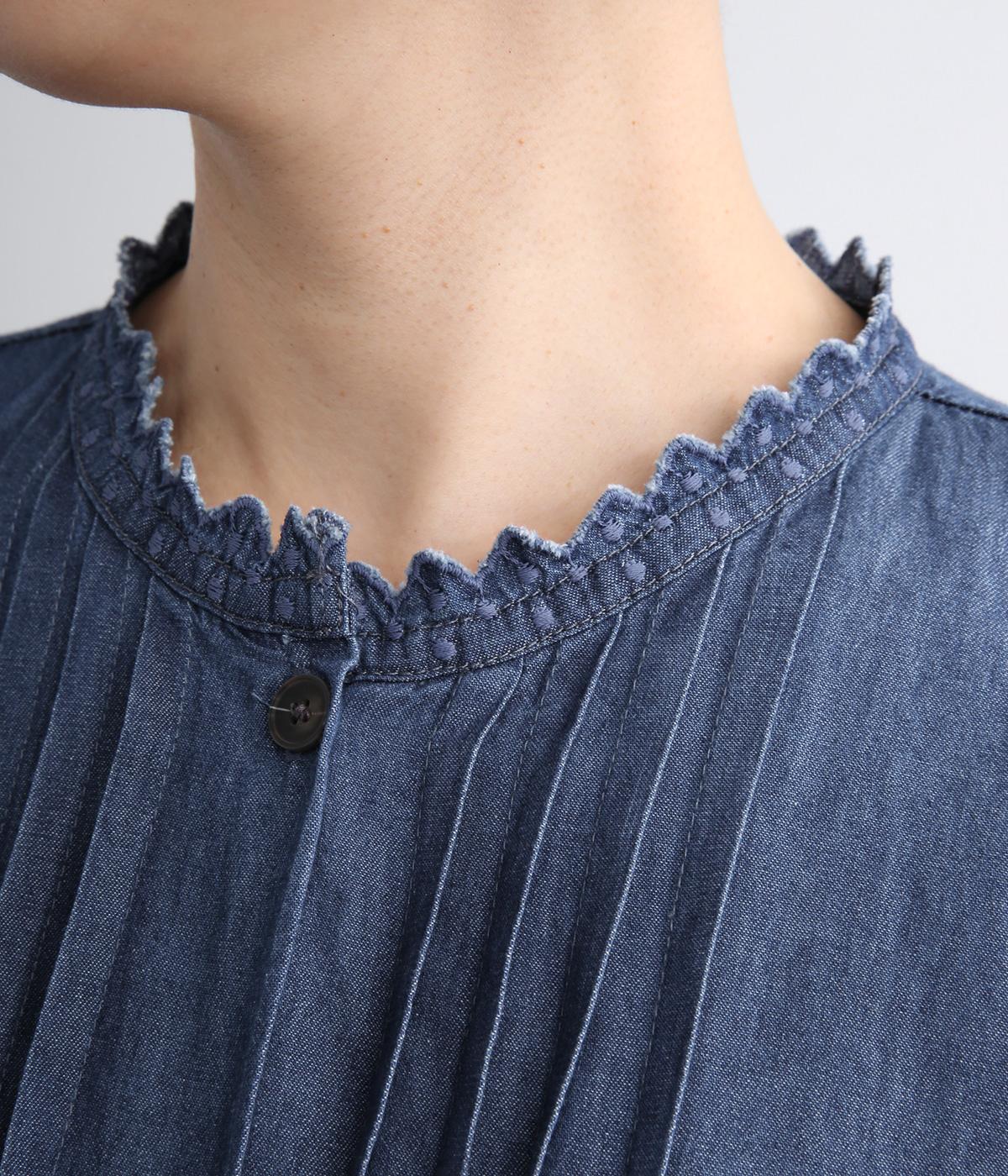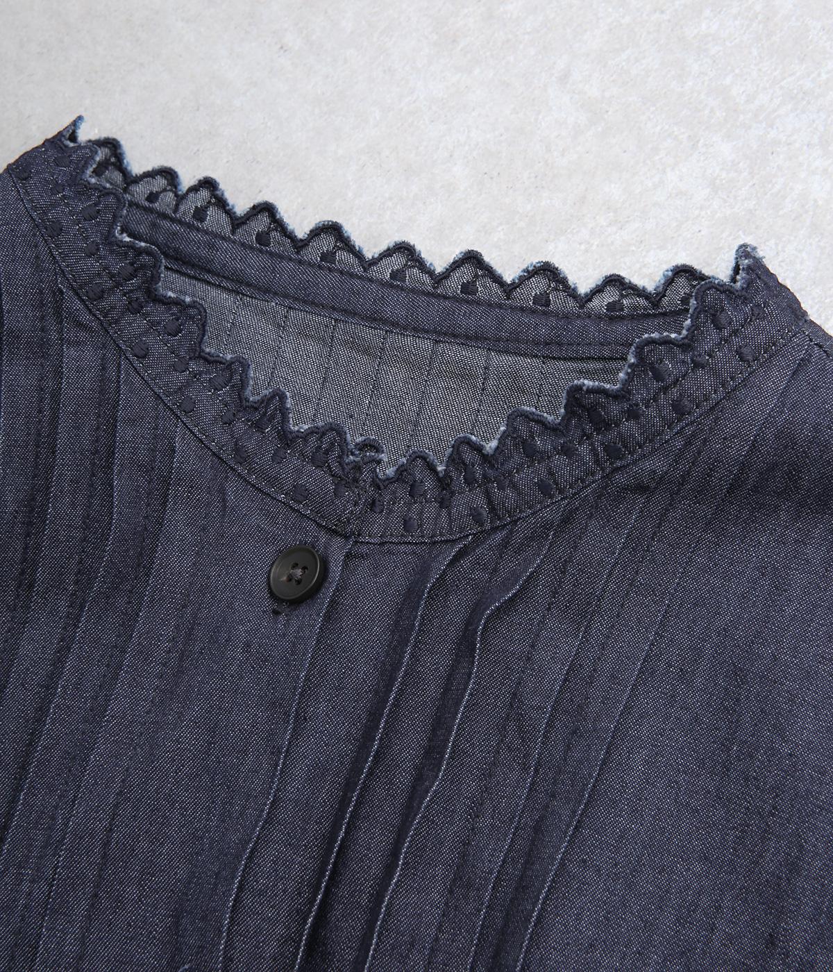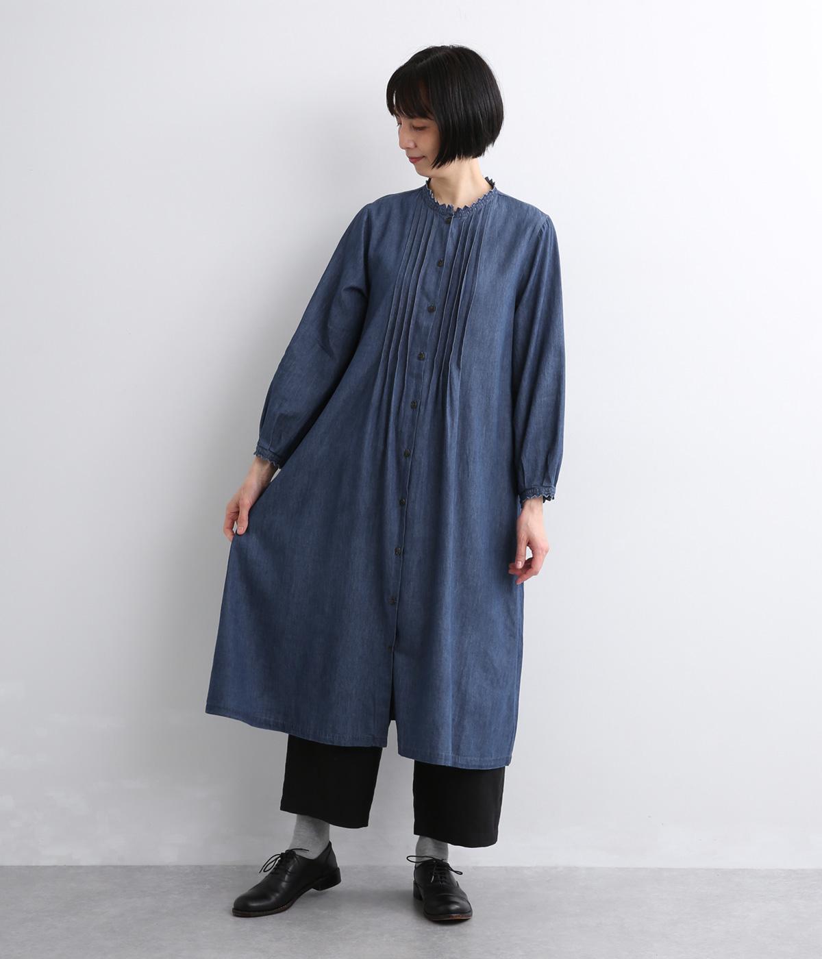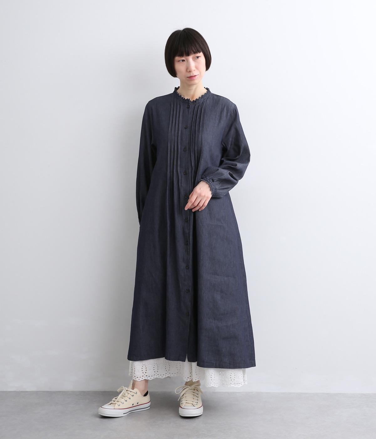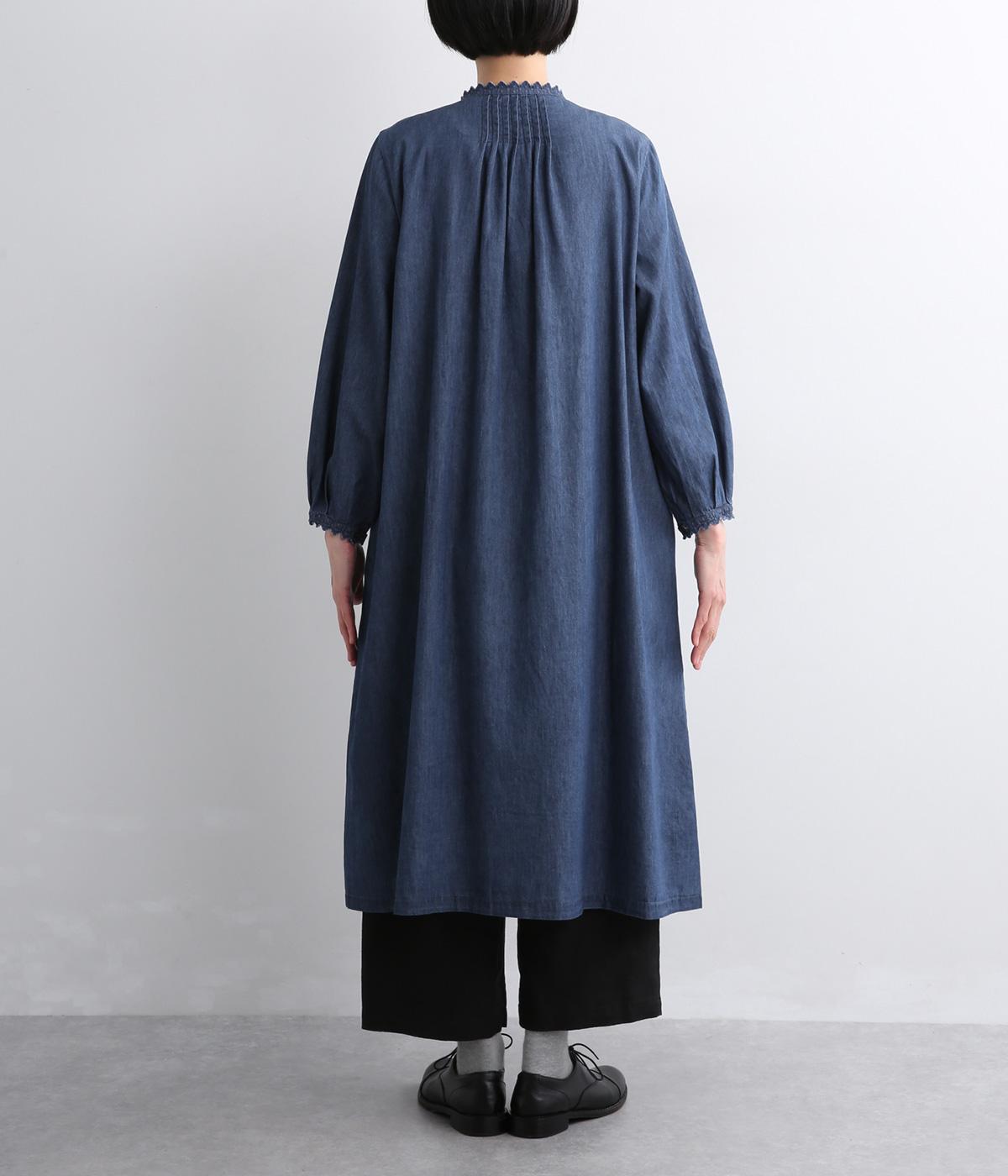 首元のスカラ刺しゅうが、顔まわりにさりげない華やかさを添えるワンピースです。フロントのピンタックはシルエットに立体感を出すと同時に、すっきり見せする効果も。前を開けて、さらっと羽織るのもおすすめです。