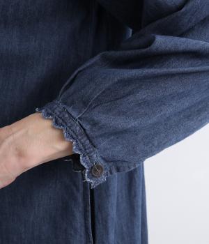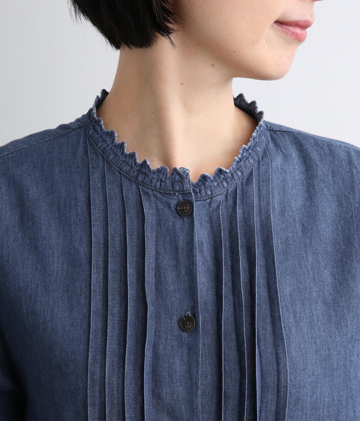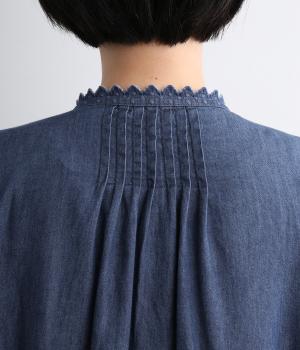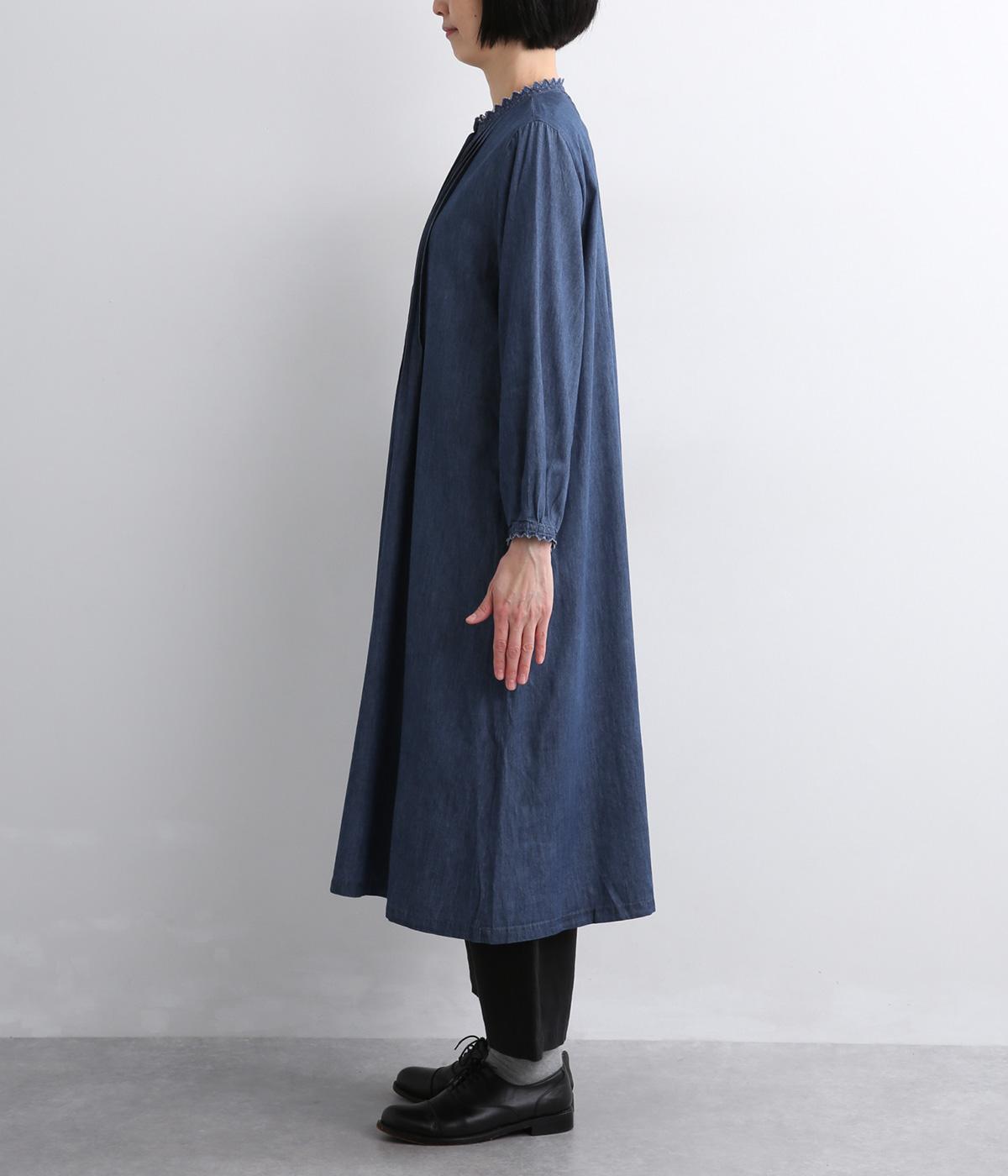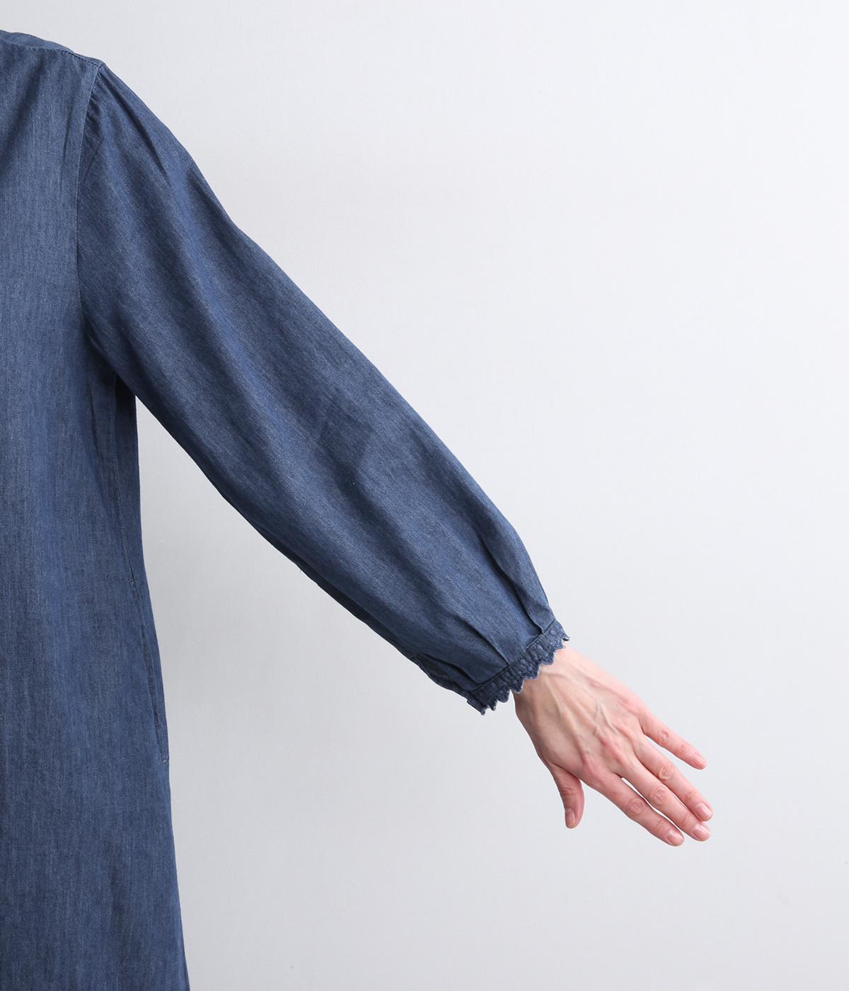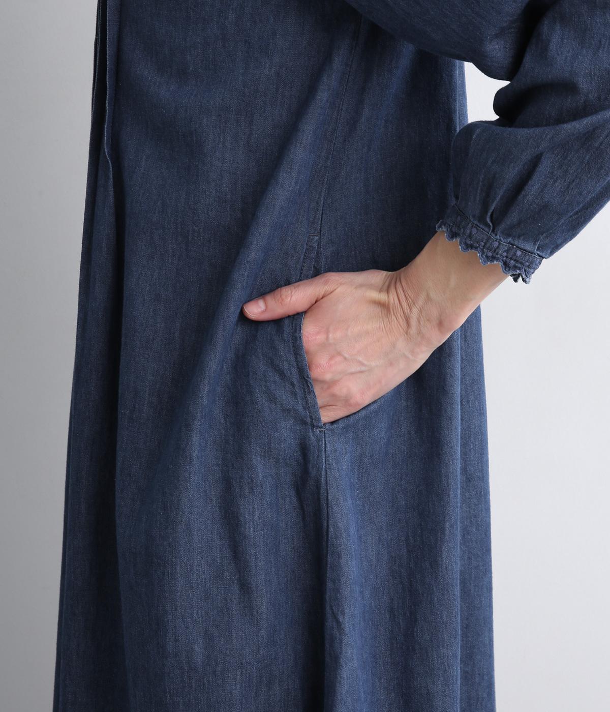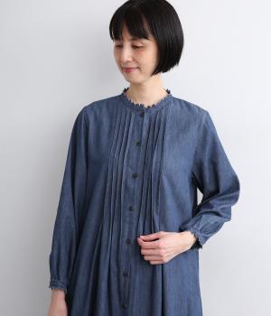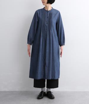 首元のスカラ刺しゅうが、顔まわりにさりげない華やかさを添えるワンピースです。フロントのピンタックはシルエットに立体感を出すと同時に、すっきり見せする効果も。前を開けて、さらっと羽織るのもおすすめです。