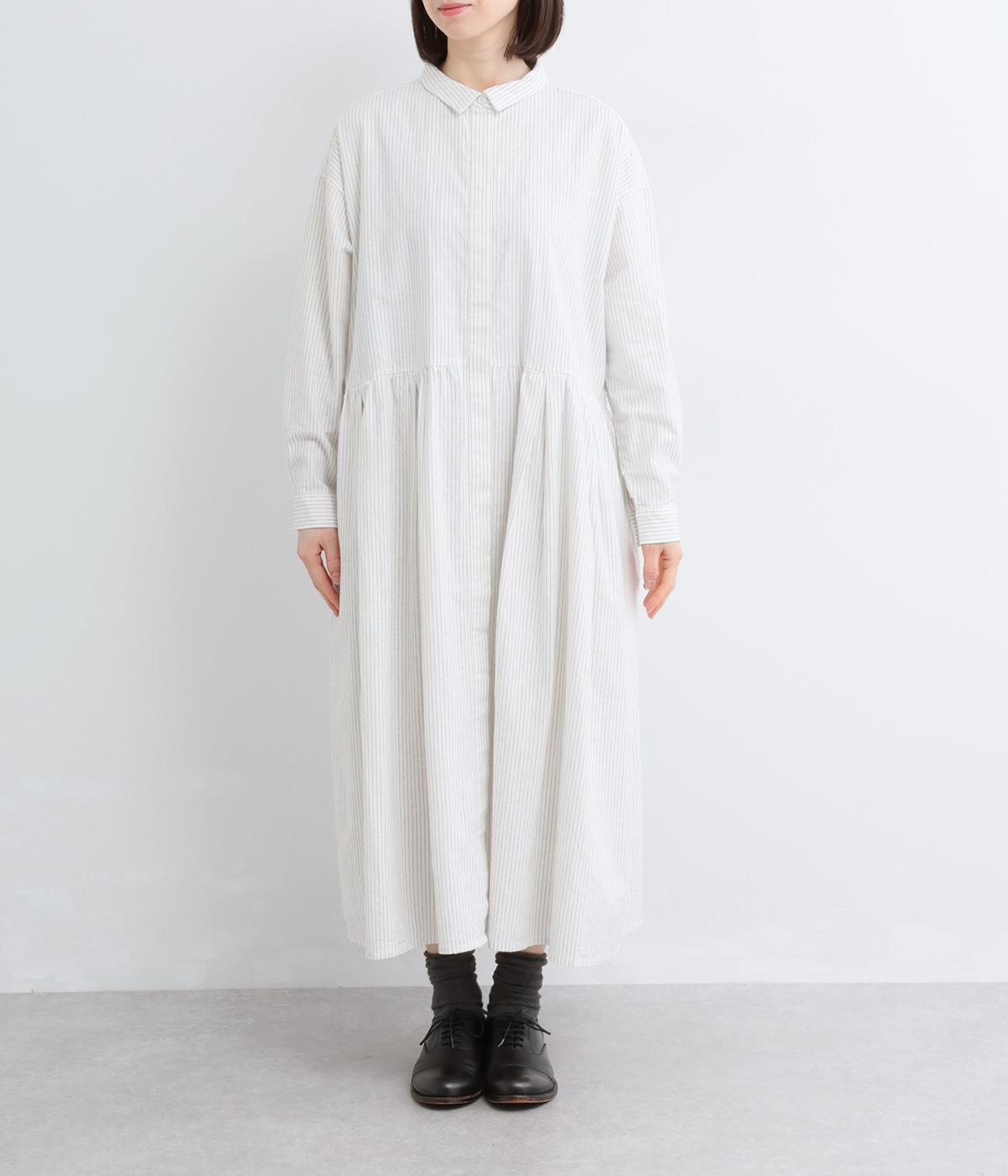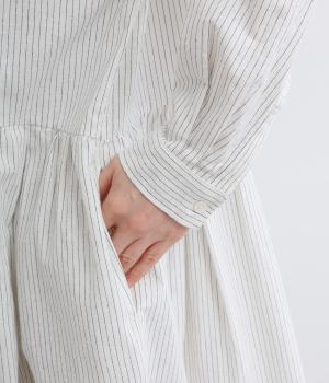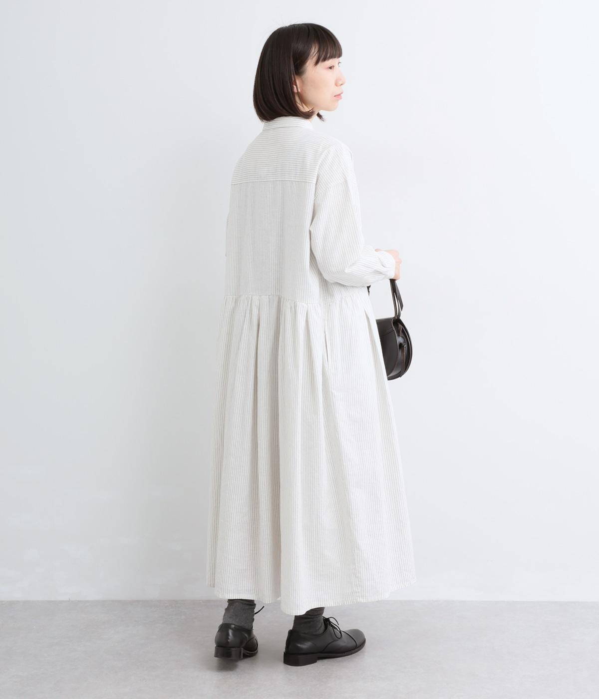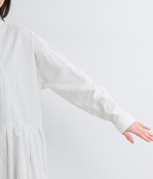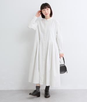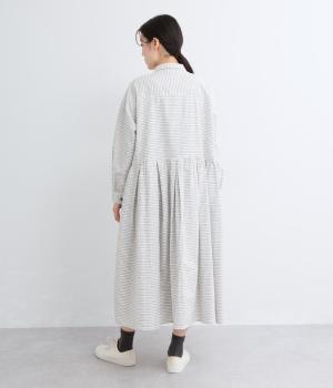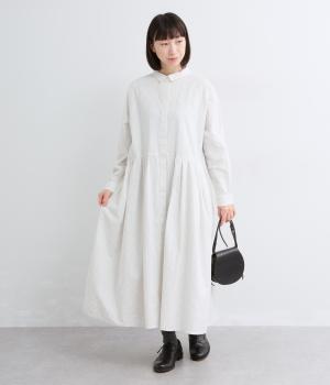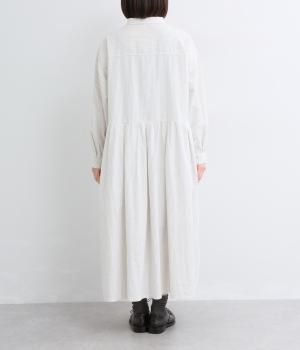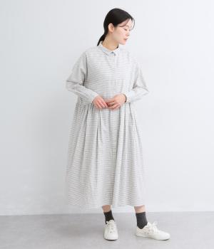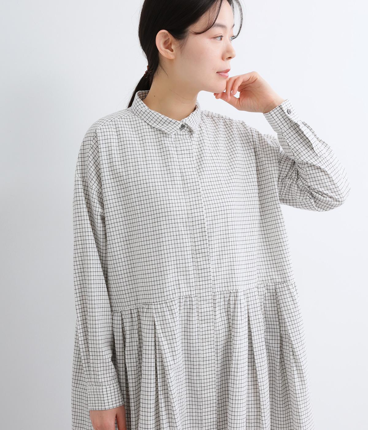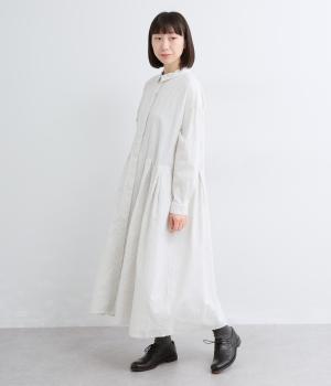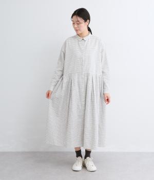 ウエスト切り替えにタックを入れてゆったりとしたフレアなワンピース。柄生地を邪魔しないすっきりとした比翼仕立てで、ガウンのように羽織ったレイヤードスタイルもおすすめ。先染め生地の風合いが気持ちよく、シンプルながらも着映えします。