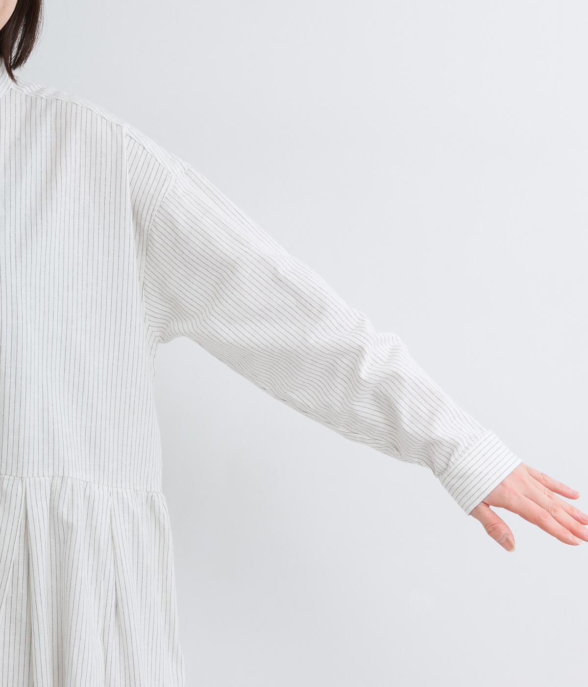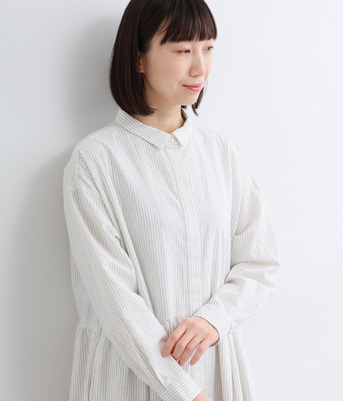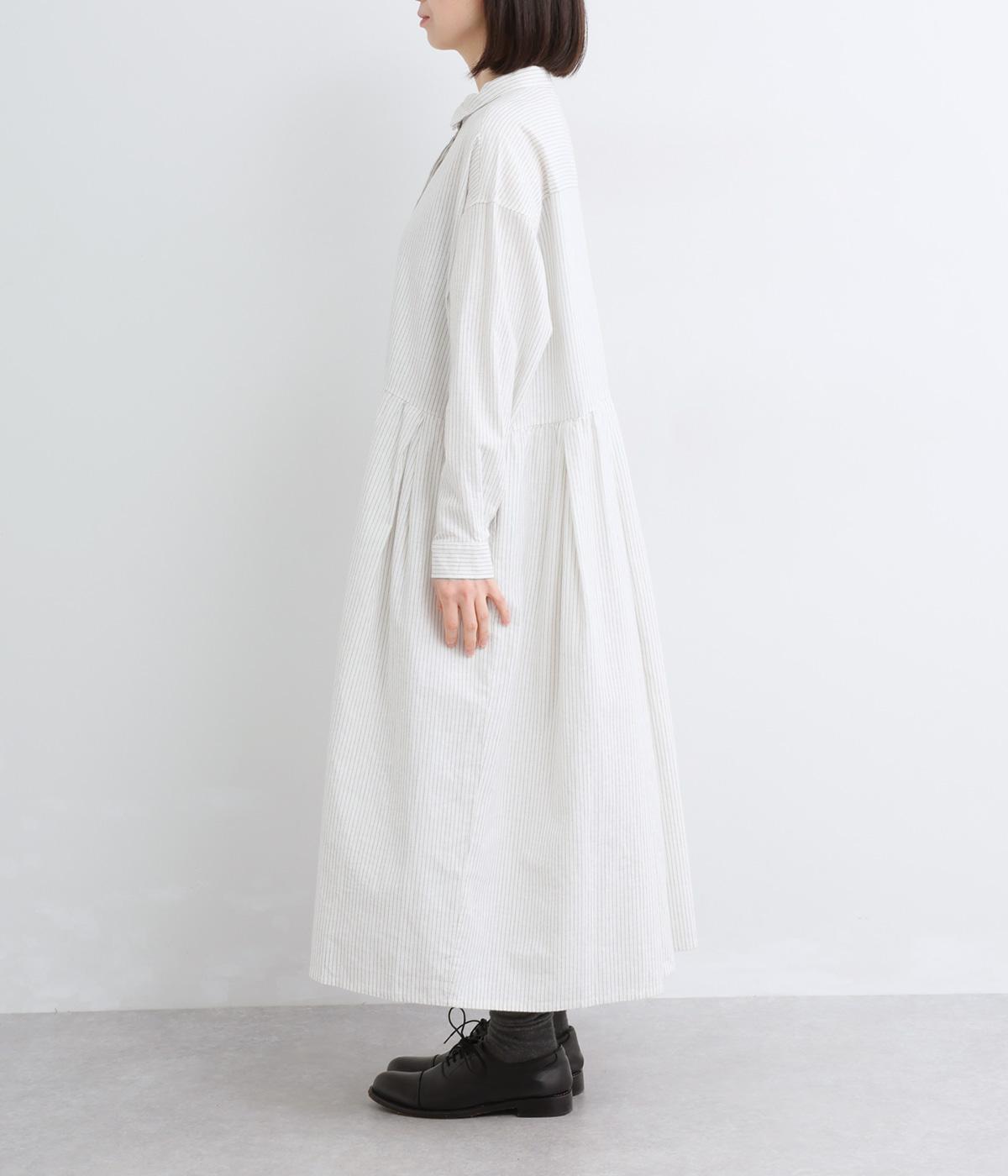 ウエスト切り替えにタックを入れてゆったりとしたフレアなワンピース。柄生地を邪魔しないすっきりとした比翼仕立てで、ガウンのように羽織ったレイヤードスタイルもおすすめ。先染め生地の風合いが気持ちよく、シンプルながらも着映えします。