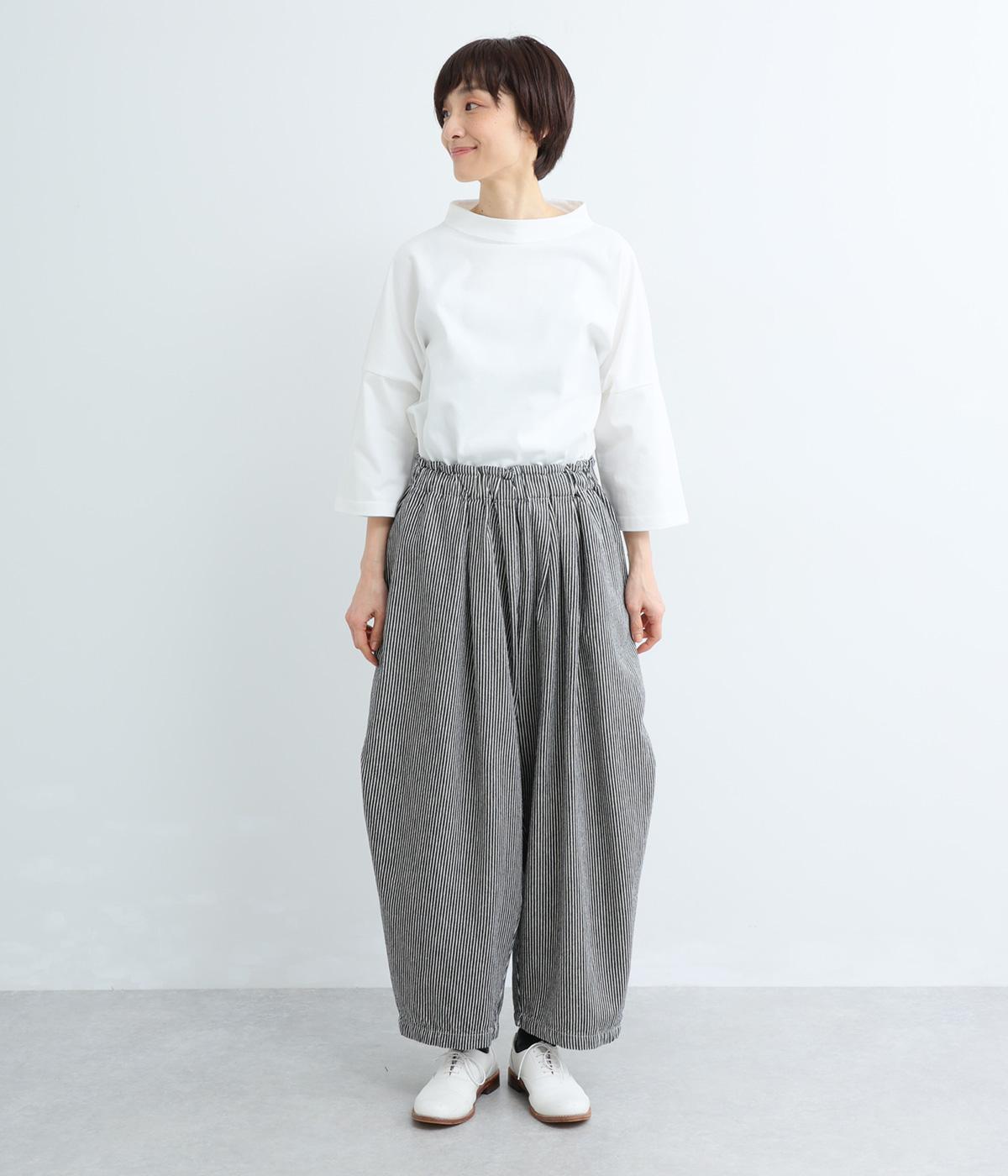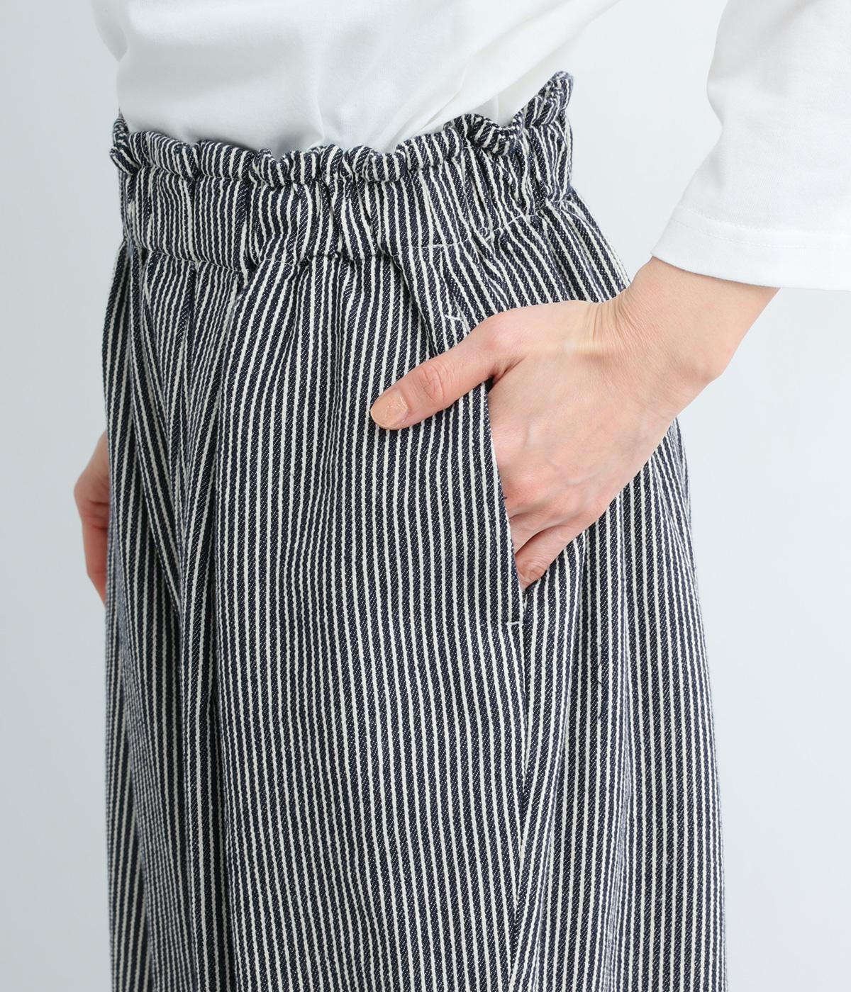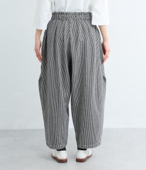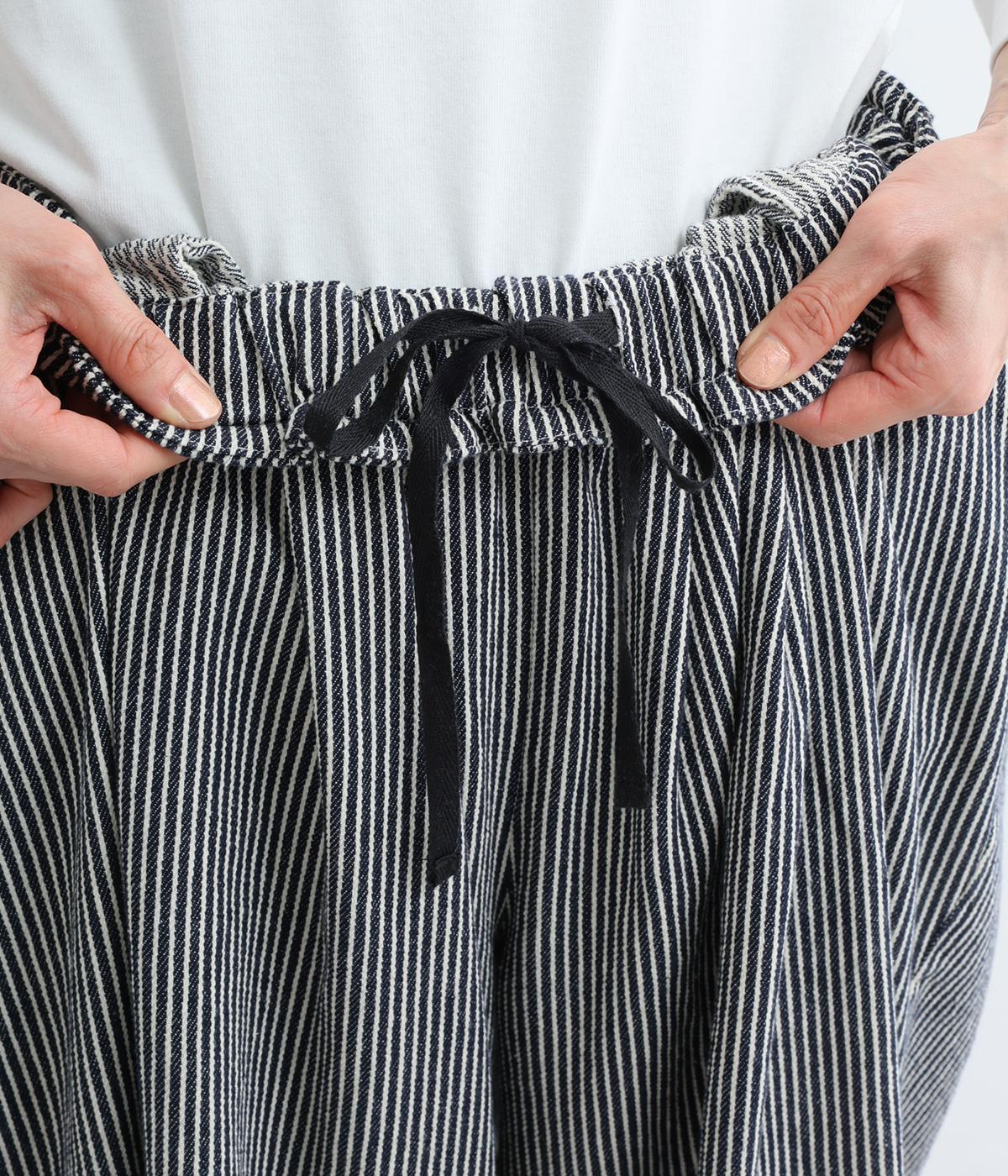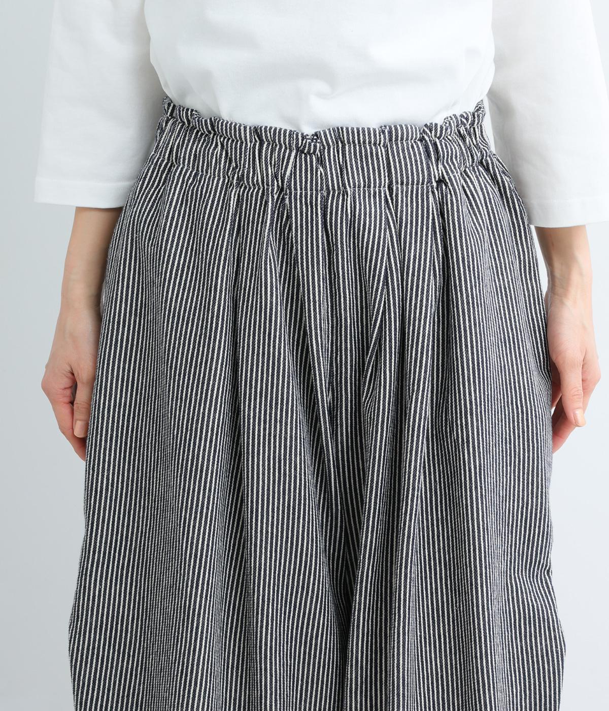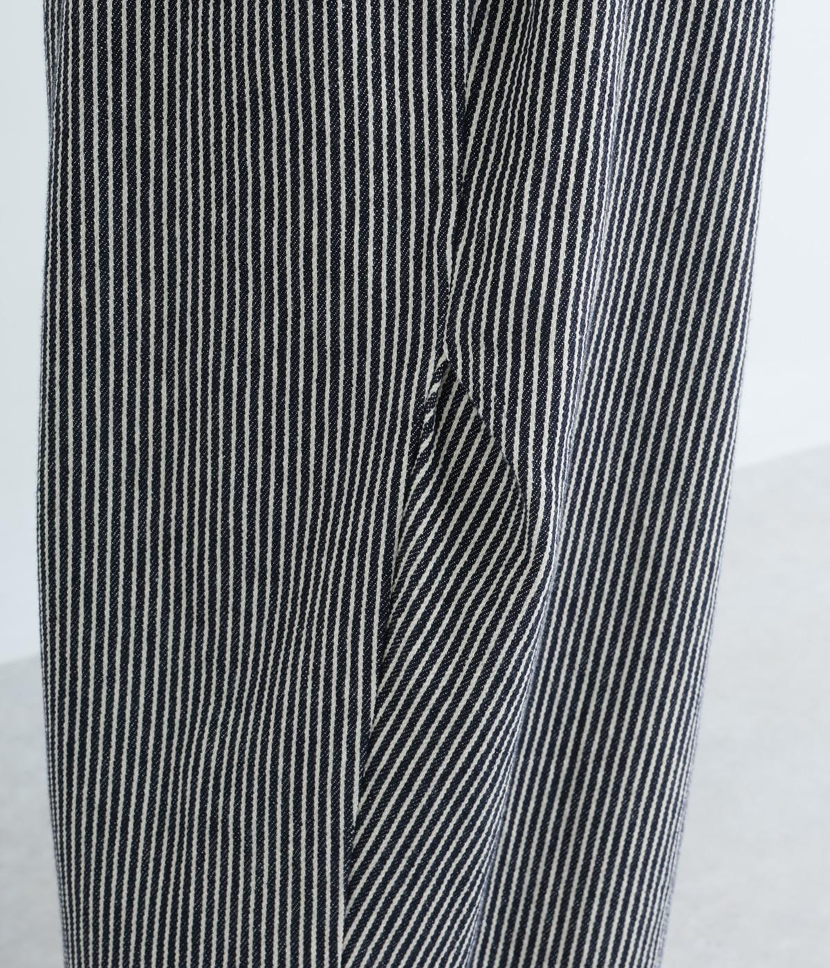 ヒッコリーストライプの爽やかな表情が目を引くデザインです。ウエストにはタックを多めに入れ、ゆったりとしたはき心地に。裾に向かってやや絞ったバレルレッグのシルエットが、脚のラインをきれいに引き立て、バランスのよい着こなしを叶えます。