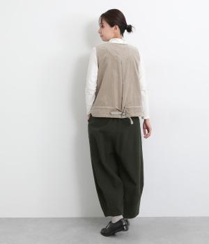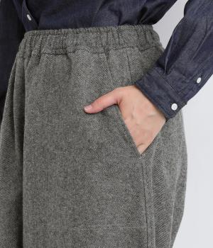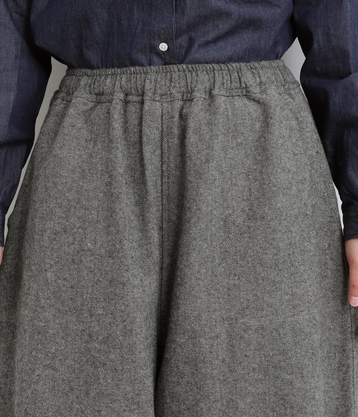 落ち着いた印象を醸し、大人のスタイルにすんなりなじむ、雰囲気のいい生地感を活かしたワイドパンツ。裾にダーツを入れて自然な立体感を持たせ、シンプルながらもお洒落な装いが完成。ウエストは総ゴム&内紐ではき心地も◎。