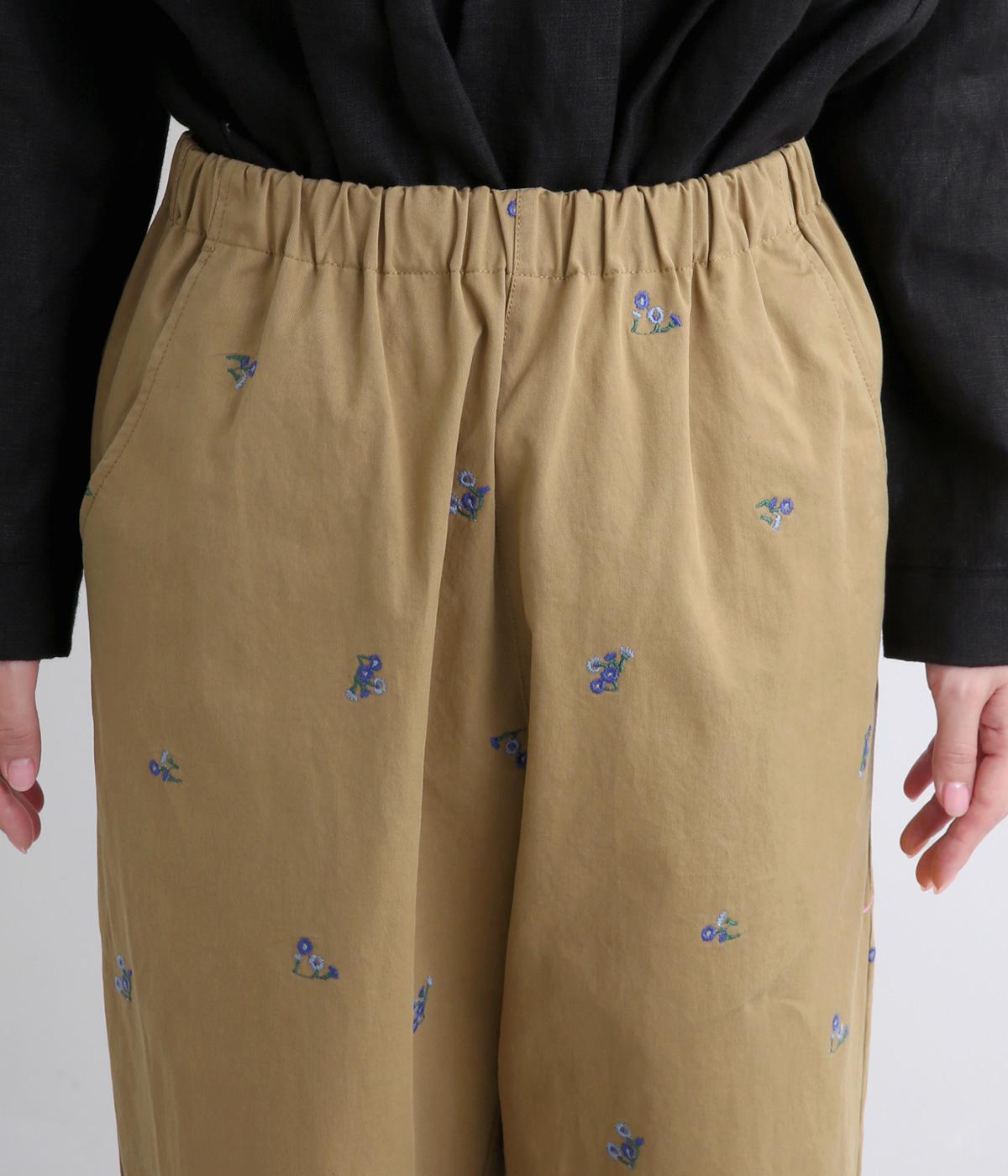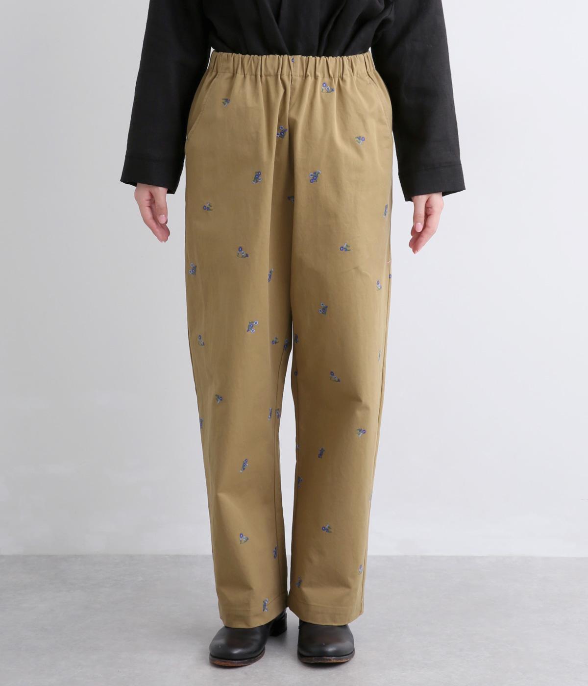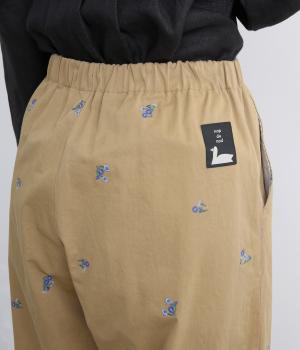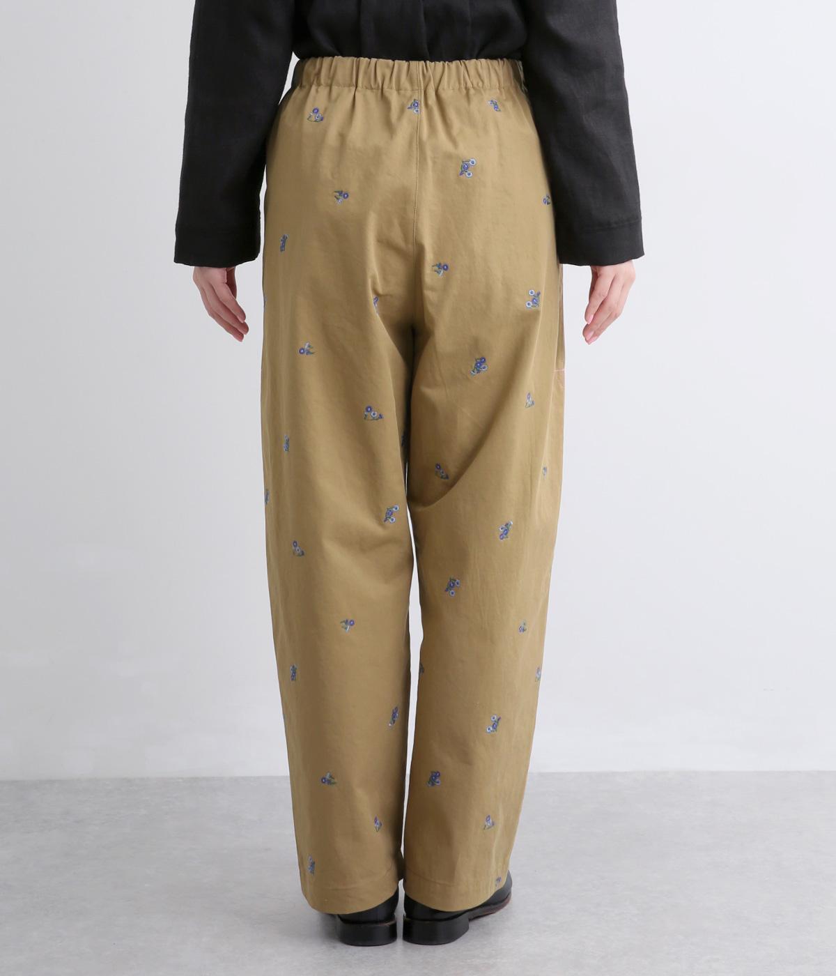 ワークテイストのストレートパンツに小さな花柄刺しゅうをあしらい、かわいらしさをミックスしました。うしろに配したスワンタグや、サイドにほどこした配色の三角ステッチがさりげないアクセントに。ウエストはゴム仕様で内紐によりサイズ調節が可能です。