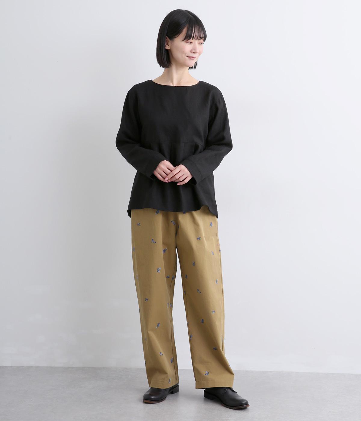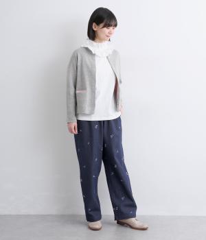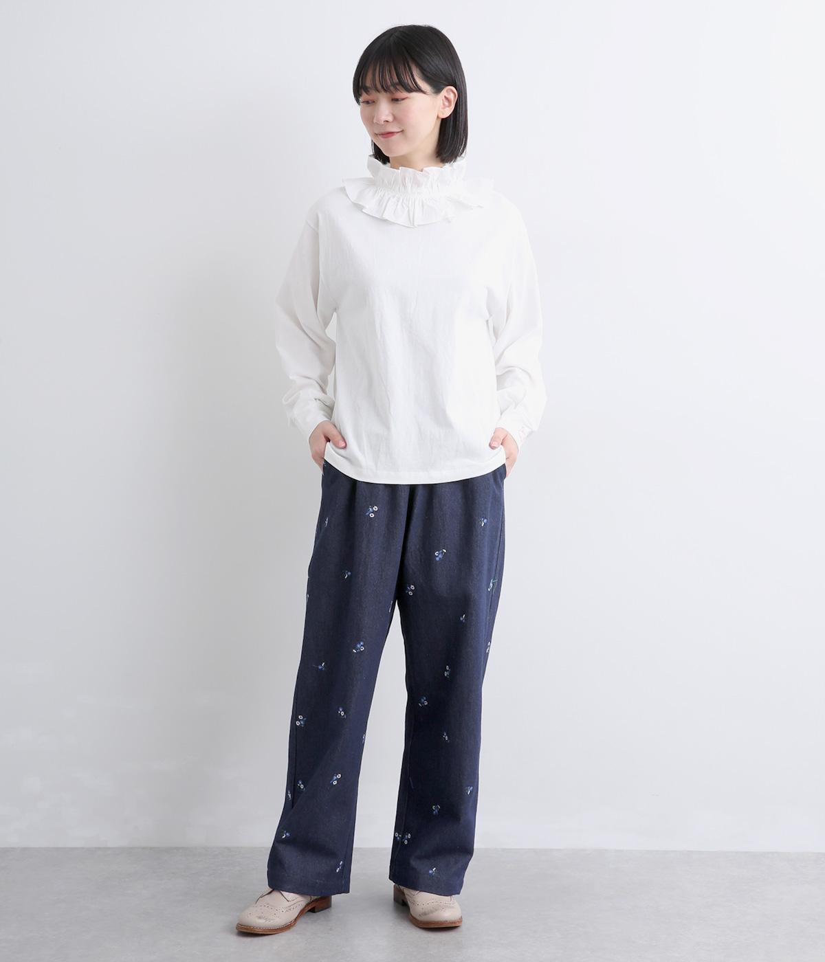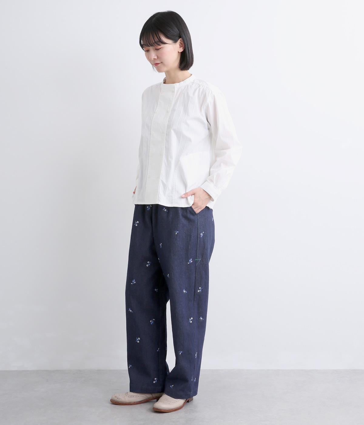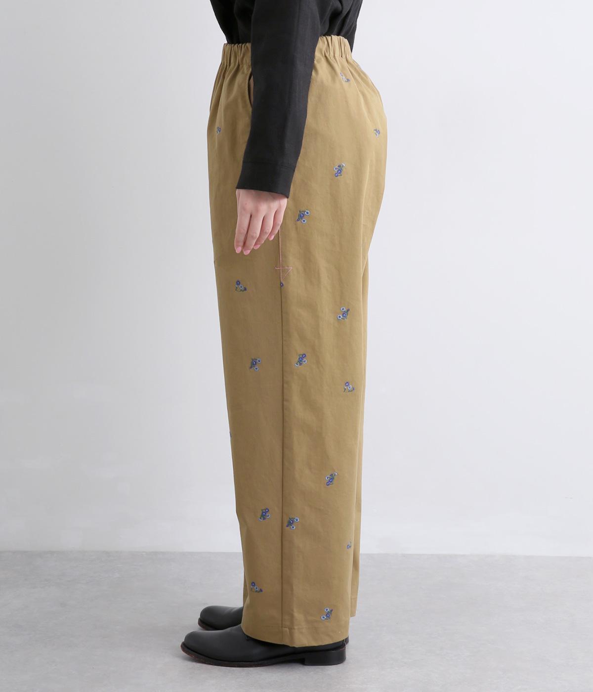 ワークテイストのストレートパンツに小さな花柄刺しゅうをあしらい、かわいらしさをミックスしました。うしろに配したスワンタグや、サイドにほどこした配色の三角ステッチがさりげないアクセントに。ウエストはゴム仕様で内紐によりサイズ調節が可能です。