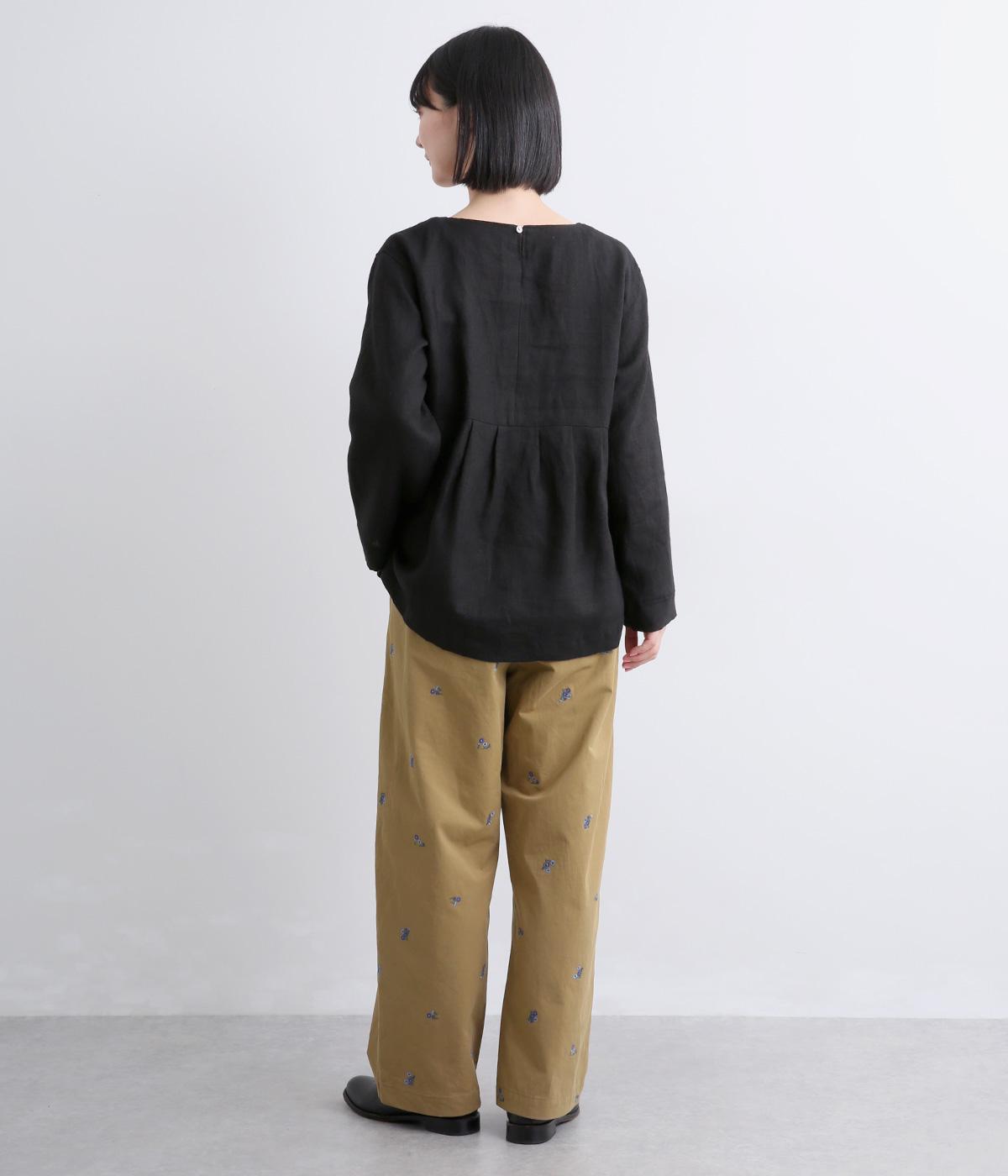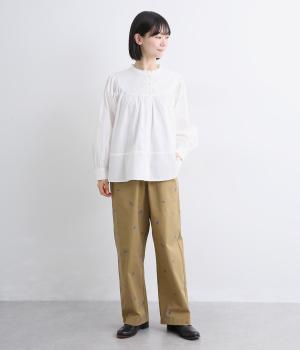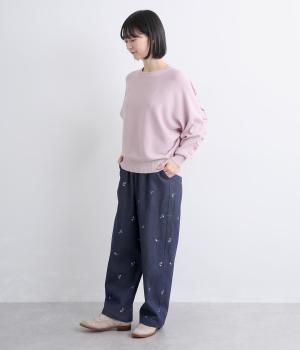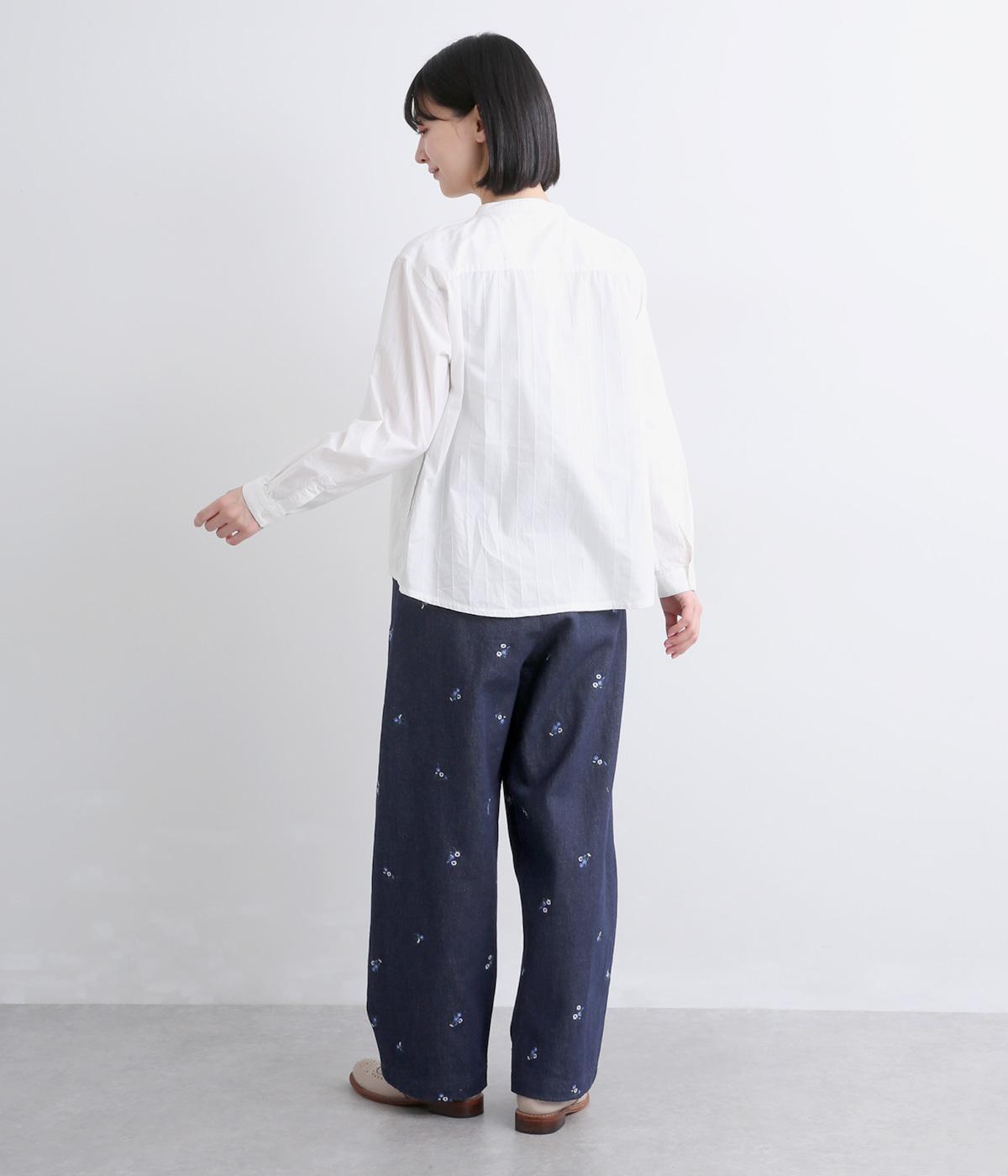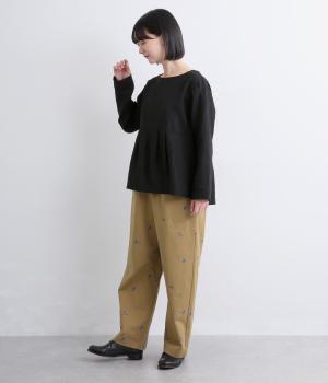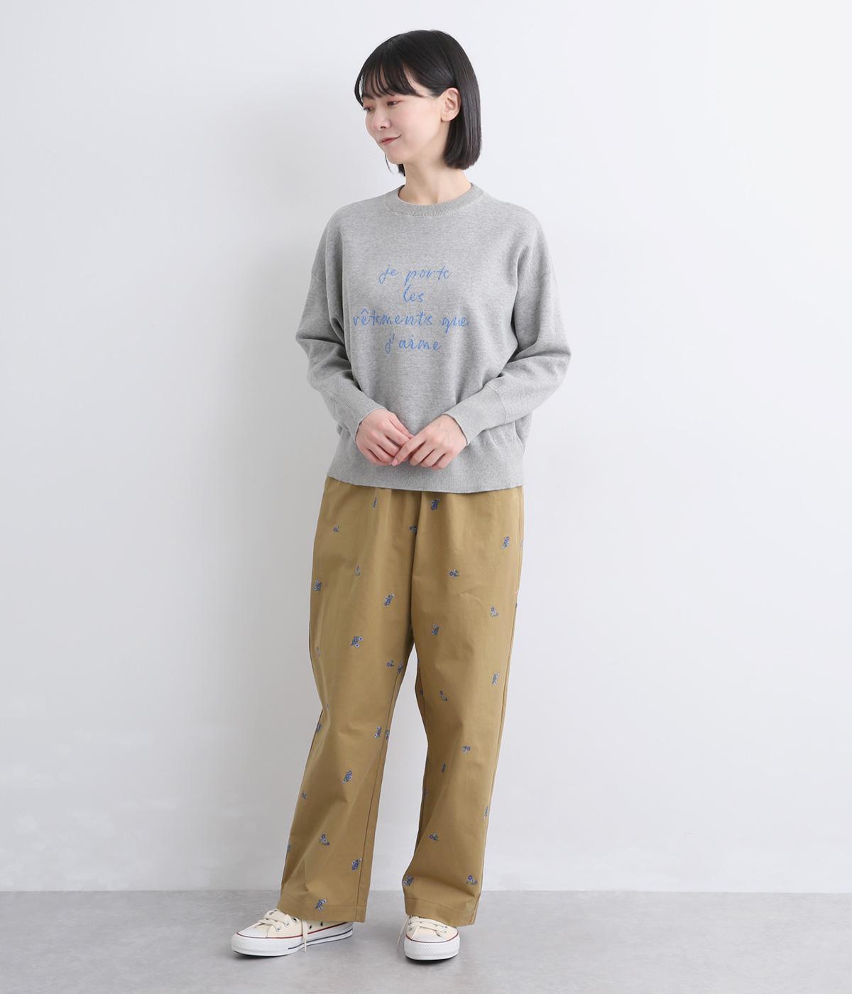ワークテイストのストレートパンツに小さな花柄刺しゅうをあしらい、かわいらしさをミックスしました。うしろに配したスワンタグや、サイドにほどこした配色の三角ステッチがさりげないアクセントに。ウエストはゴム仕様で内紐によりサイズ調節が可能です。