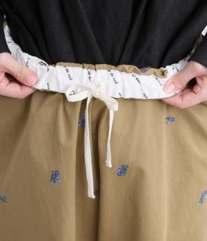 ベージュは高密度ながら軽やかなコットンツイルで、インディゴはほどよいハリのコットンリネンで仕立てました。ウエストの内側にはロゴのプリントをあしらった別布をあわせました。