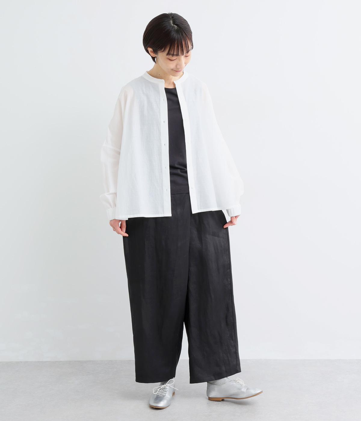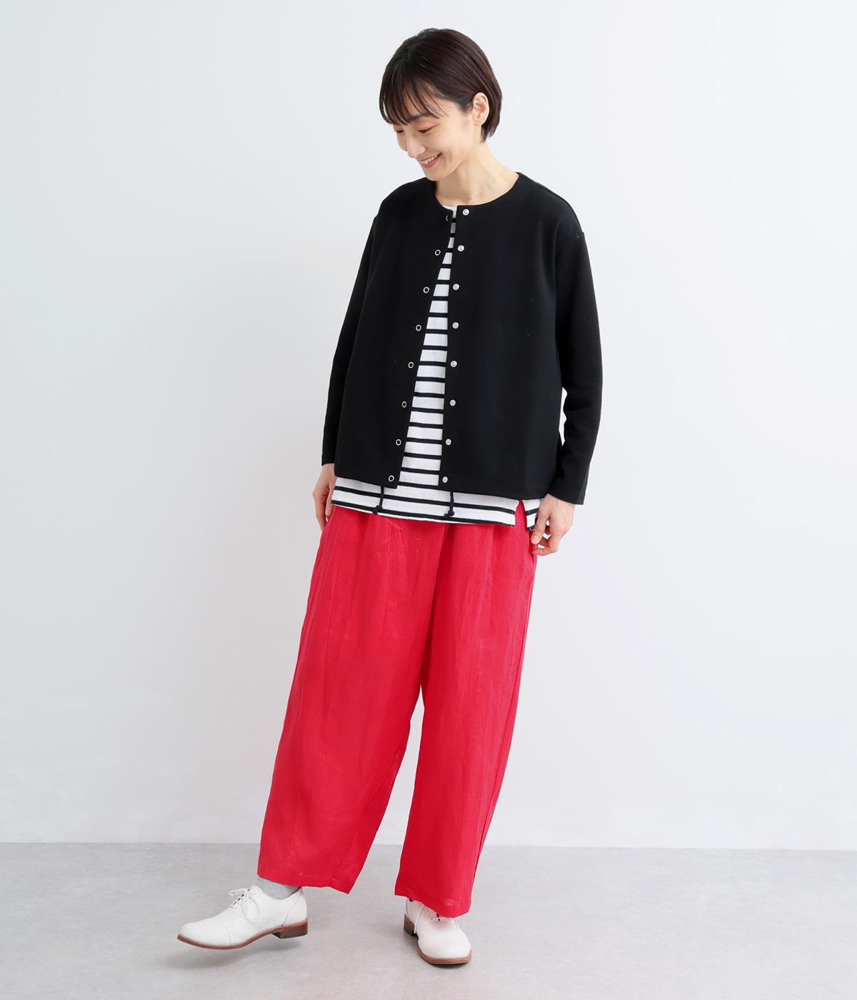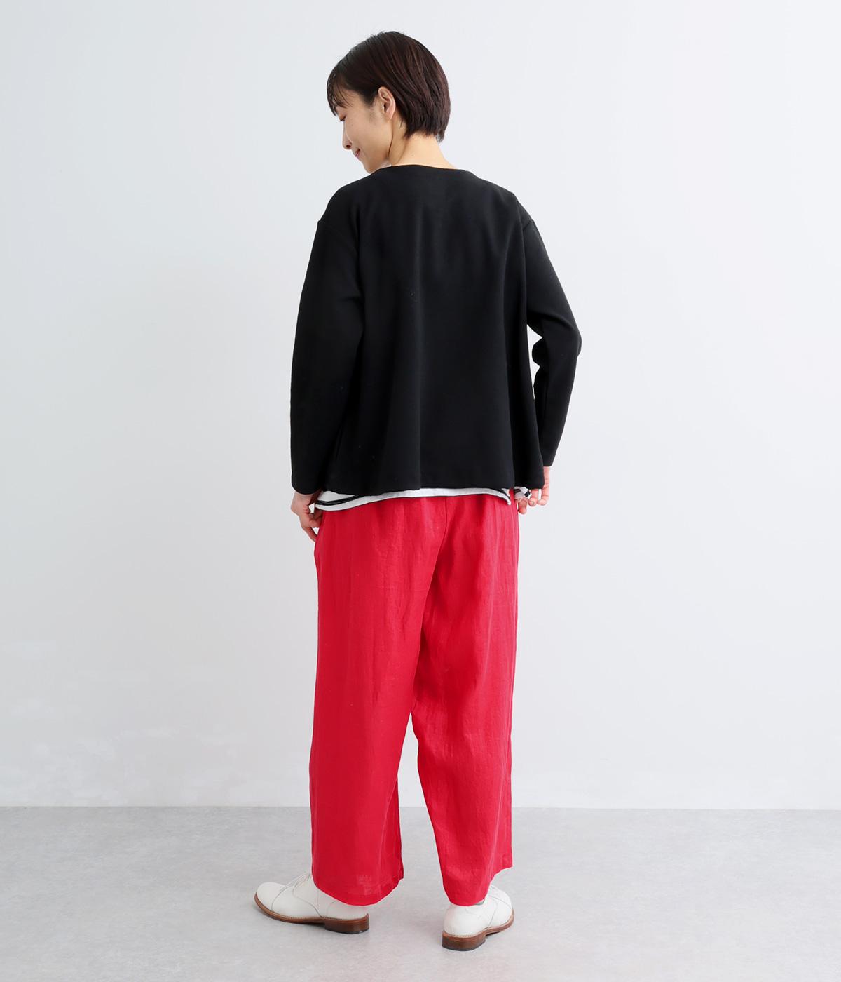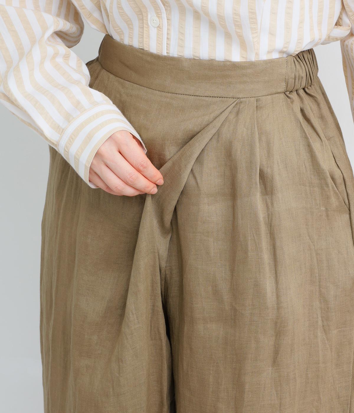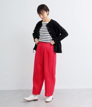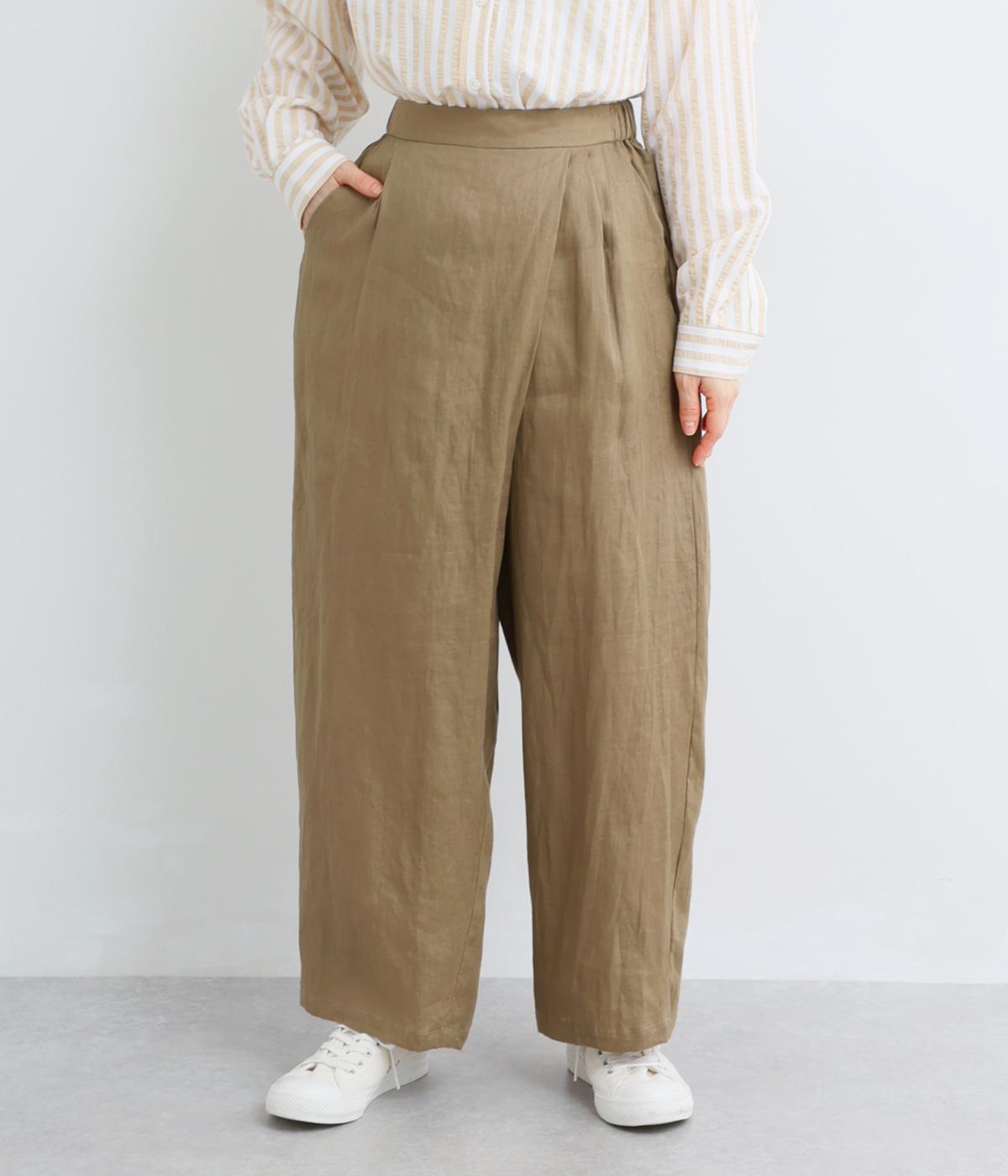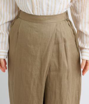 フロント部分を重ねたラップ風デザインが、お腹まわりをカバーしつつ、一癖あるシルエットを表現します。ゆるめのテーパードですっきりとした印象に。ウエストはうしろのみにゴムを配し、タックインスタイルもきれいに決まります。
