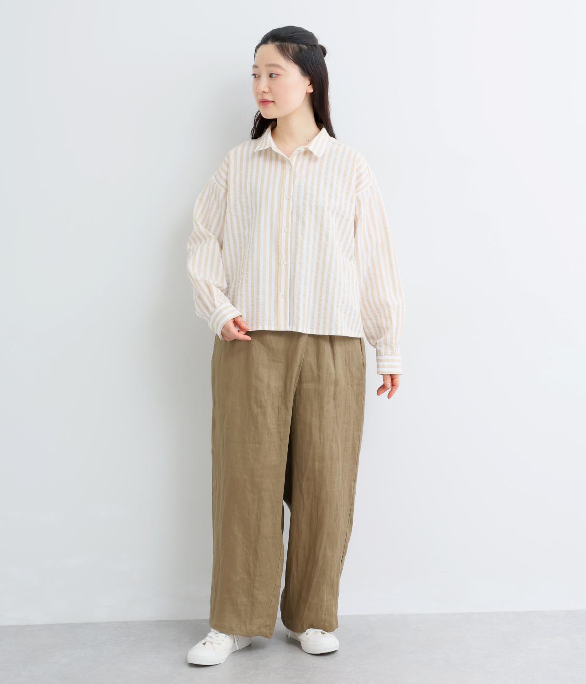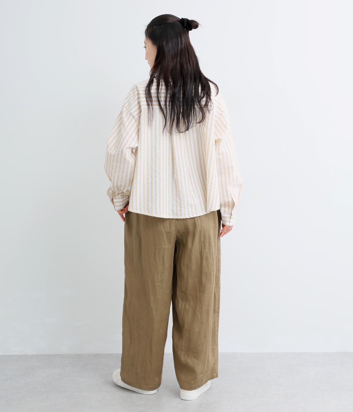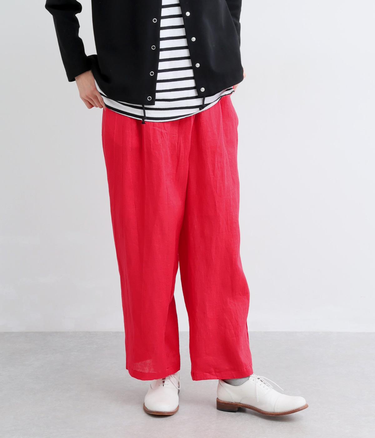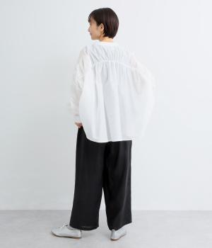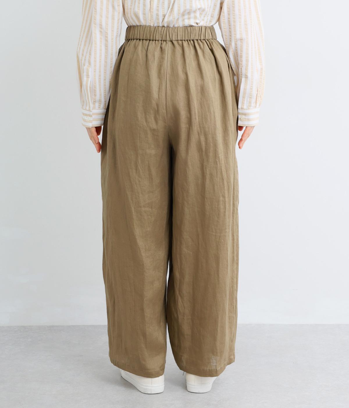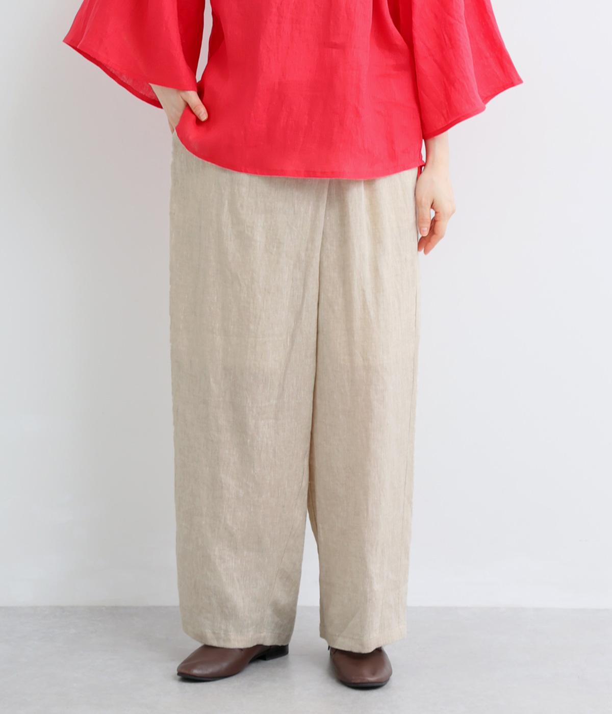 フロント部分を重ねたラップ風デザインが、お腹まわりをカバーしつつ、一癖あるシルエットを表現します。ゆるめのテーパードですっきりとした印象に。ウエストはうしろのみにゴムを配し、タックインスタイルもきれいに決まります。