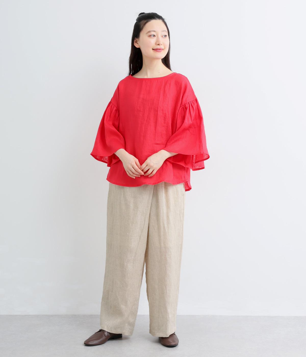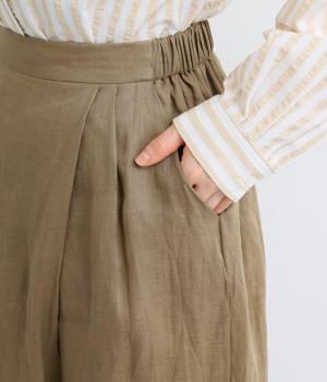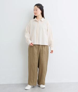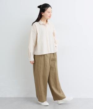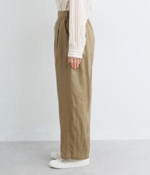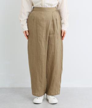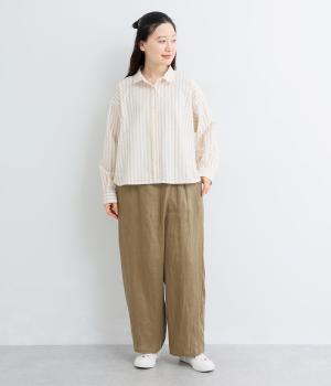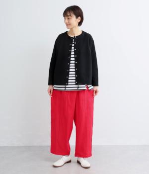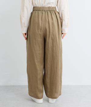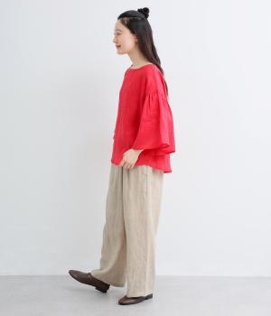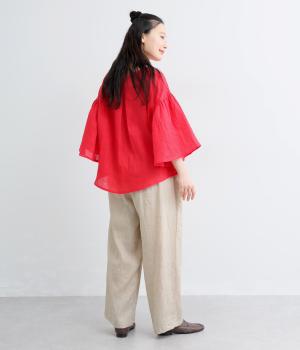 適度な厚みの軽やかなリネン生地です。ごわつき感の少ないやわらかな肌ざわりで上品な光沢があります。全色コットンの裏地付きで安心して着ていただけます。