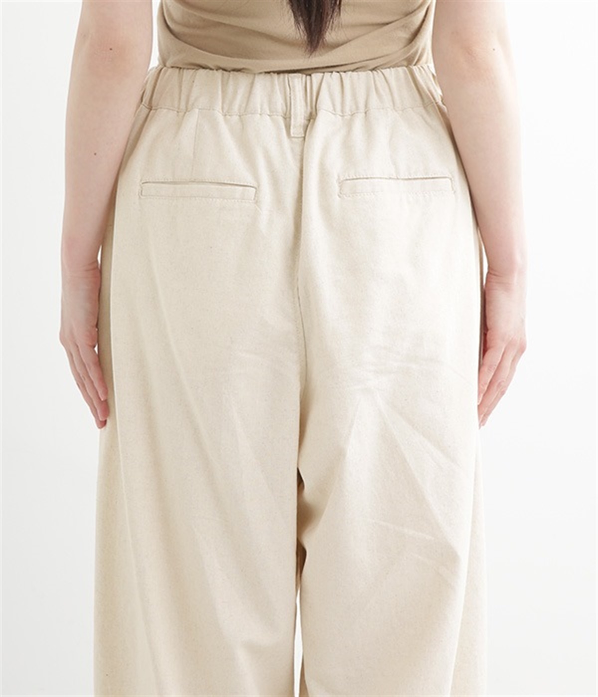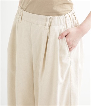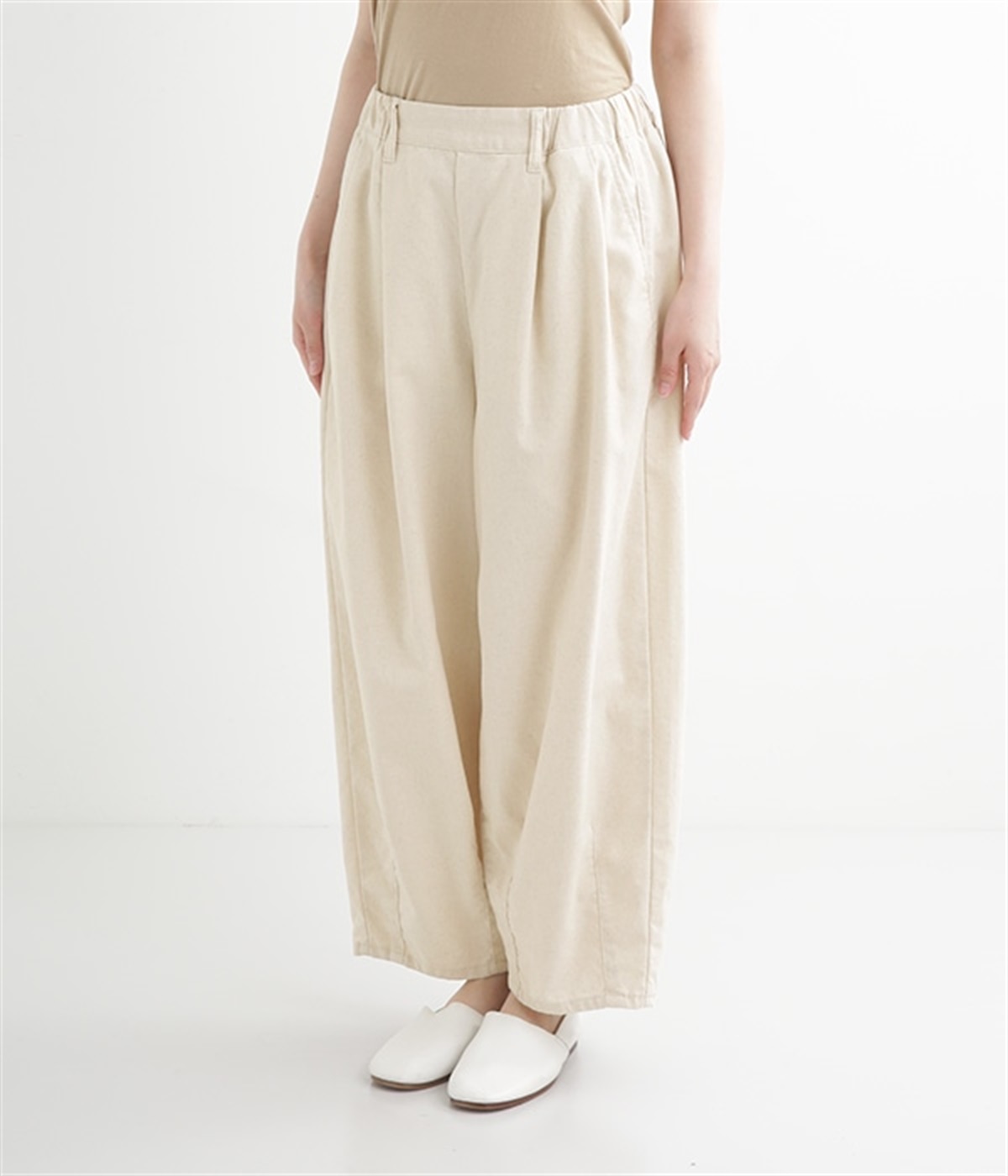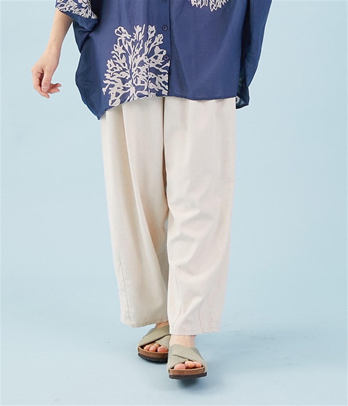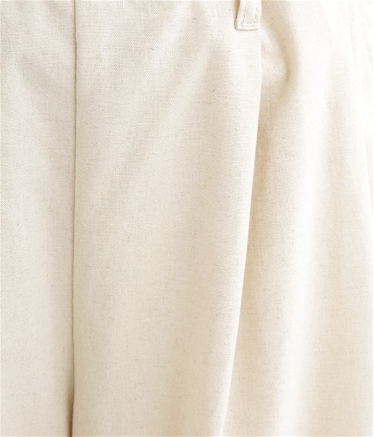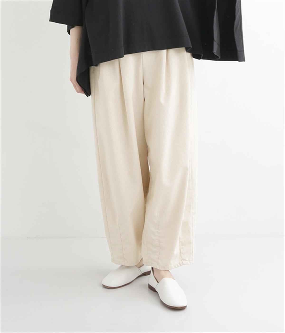 さりげなく浮かぶネップが素朴な表情を生む、コットンリネン生地で仕立てました。やわらかな肌あたりに、ほんのりとしたシャリ感が合わさり、さらりと快適なはき心地です。着るほどに風合いの変化をたのしめるのも魅力。