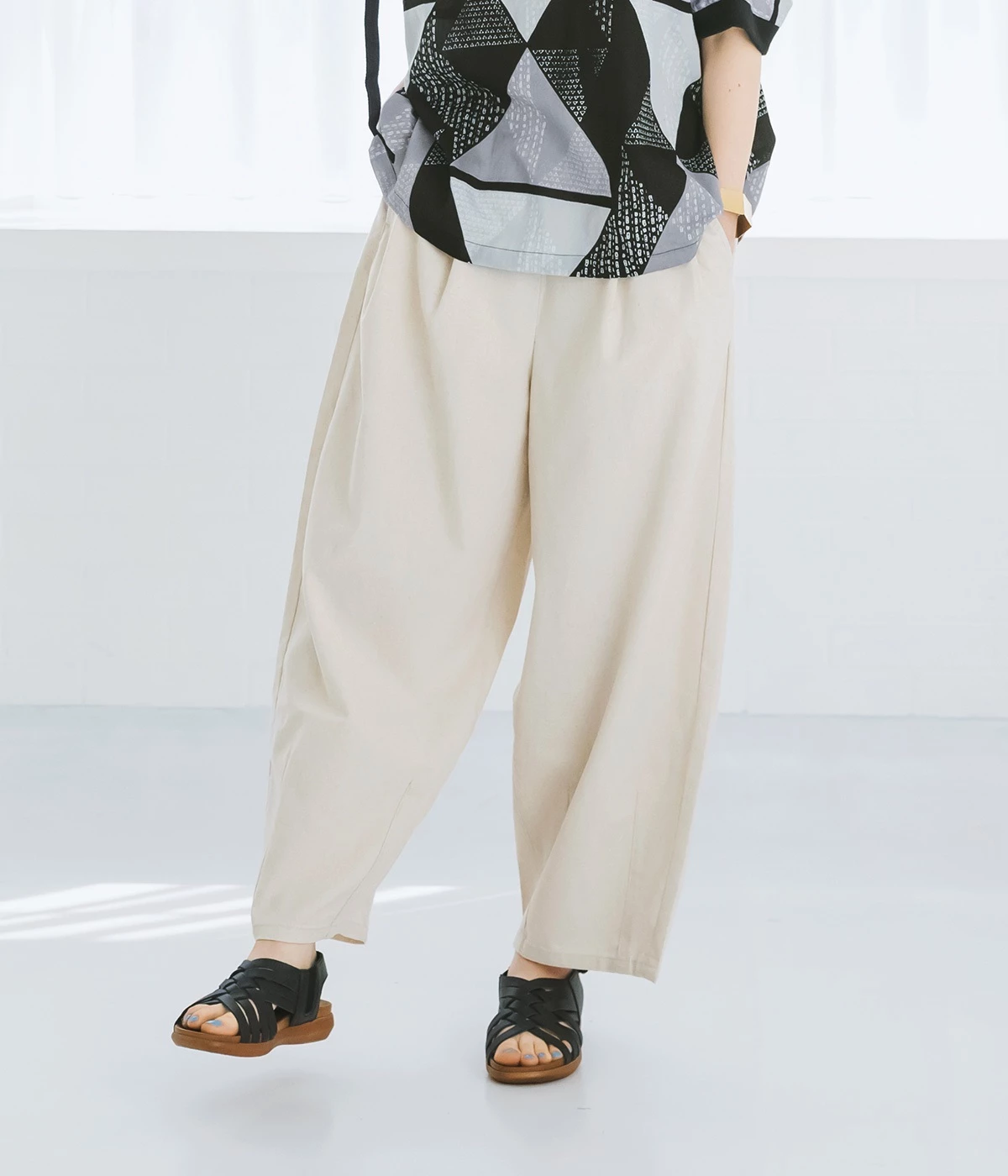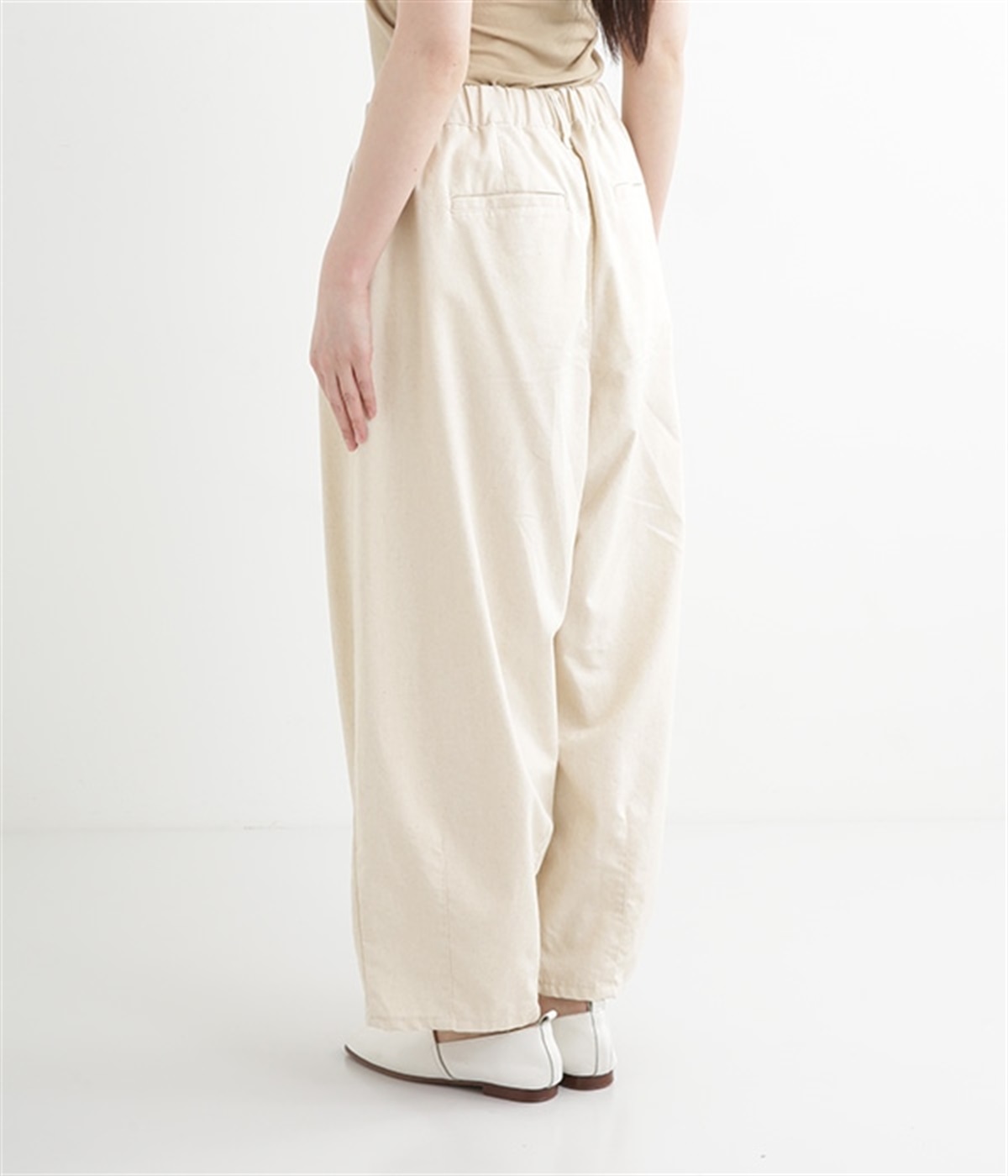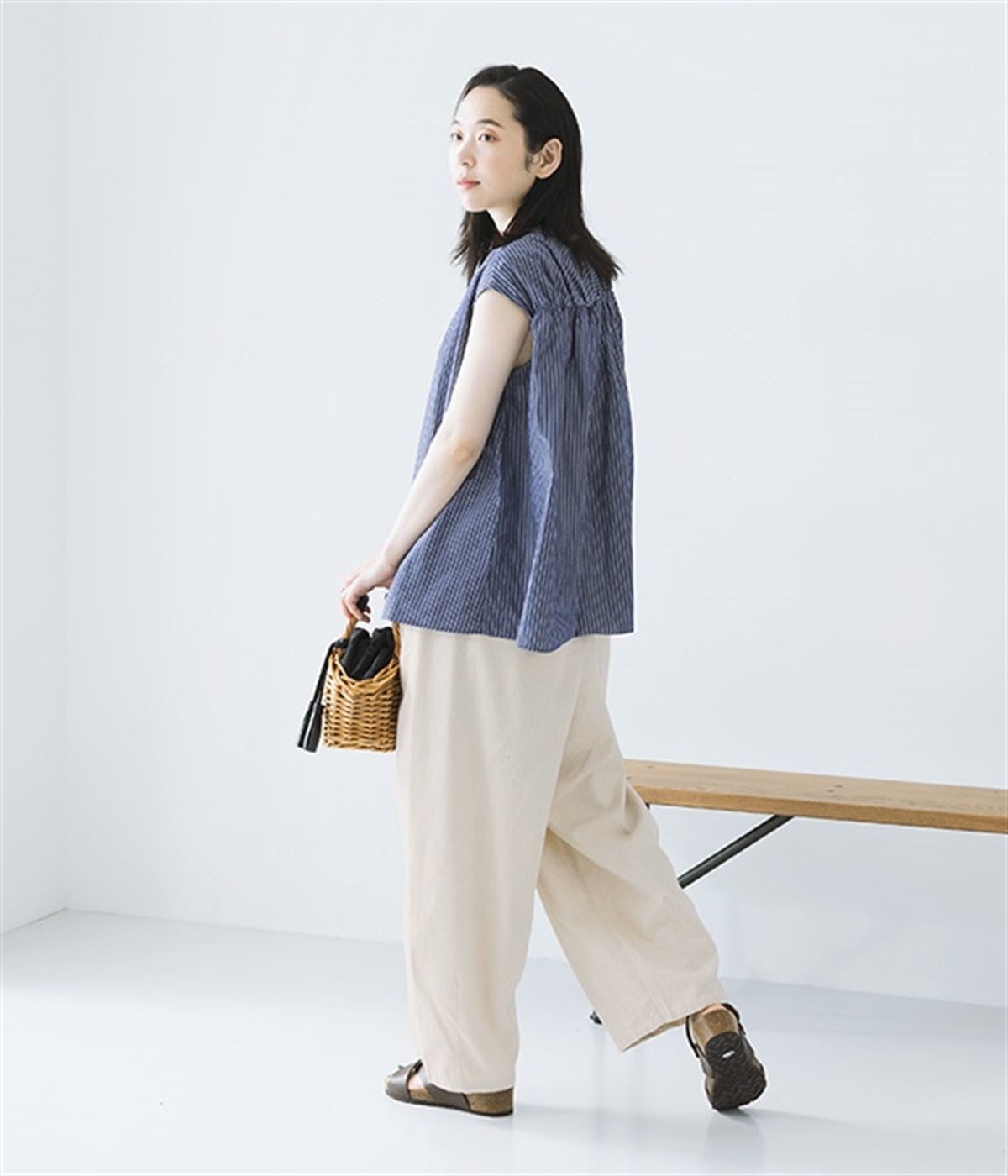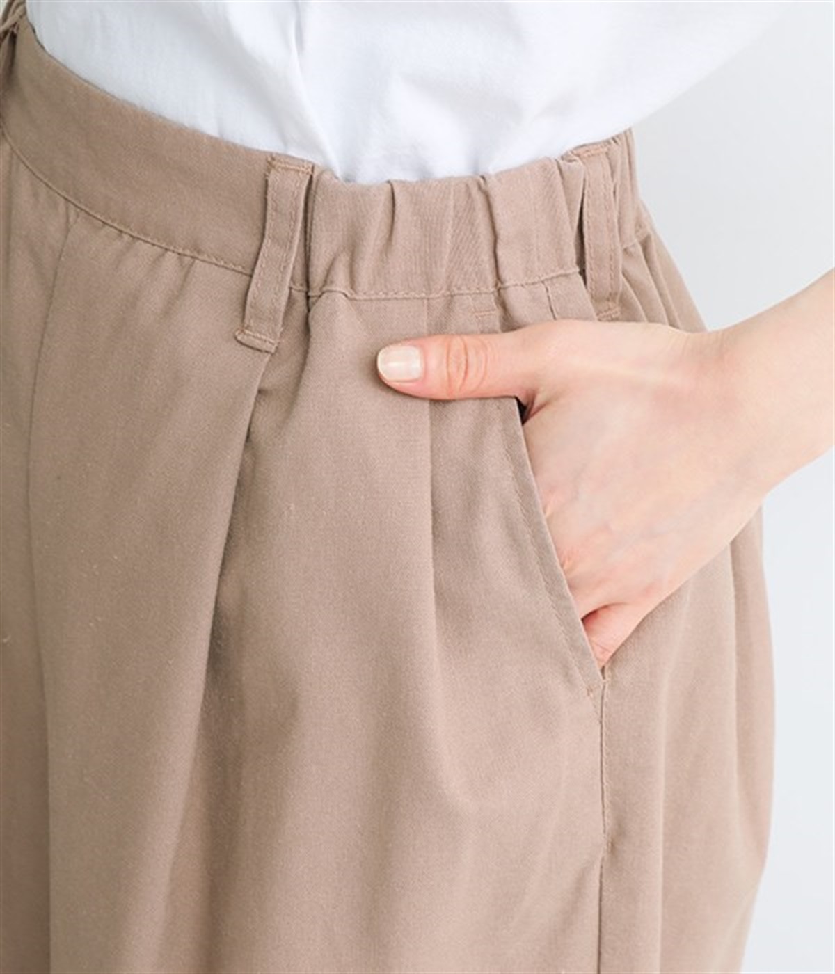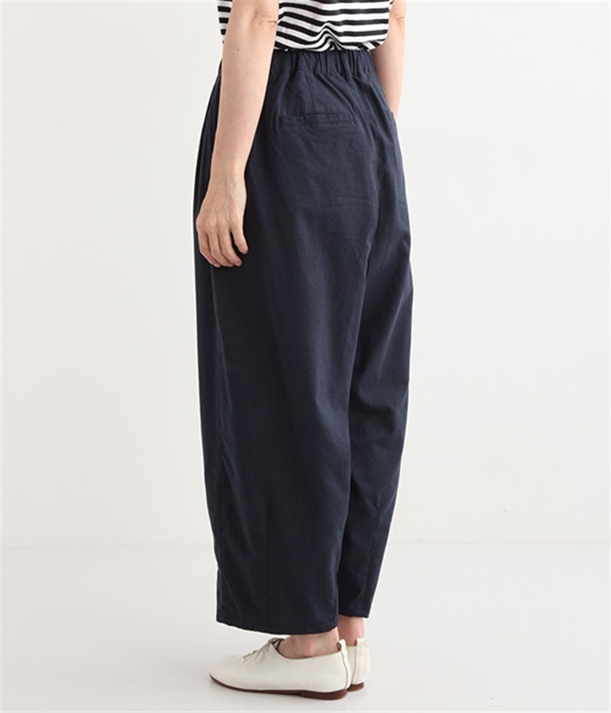 さりげなく浮かぶネップが素朴な表情を生む、コットンリネン生地で仕立てました。やわらかな肌あたりに、ほんのりとしたシャリ感が合わさり、さらりと快適なはき心地です。着るほどに風合いの変化をたのしめるのも魅力。