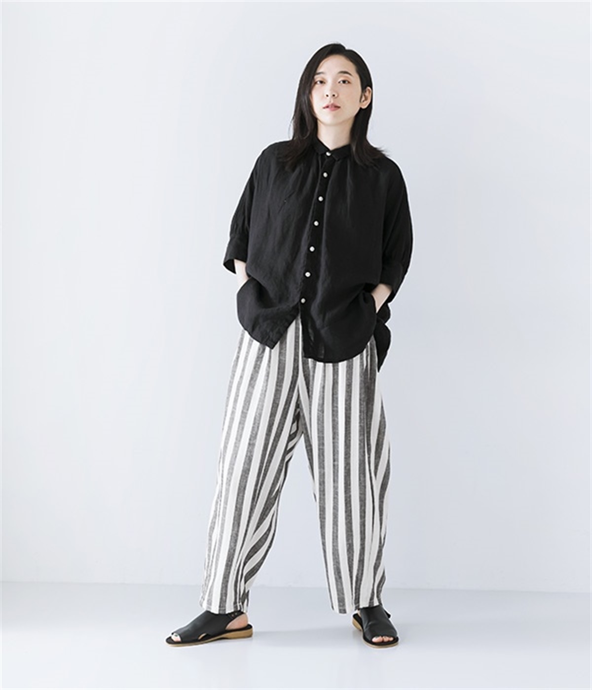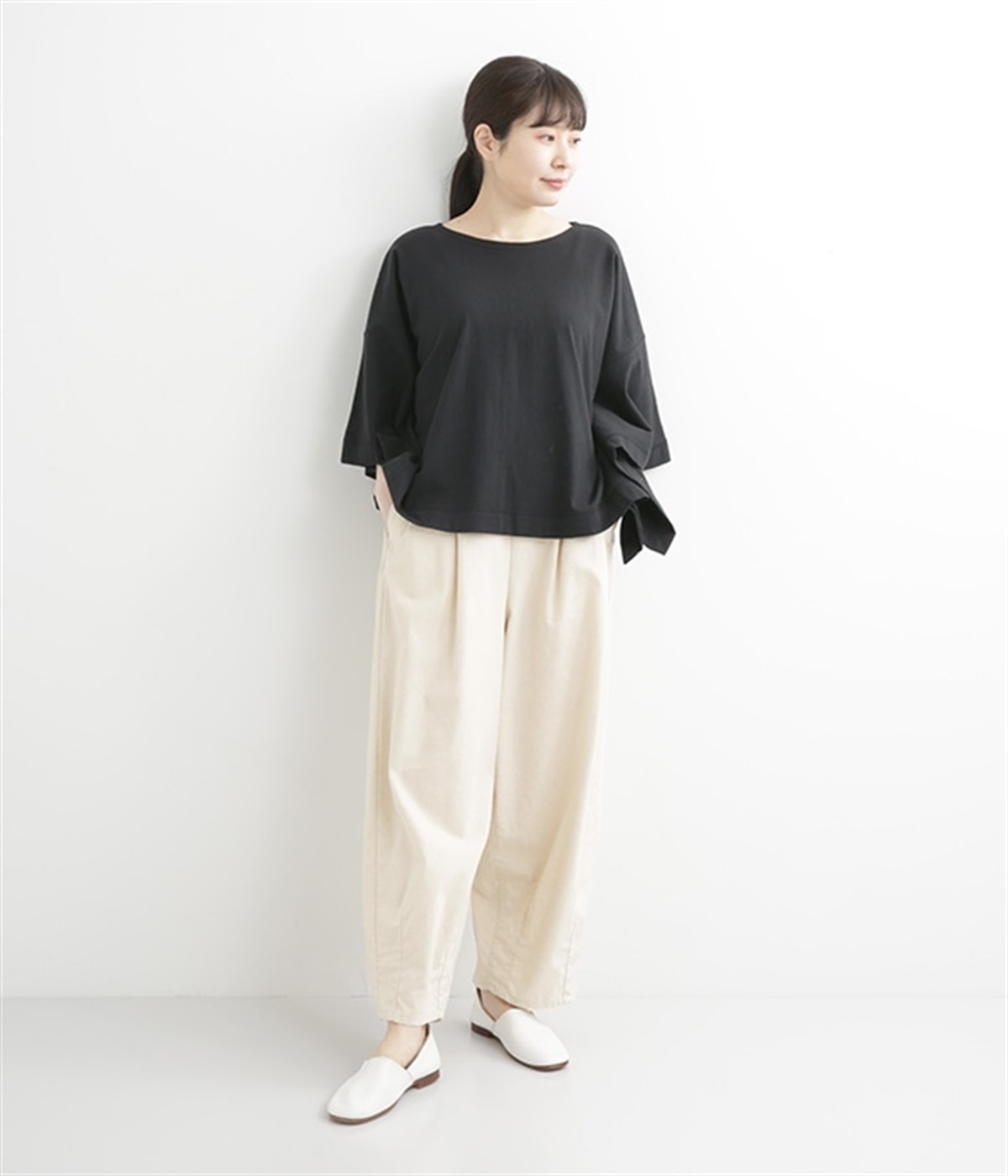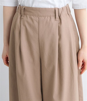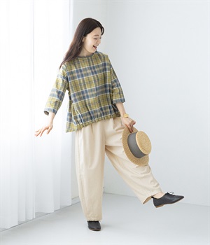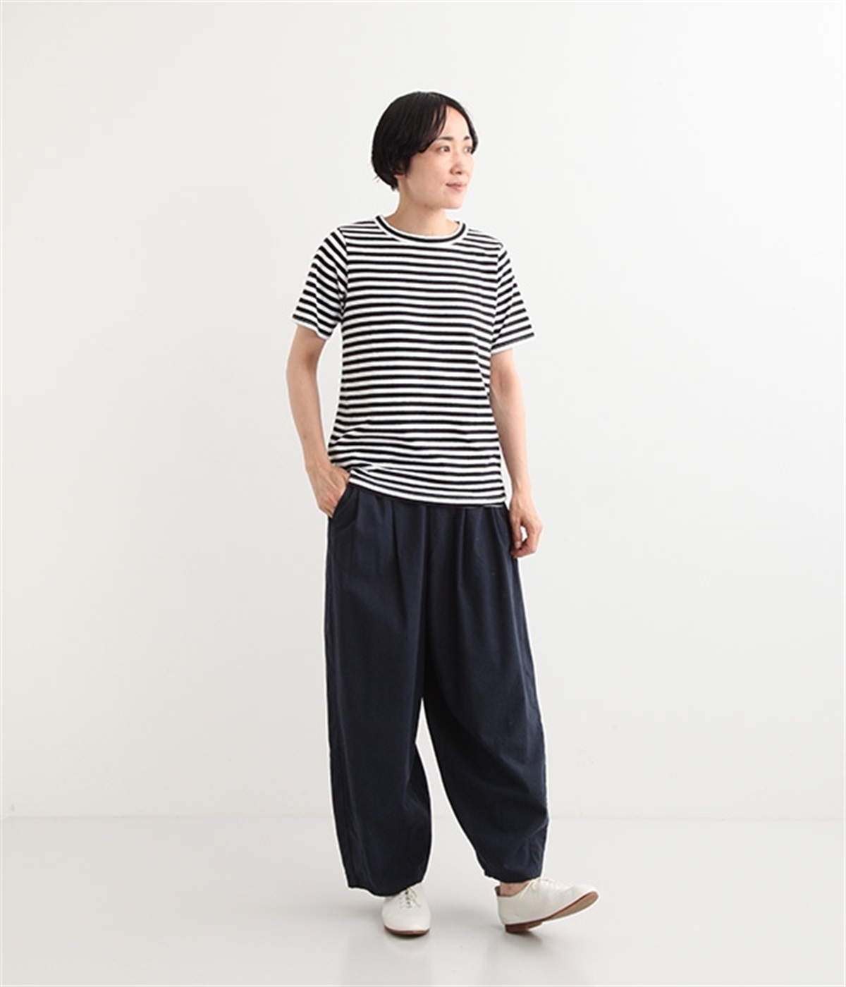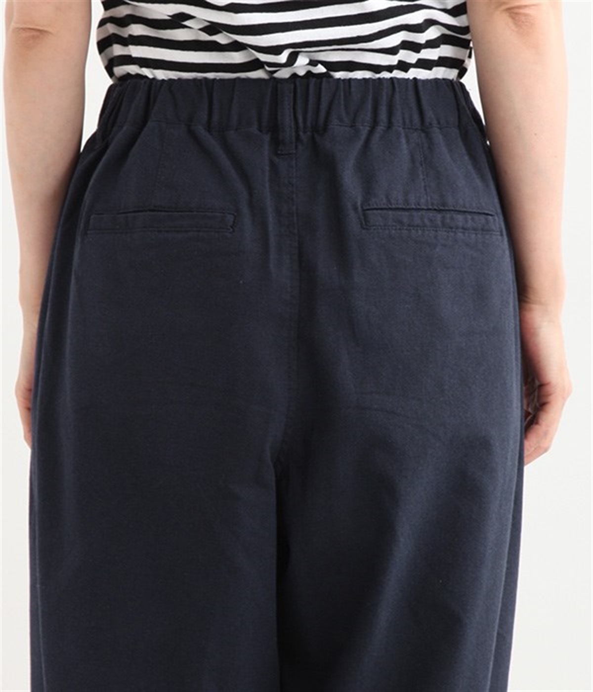 さりげなく浮かぶネップが素朴な表情を生む、コットンリネン生地で仕立てました。やわらかな肌あたりに、ほんのりとしたシャリ感が合わさり、さらりと快適なはき心地です。着るほどに風合いの変化をたのしめるのも魅力。