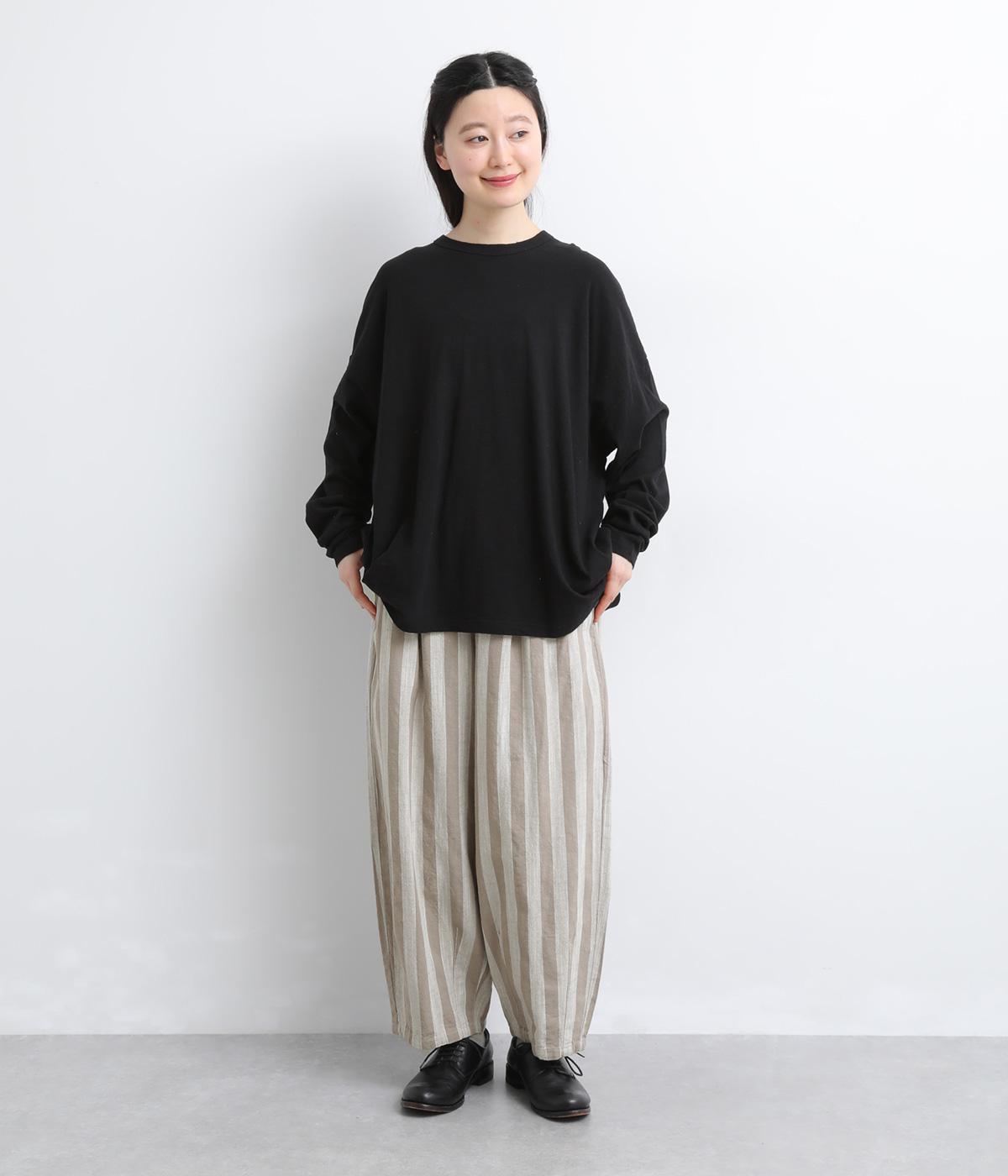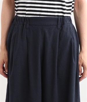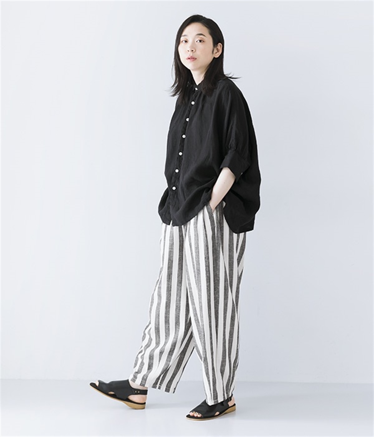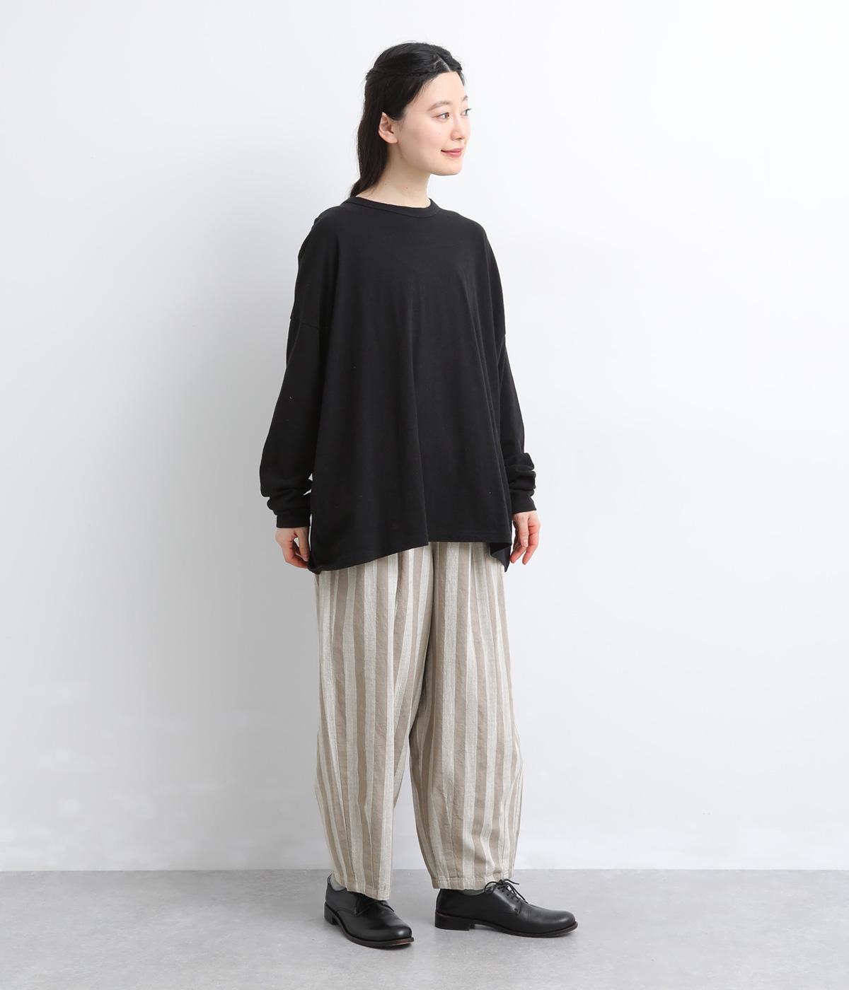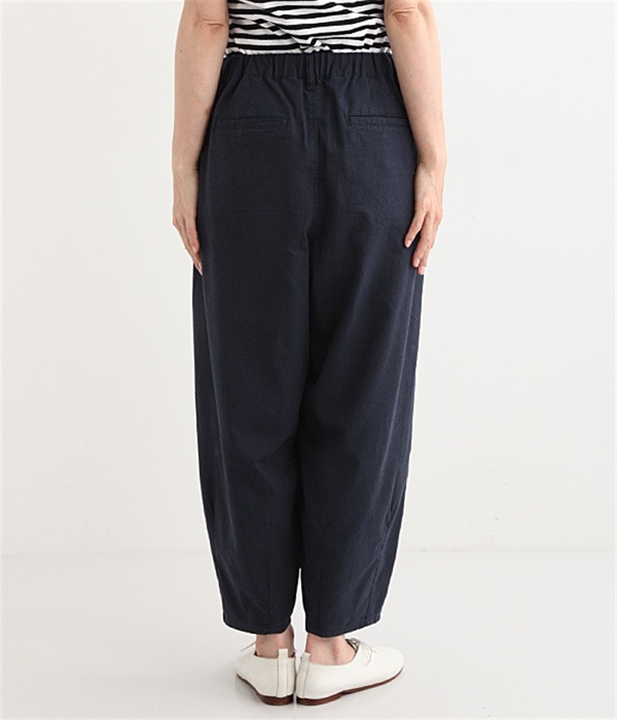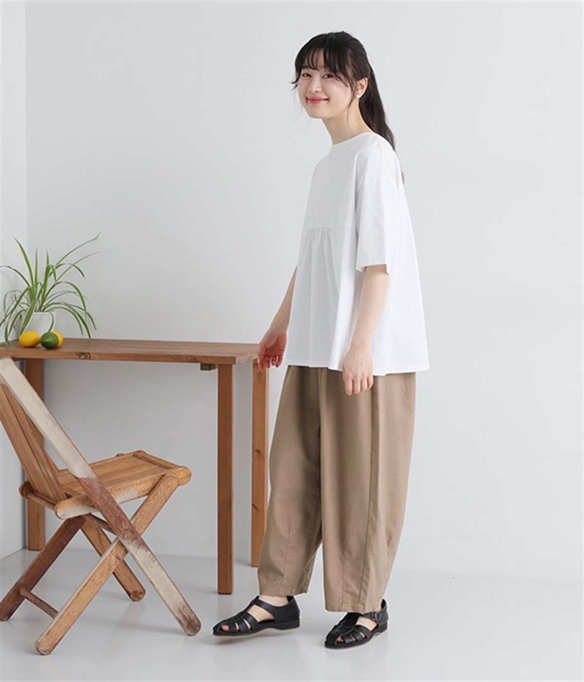 さりげなく浮かぶネップが素朴な表情を生む、コットンリネン生地で仕立てました。やわらかな肌あたりに、ほんのりとしたシャリ感が合わさり、さらりと快適なはき心地です。着るほどに風合いの変化をたのしめるのも魅力。
