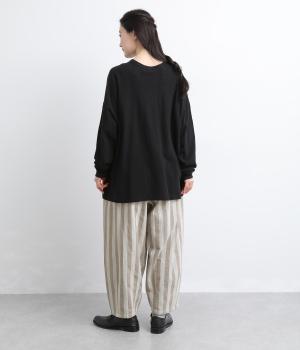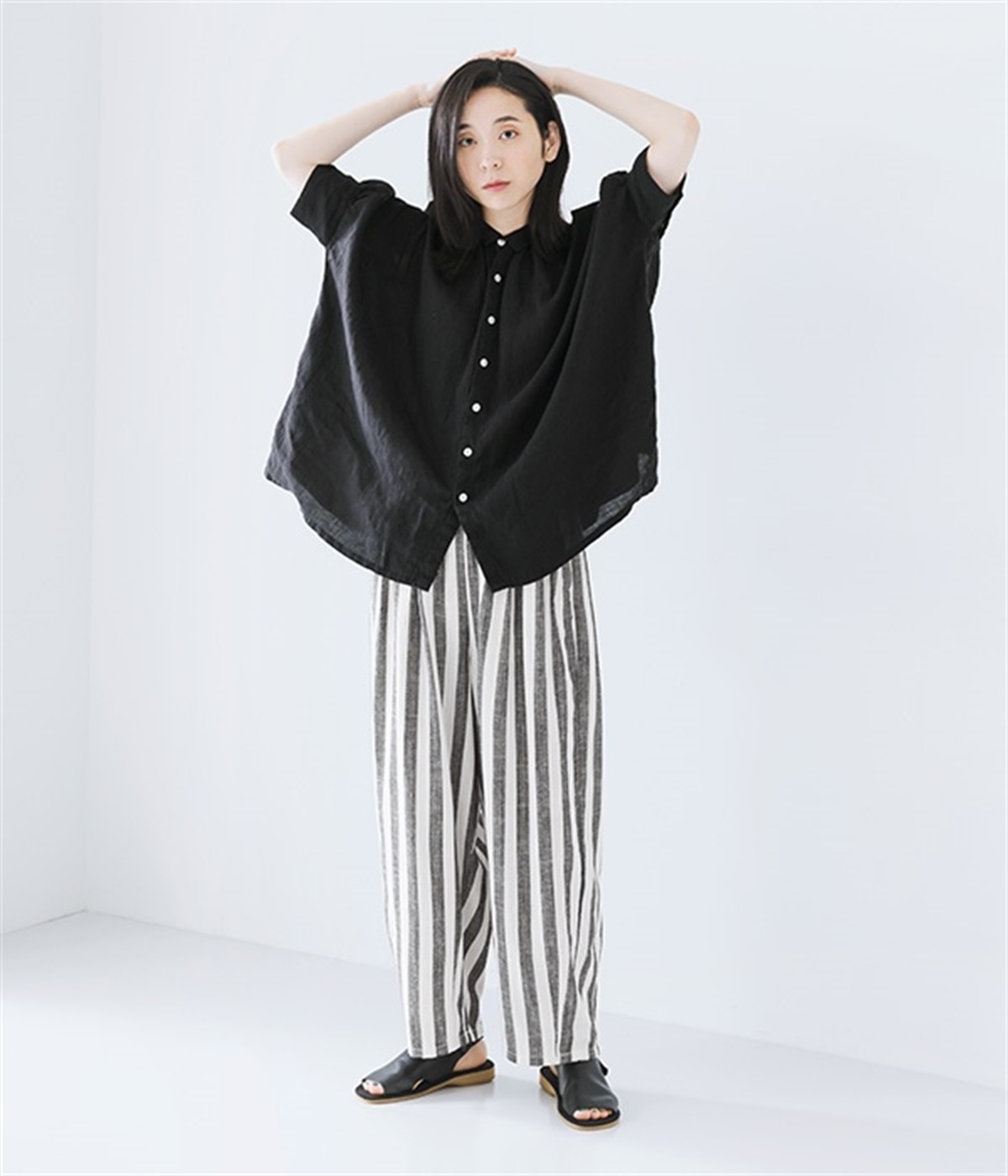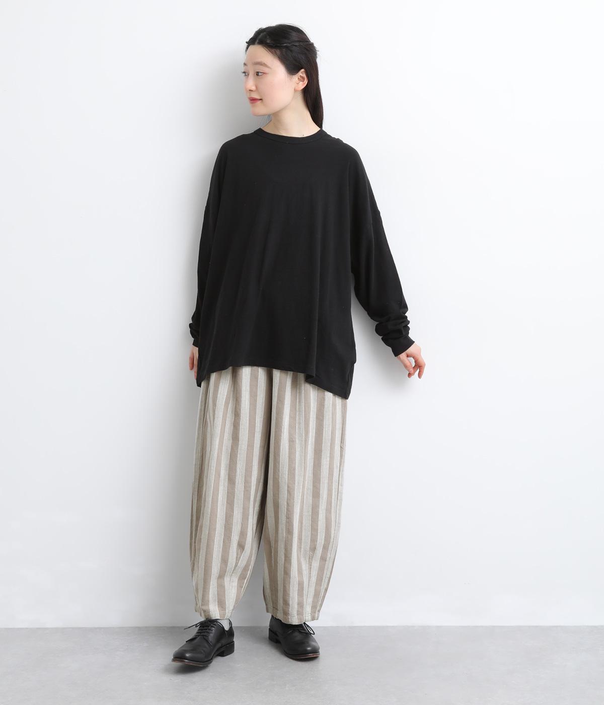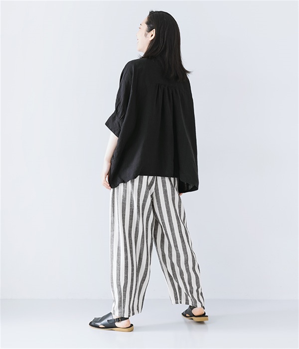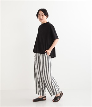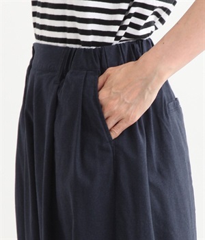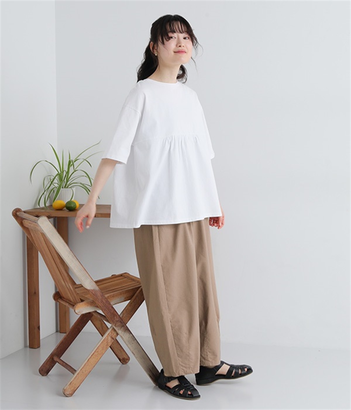 さりげなく浮かぶネップが素朴な表情を生む、コットンリネン生地で仕立てました。やわらかな肌あたりに、ほんのりとしたシャリ感が合わさり、さらりと快適なはき心地です。着るほどに風合いの変化をたのしめるのも魅力。