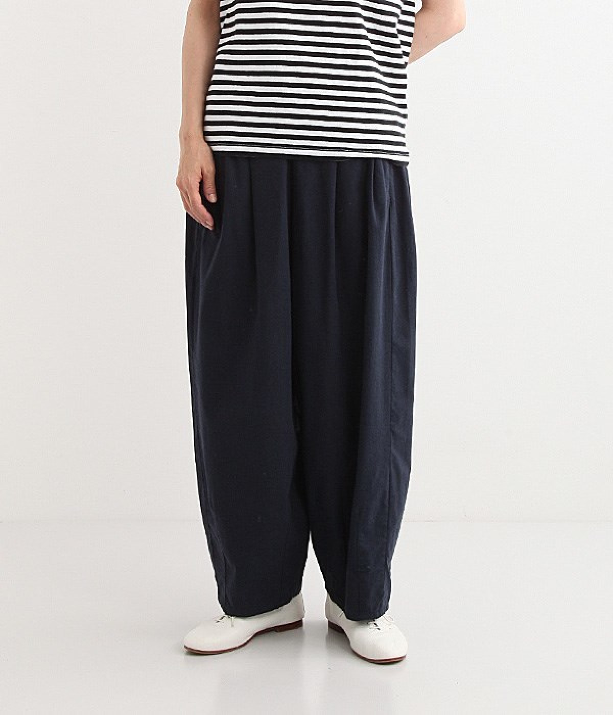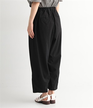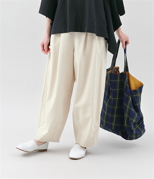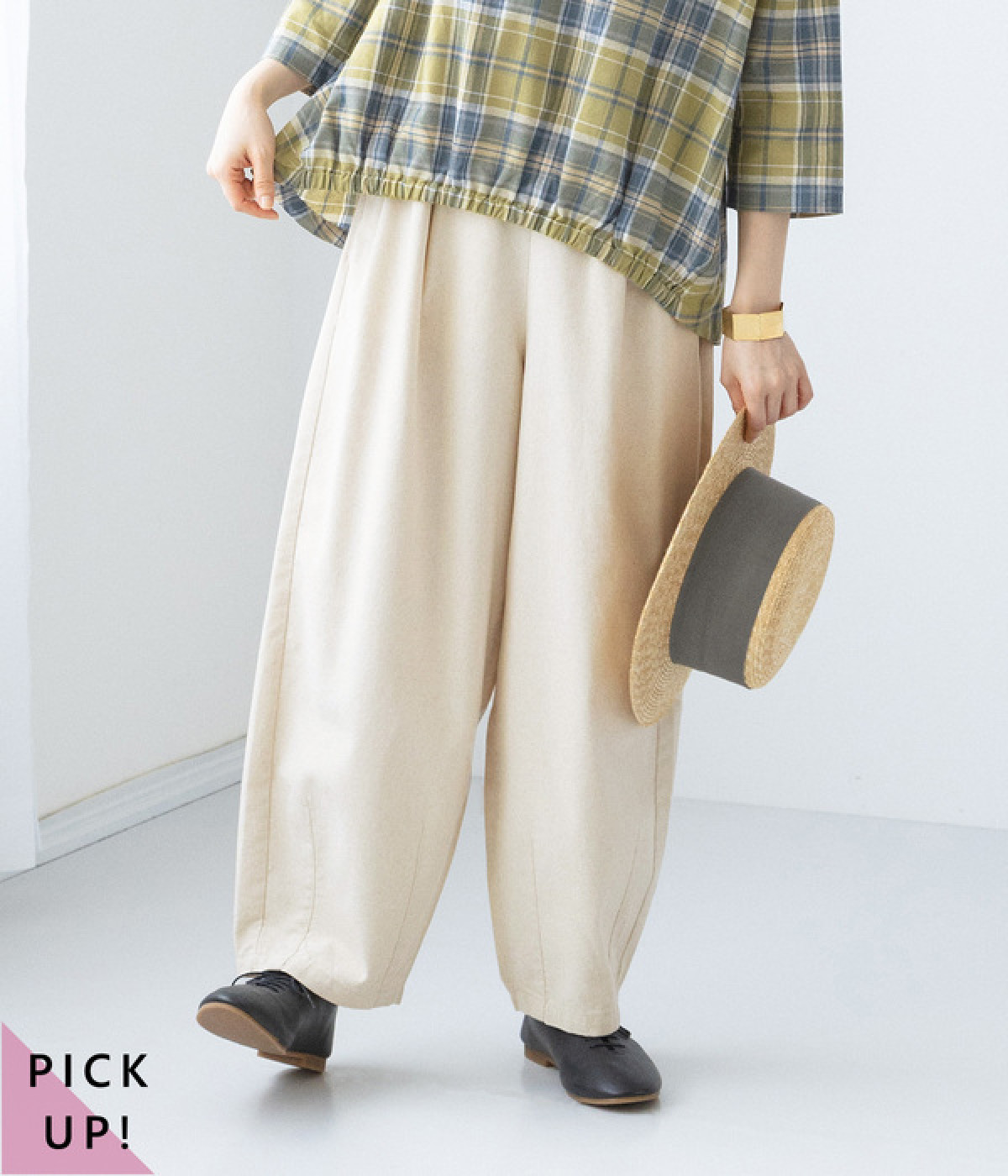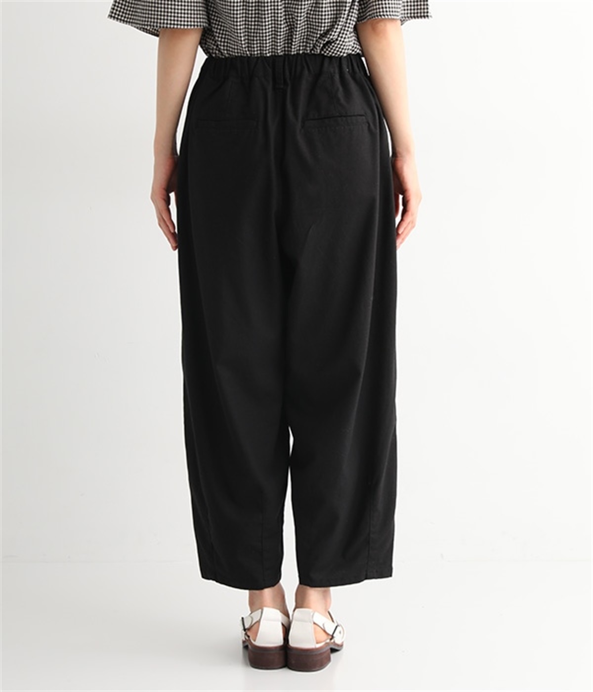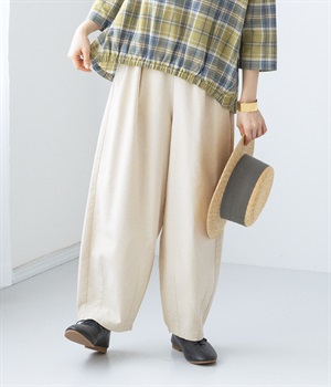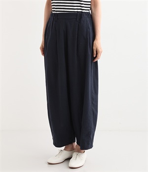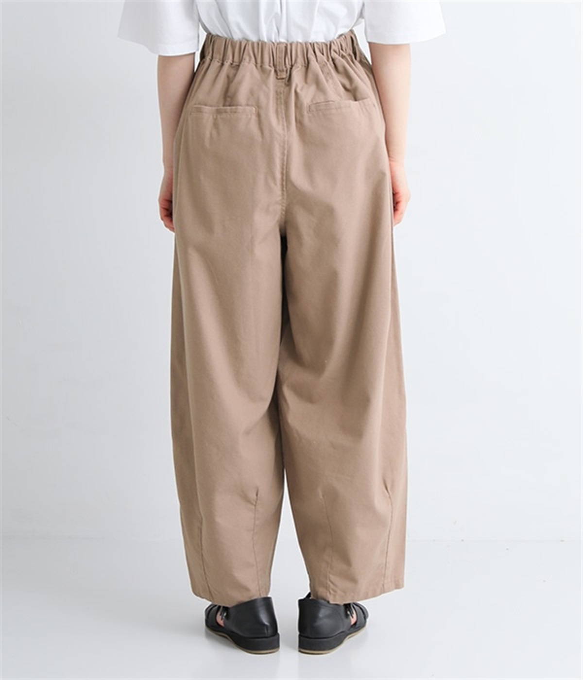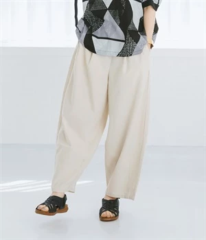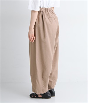 ヒップや太ももまわりにゆとりを持たせ、足首に向かって絞ったサーカスシルエットのパンツです。丸みのあるフォルムが体のラインをやさしくつつみ込み、こなれた印象を演出。ベルトループつきなので、ベルトやスカーフを合わせたコーディネートもたのしめます。