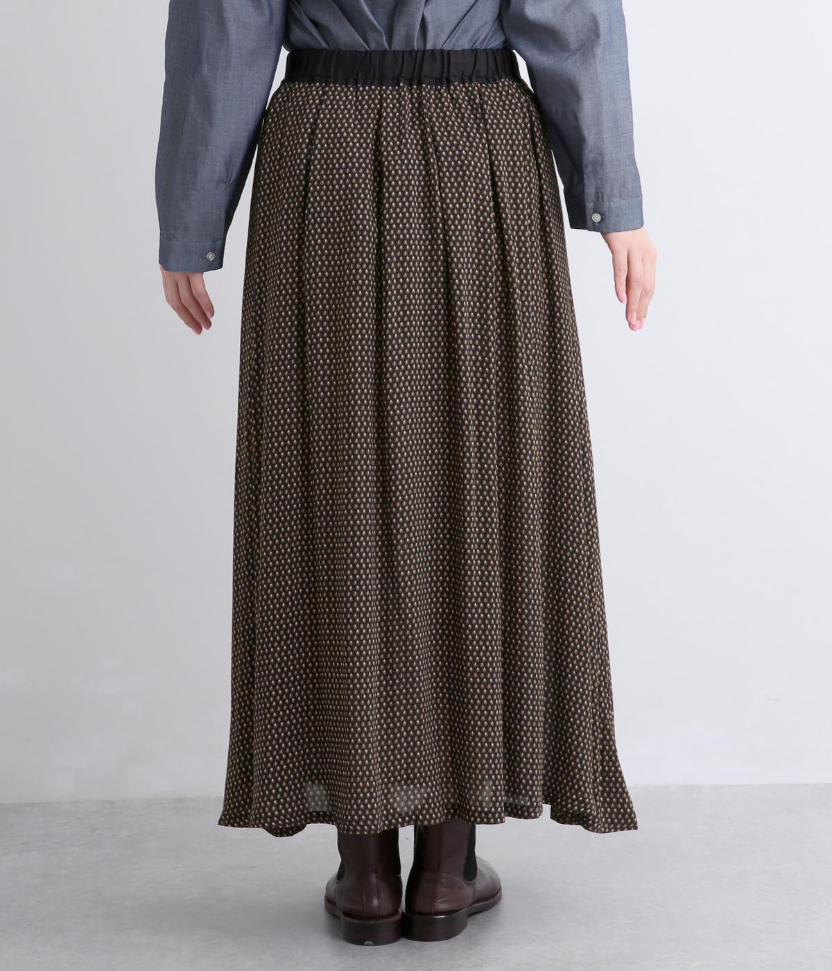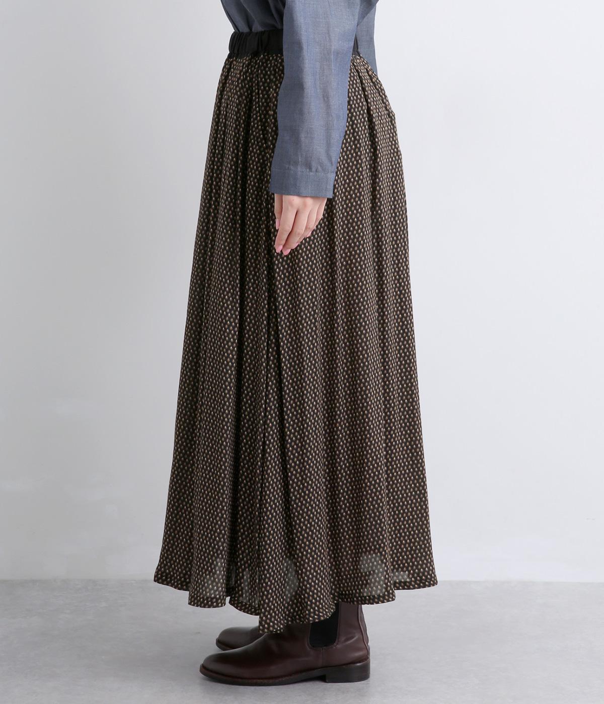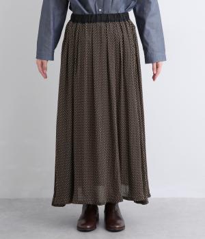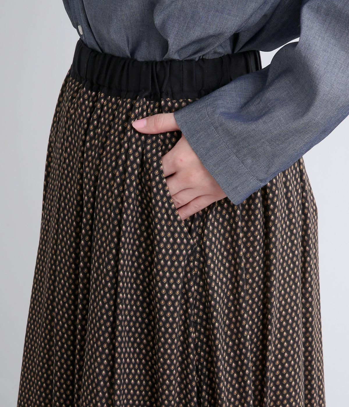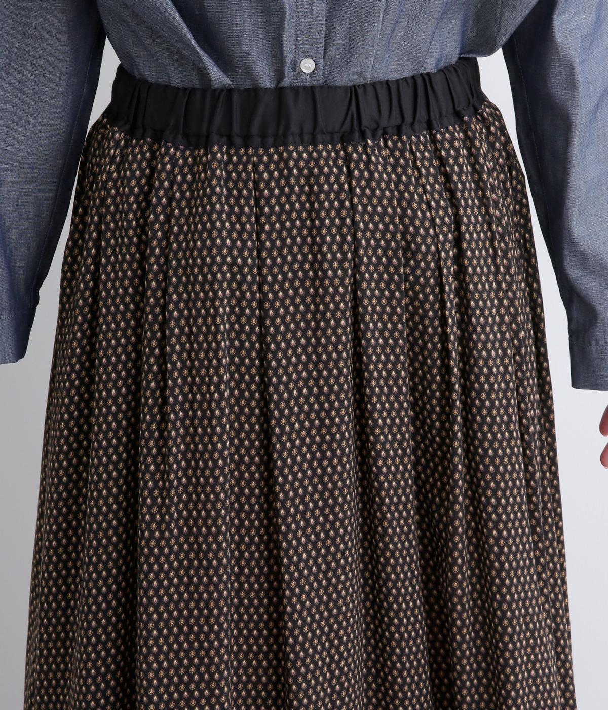 エキゾチックな更紗風プリントが個性的なスカートです。ゴム仕様のウエストは配色にして、タックインのスタイリングもバランスよくまとまります。とろみのある生地が優雅なドレープを描き、上品な印象に仕上げました。
