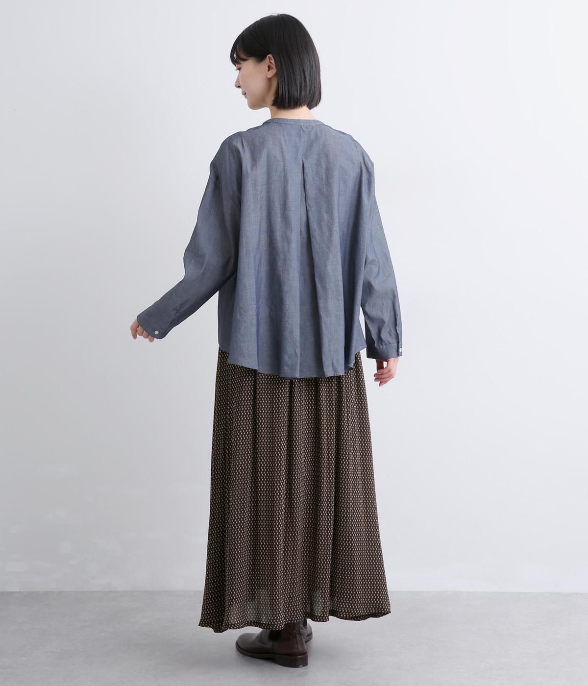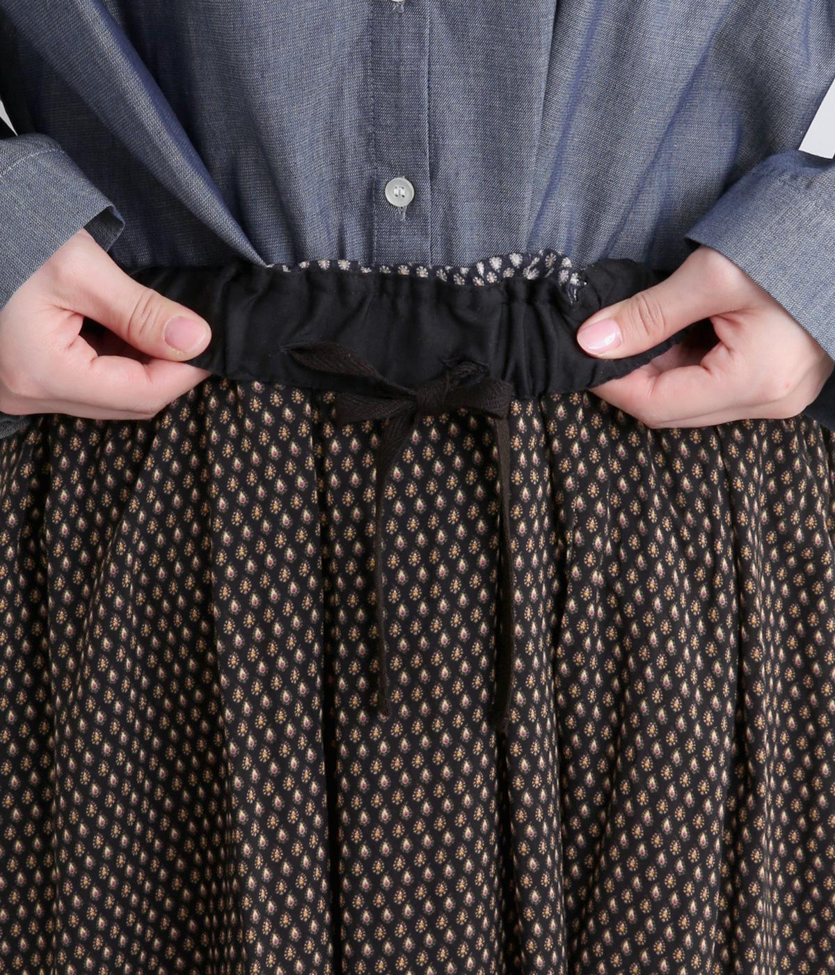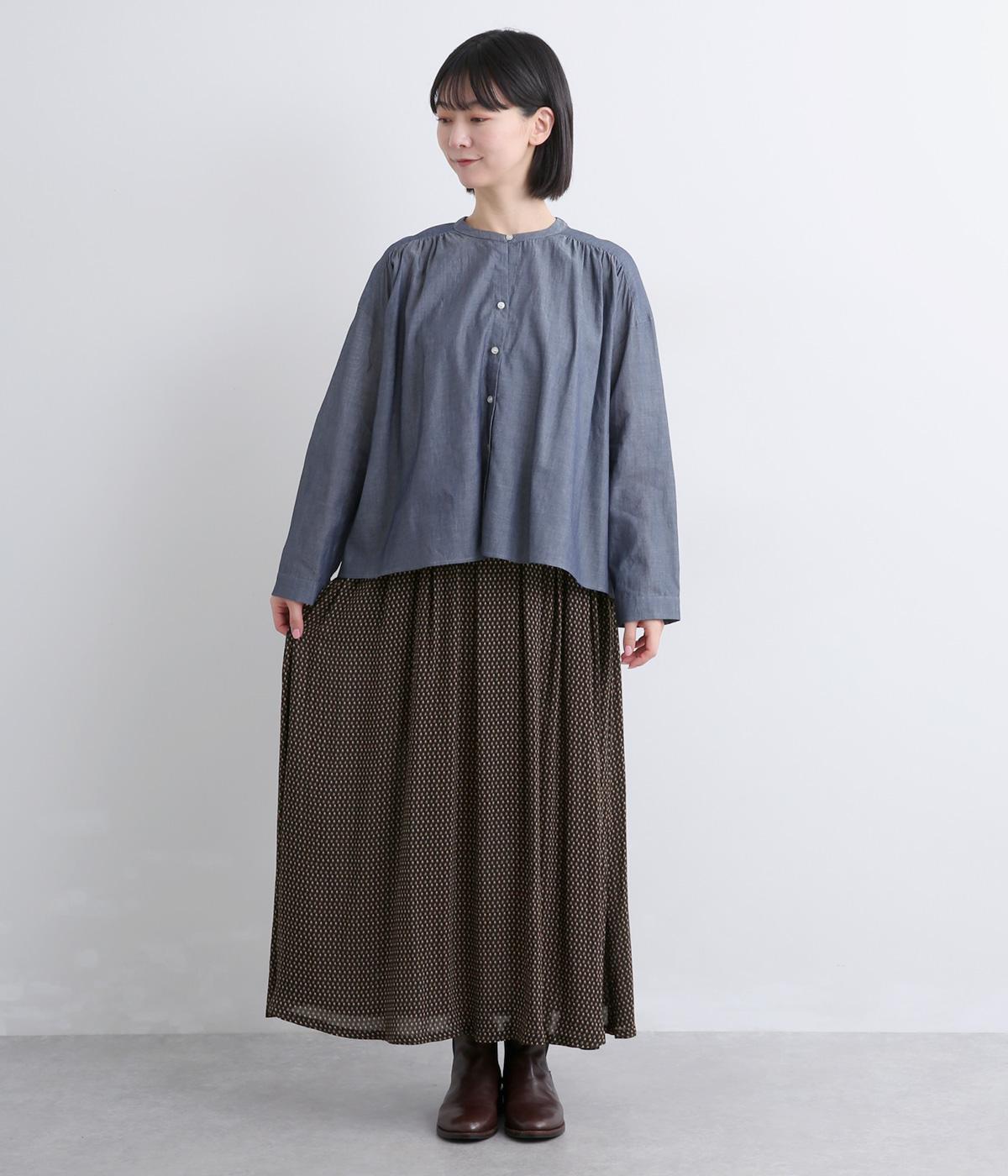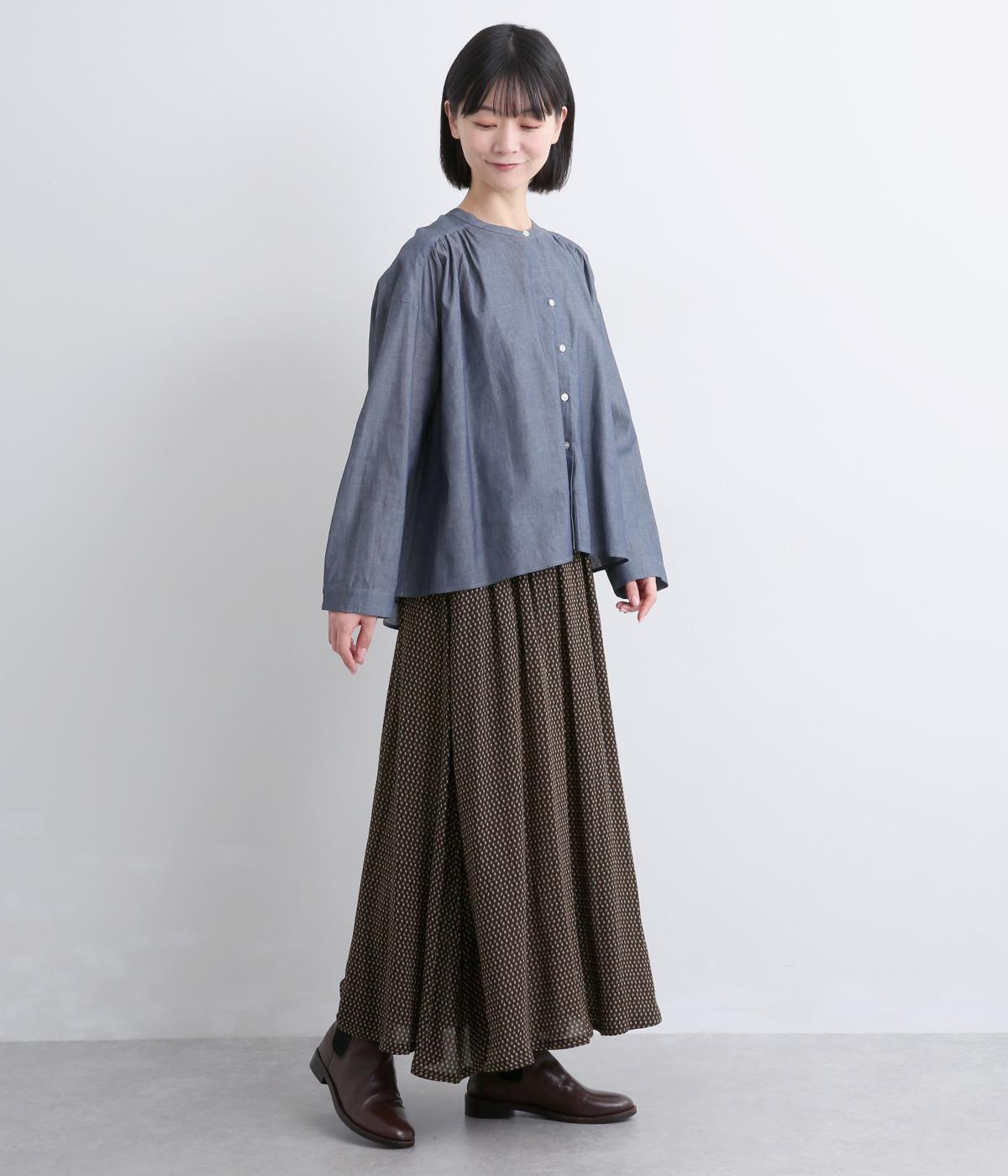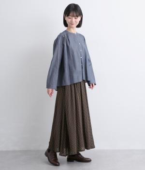 エキゾチックな更紗風プリントが個性的なスカートです。ゴム仕様のウエストは配色にして、タックインのスタイリングもバランスよくまとまります。とろみのある生地が優雅なドレープを描き、上品な印象に仕上げました。