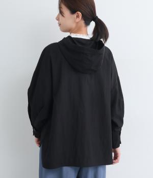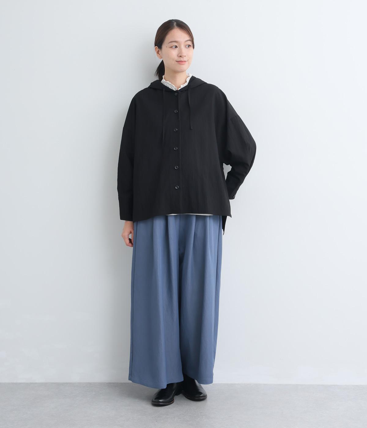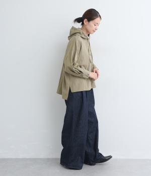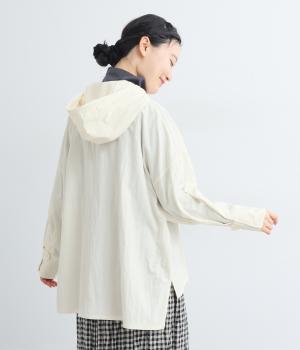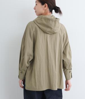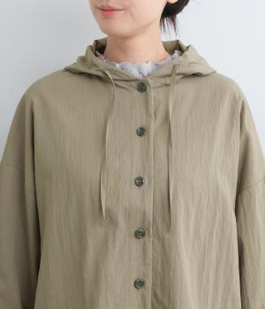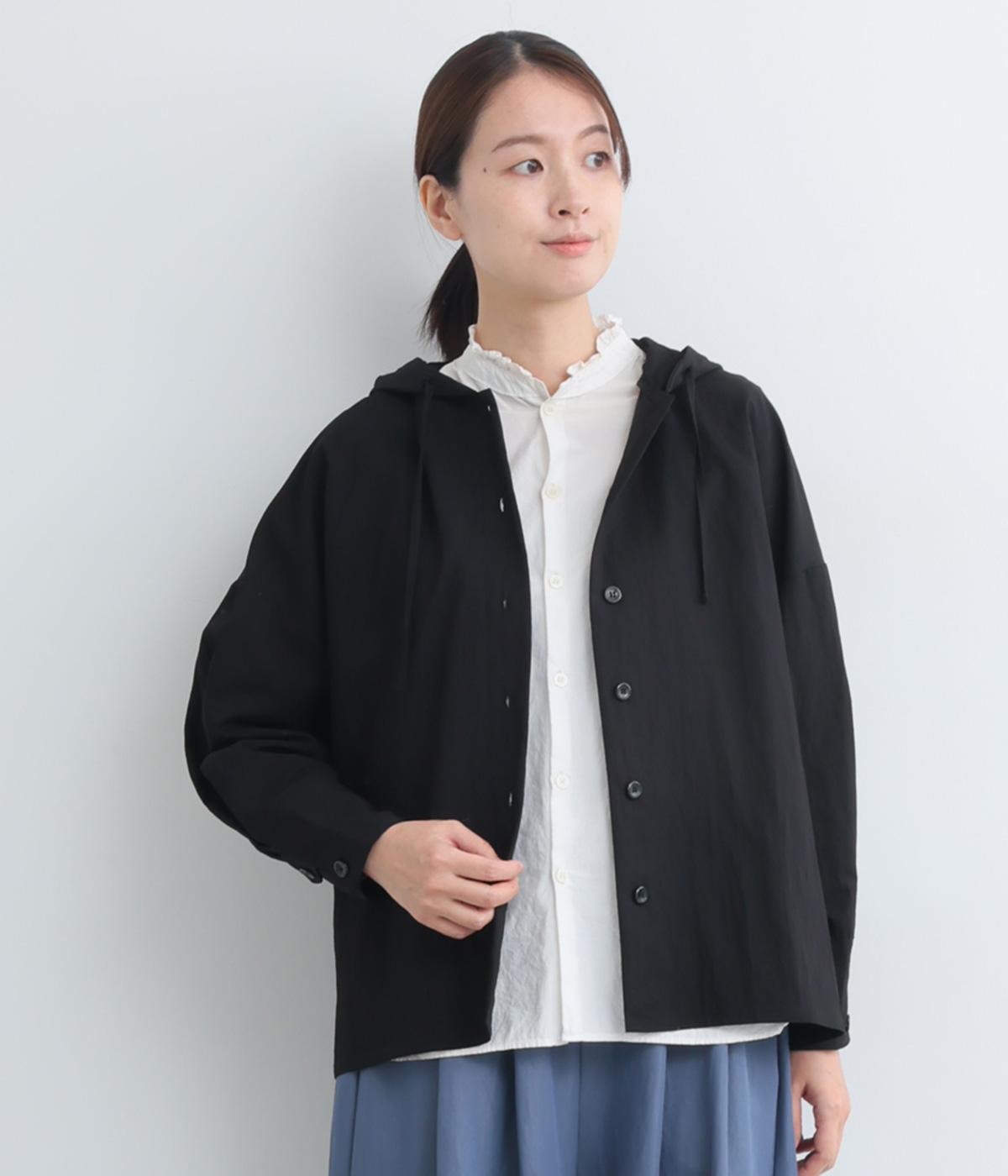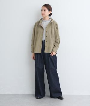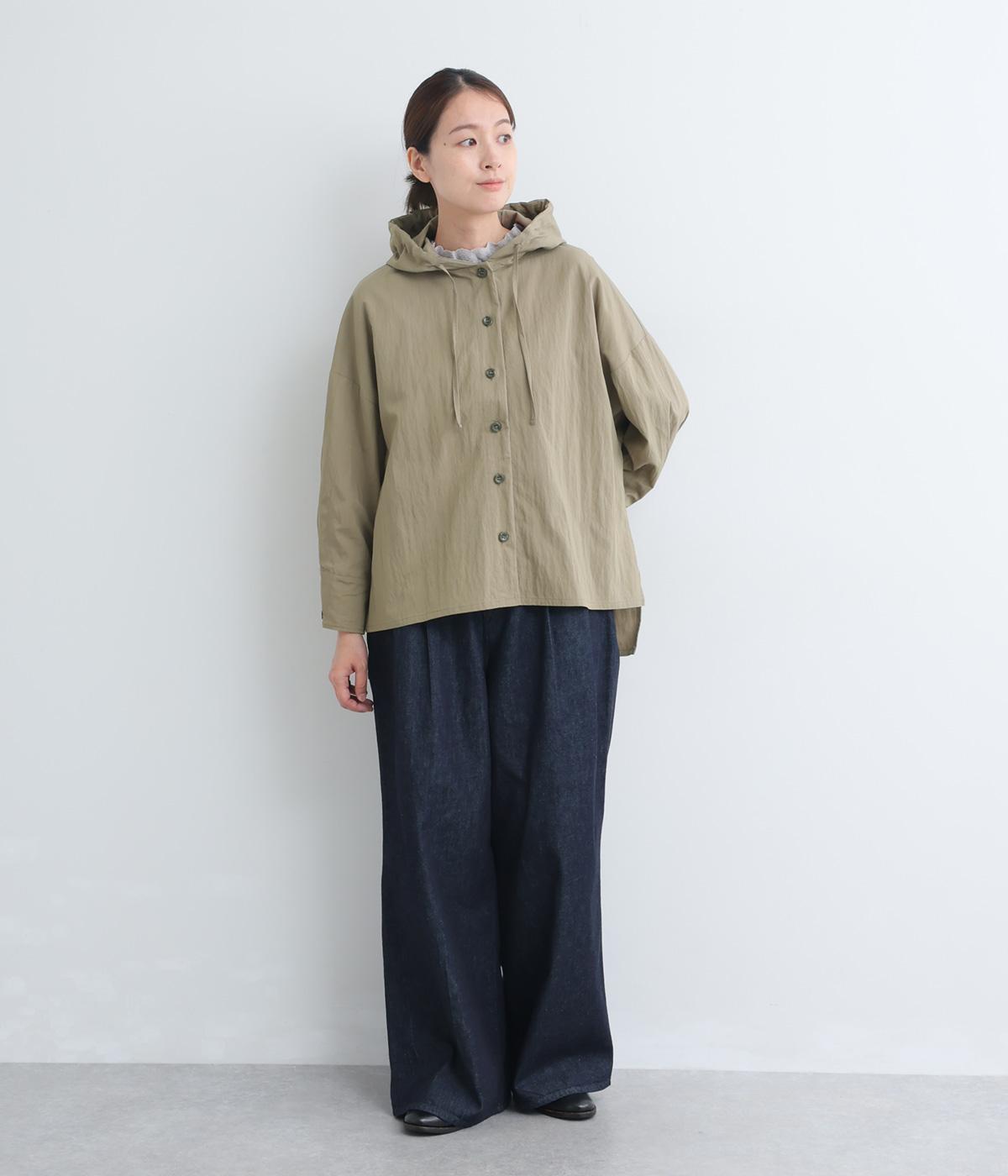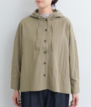 ラフに羽織れるシャツタイプのジャケットにフードをつけてカジュアル感をプラス。着丈は前後差をつけているので、横姿に動きが生まれてお洒落感もアップ。ふわりとさせたタック入りの袖口がほどよくレディなポイントに。