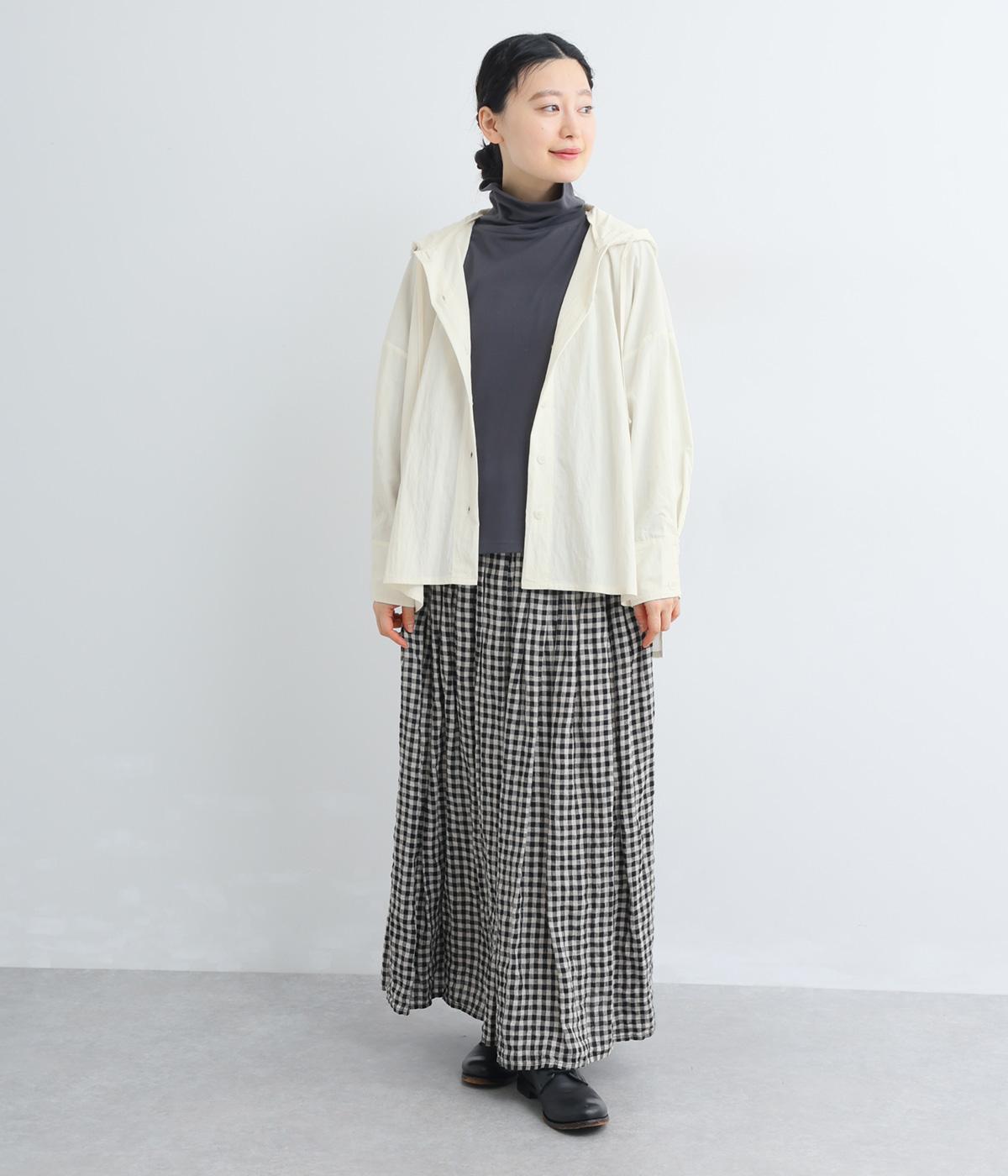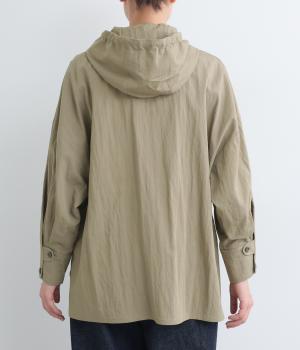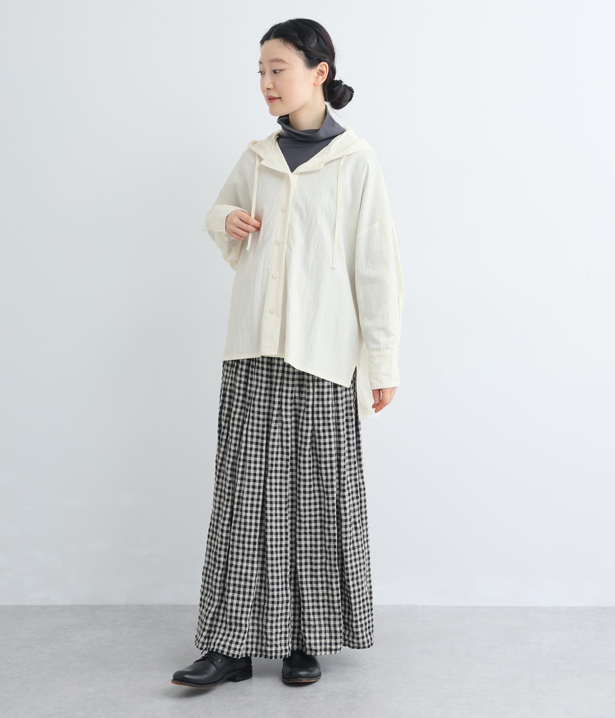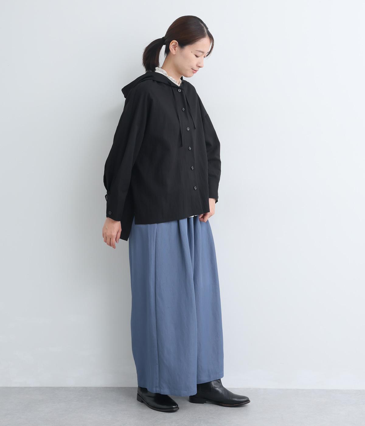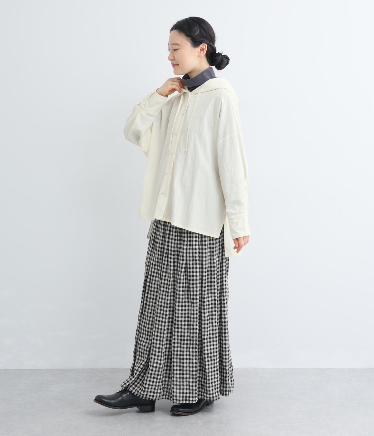 ラフに羽織れるシャツタイプのジャケットにフードをつけてカジュアル感をプラス。着丈は前後差をつけているので、横姿に動きが生まれてお洒落感もアップ。ふわりとさせたタック入りの袖口がほどよくレディなポイントに。