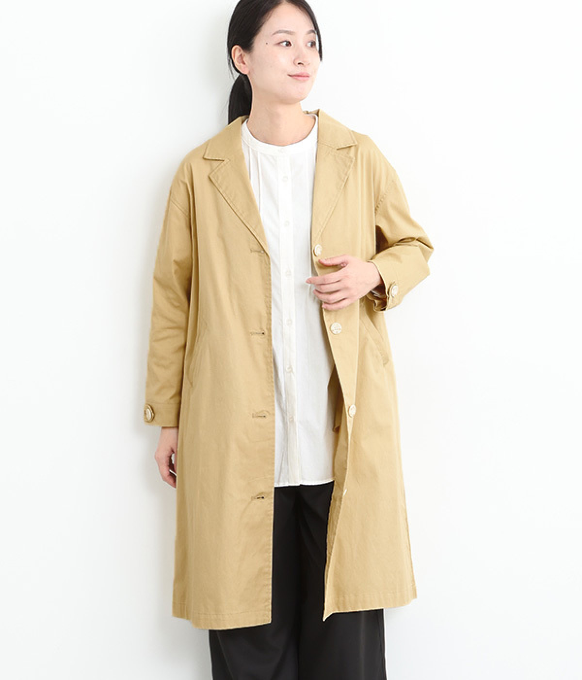 ゆとりがありながらも広がりすぎない、すっきりとしたAラインシルエットのコートです。ラッピング柄のブランドネームや彫りボタン、右上前見返し裾には刺しゅうとこだわりが詰まった一枚に。前あきでラフに羽織るのも◎。