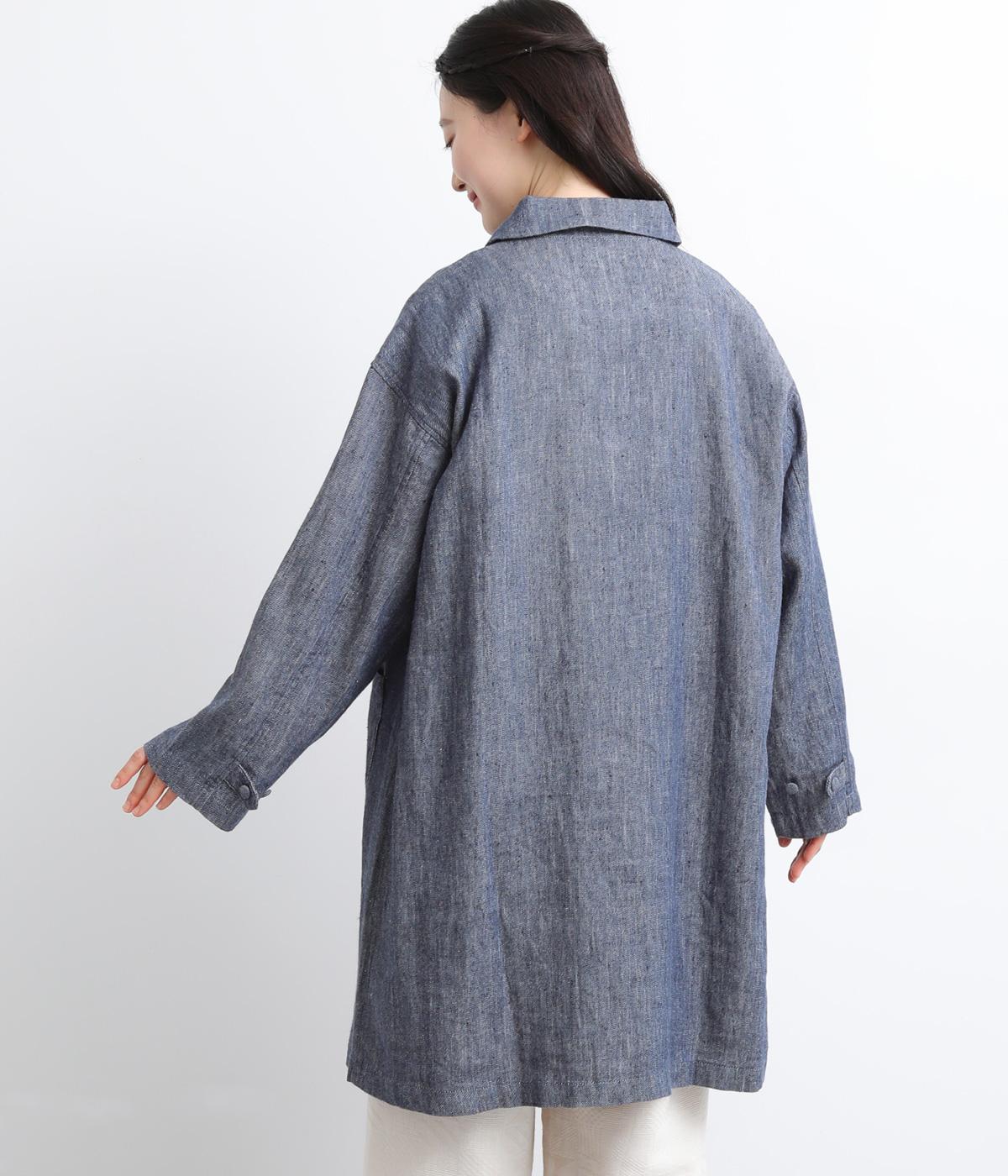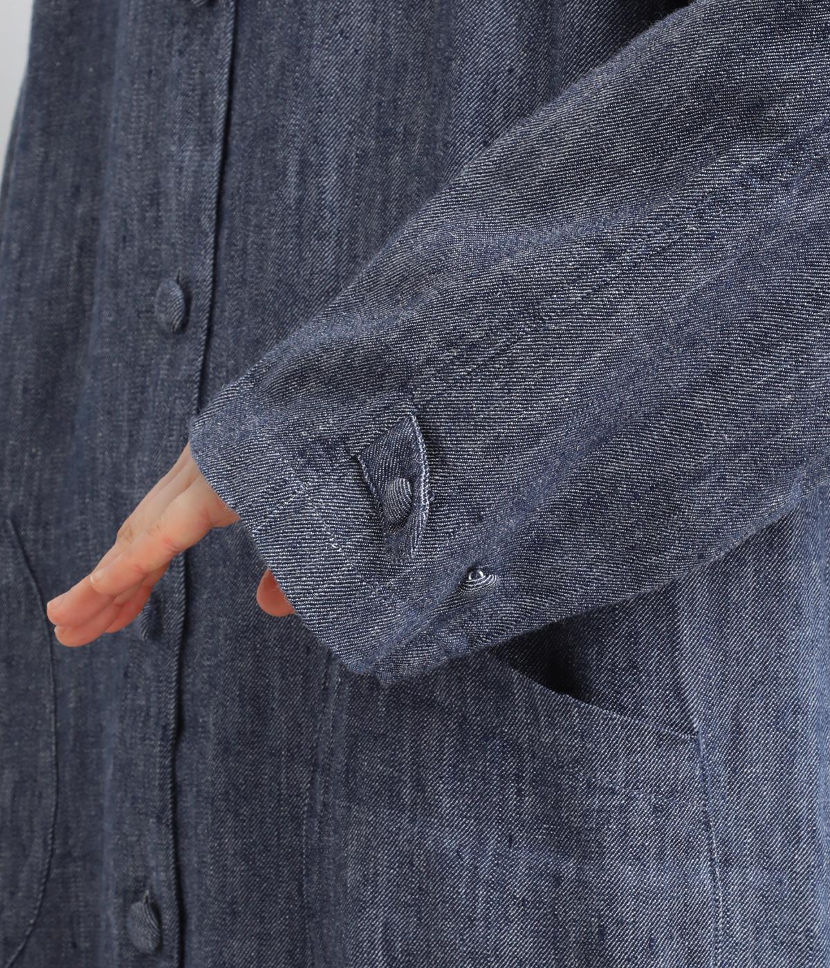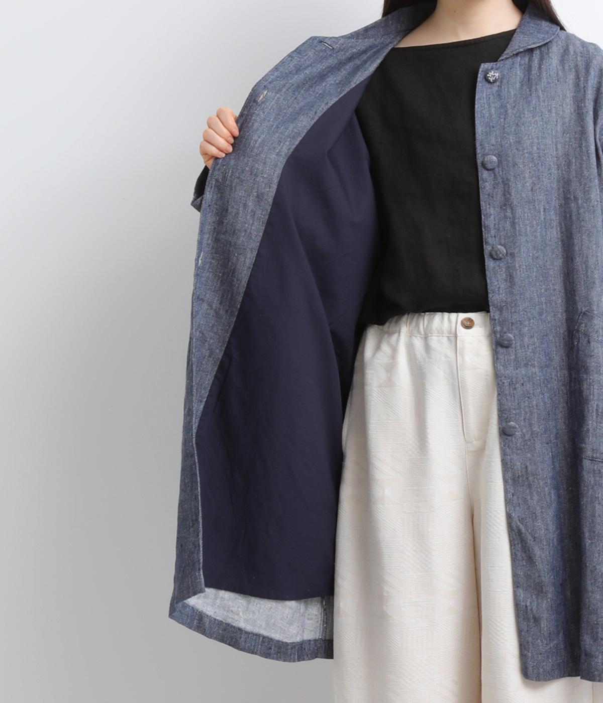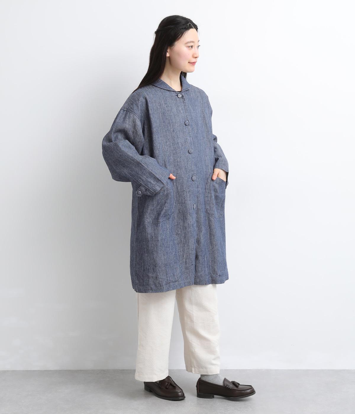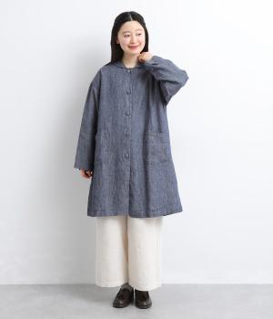 リネンを綾織りで仕立てた生地は、さらっとした手ざわりと軽やかな着用感が魅力。ほどよいハリがありながらも、やわらかく動きになじみます。織りの表情が、ナチュラルな風合いを引き立てる生地感です。