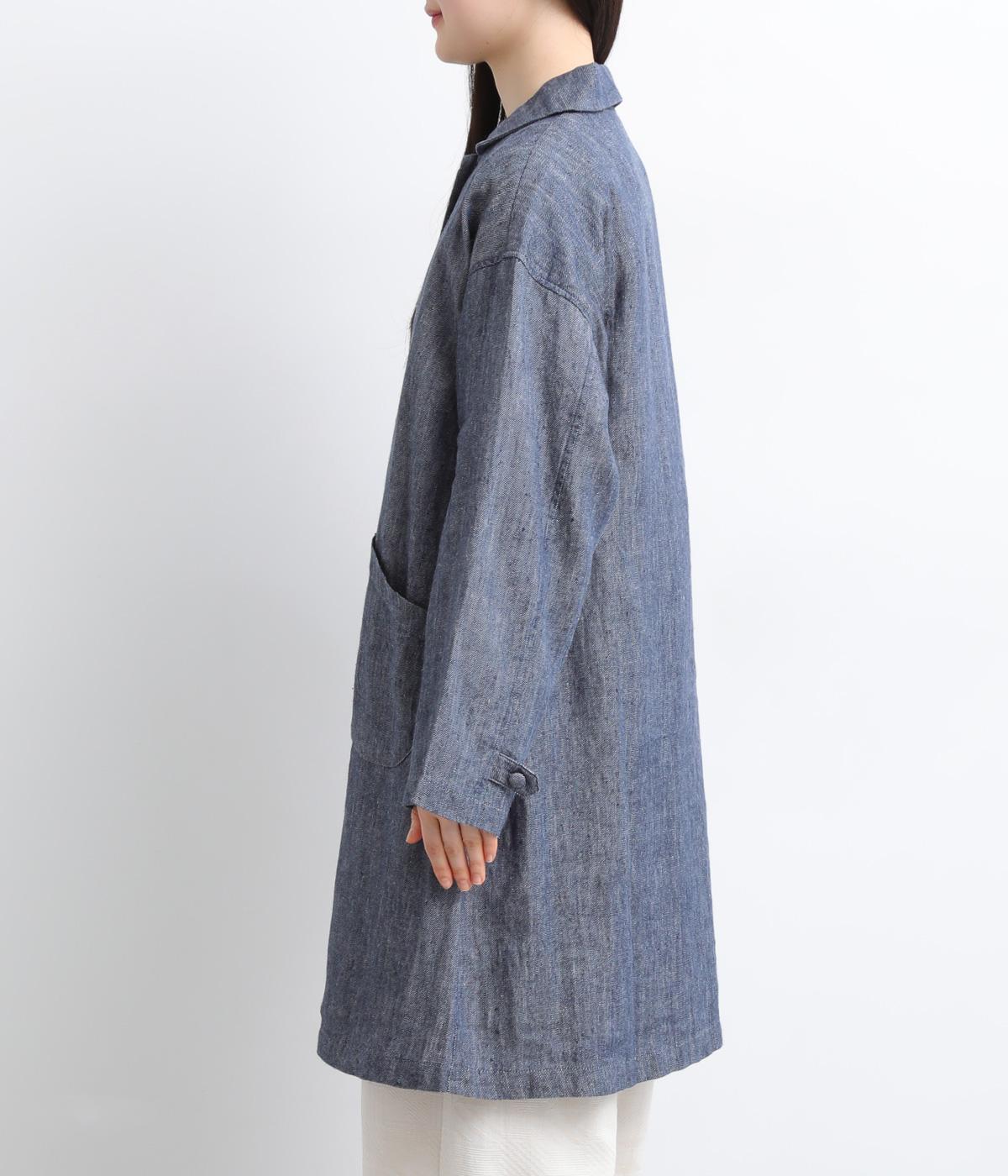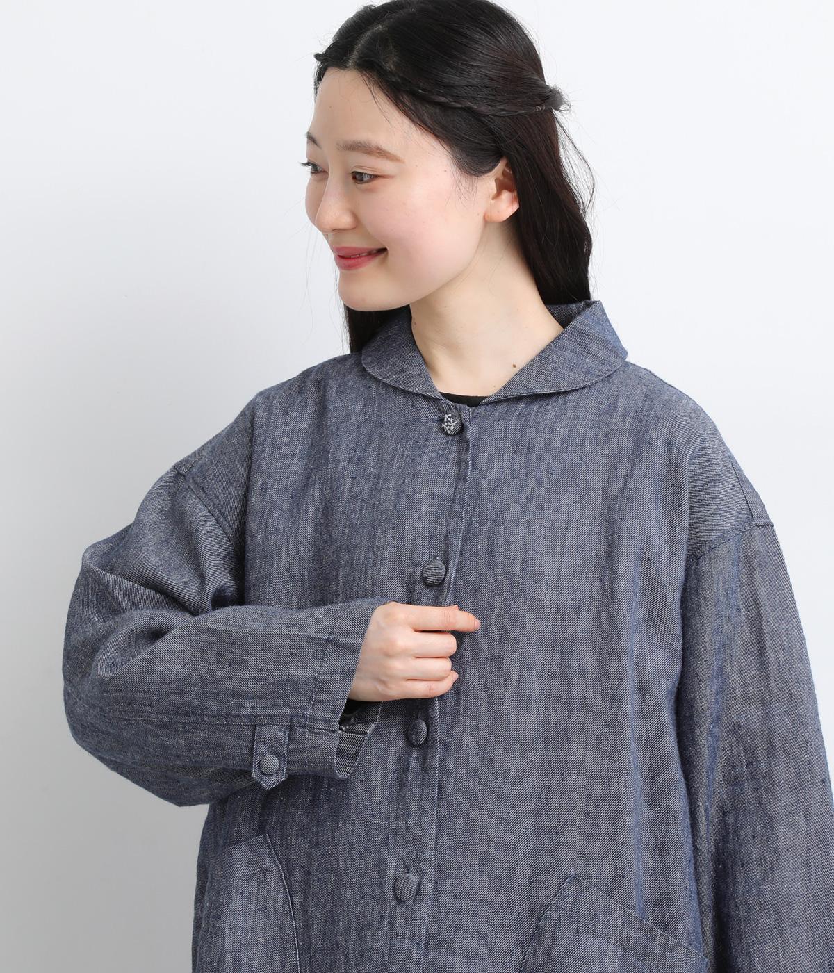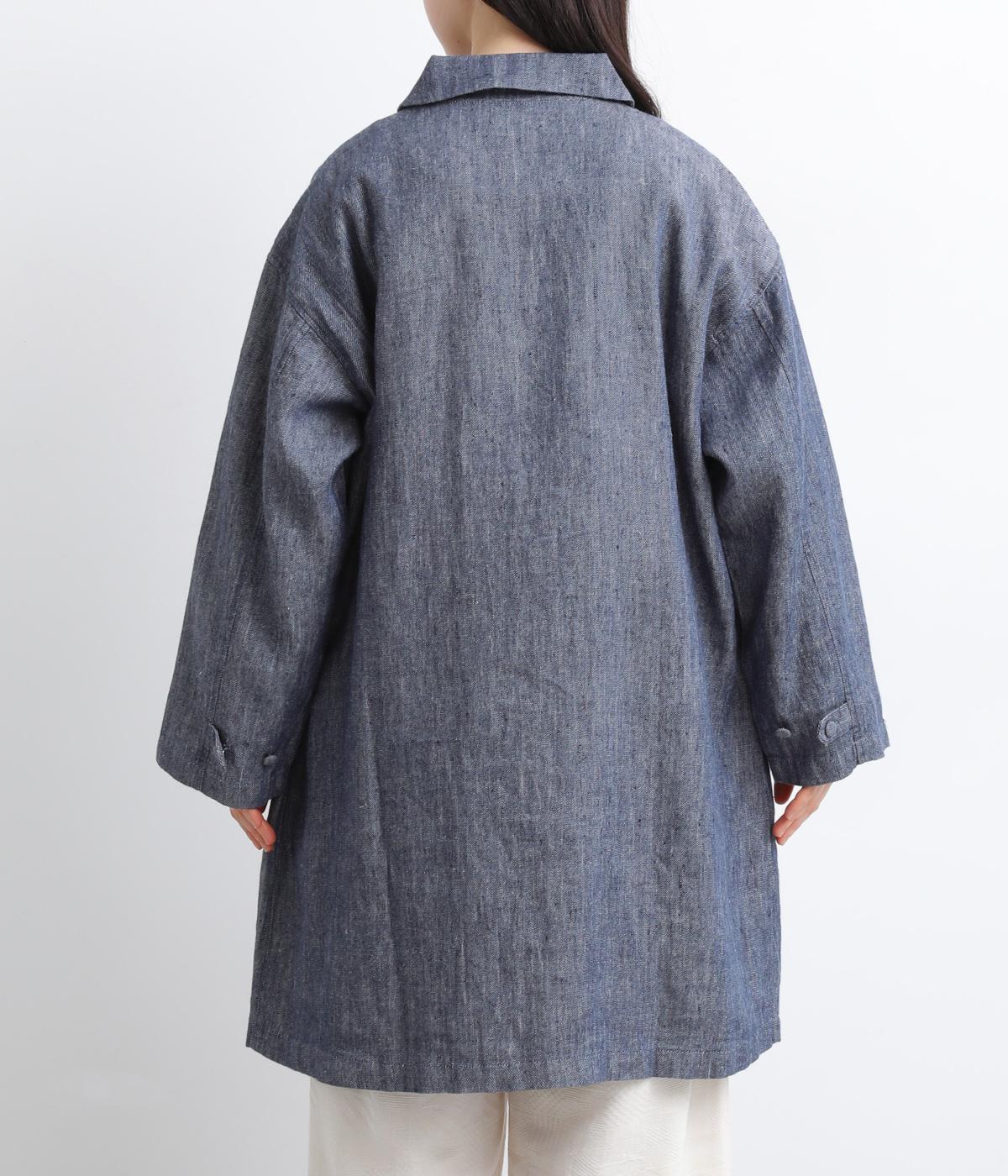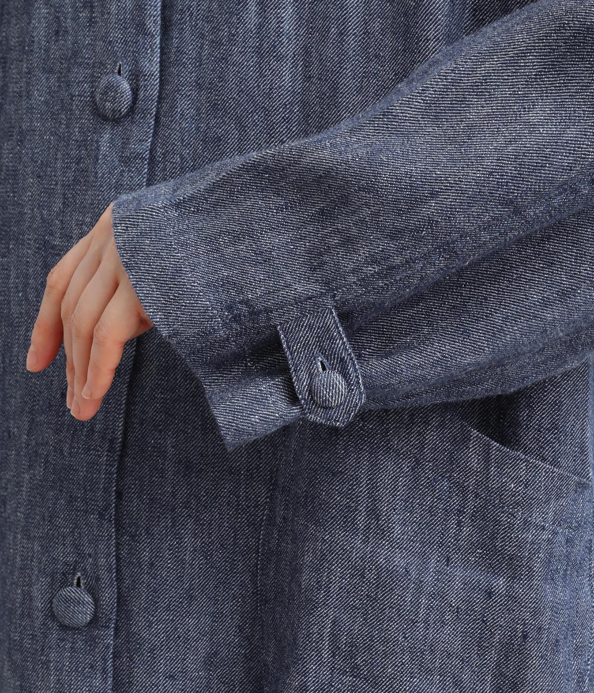 リネンを綾織りで仕立てた生地は、さらっとした手ざわりと軽やかな着用感が魅力。ほどよいハリがありながらも、やわらかく動きになじみます。織りの表情が、ナチュラルな風合いを引き立てる生地感です。