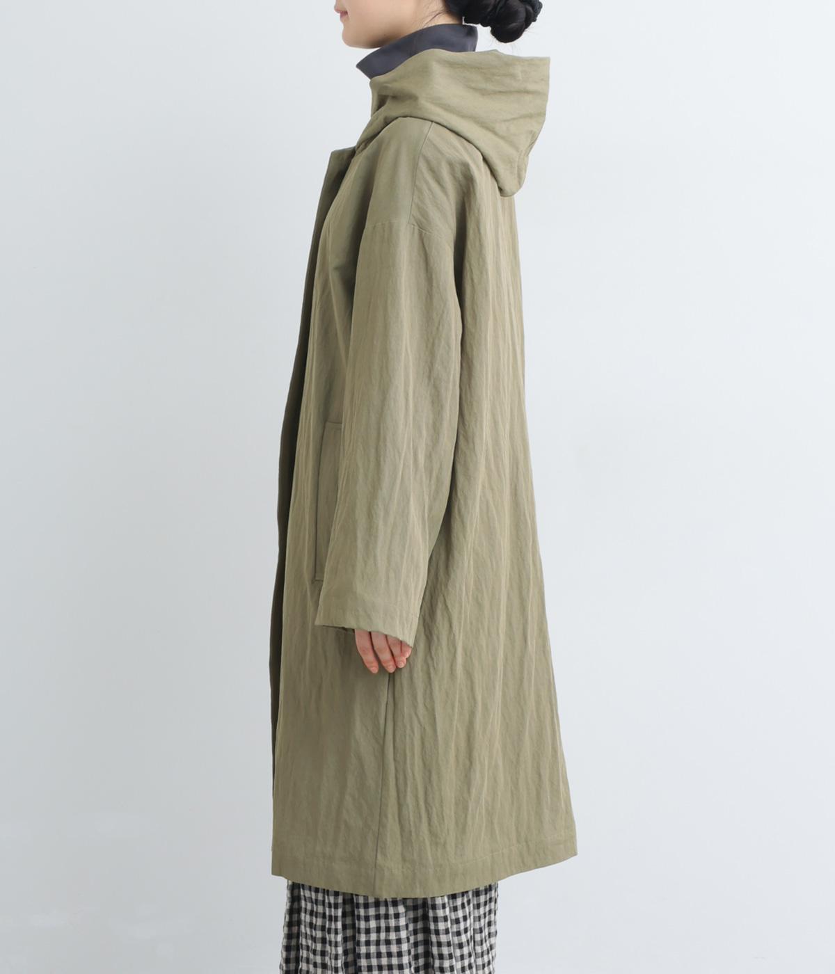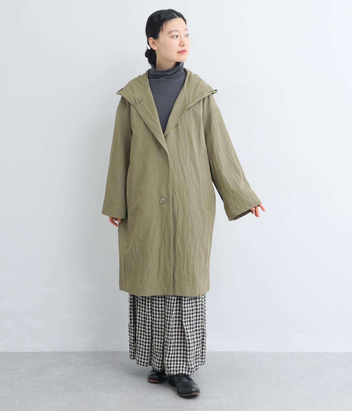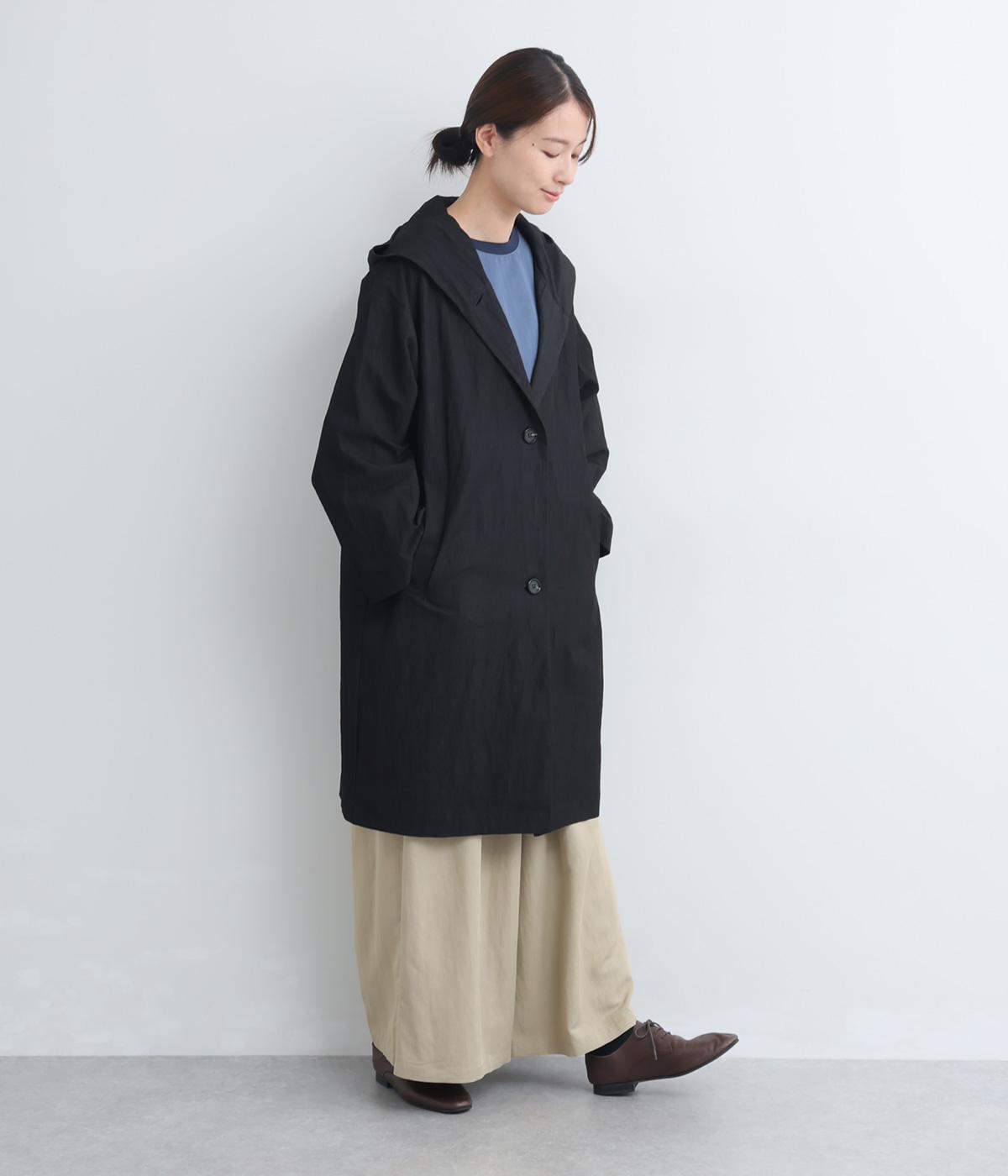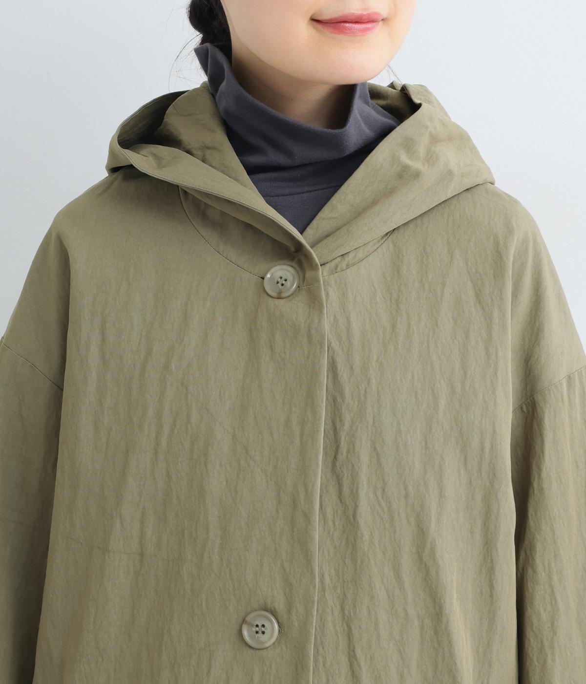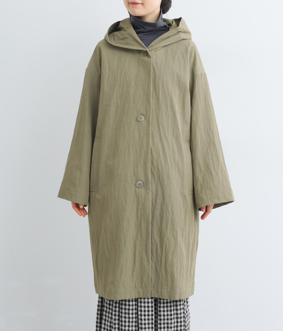 すっきりとしたタテシルエットにニュアンスのある生地感で、シンプルながらもサマになる一着。カジュアルさを醸すフードは、ボタンのあけ具合によって大きな襟のように見えたり印象チェンジのアレンジがたのしめます。