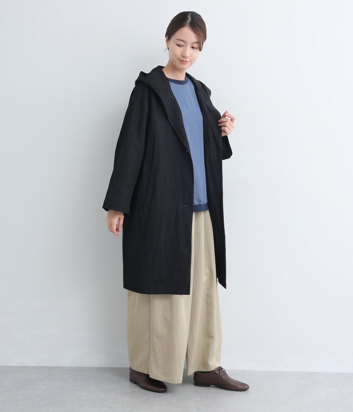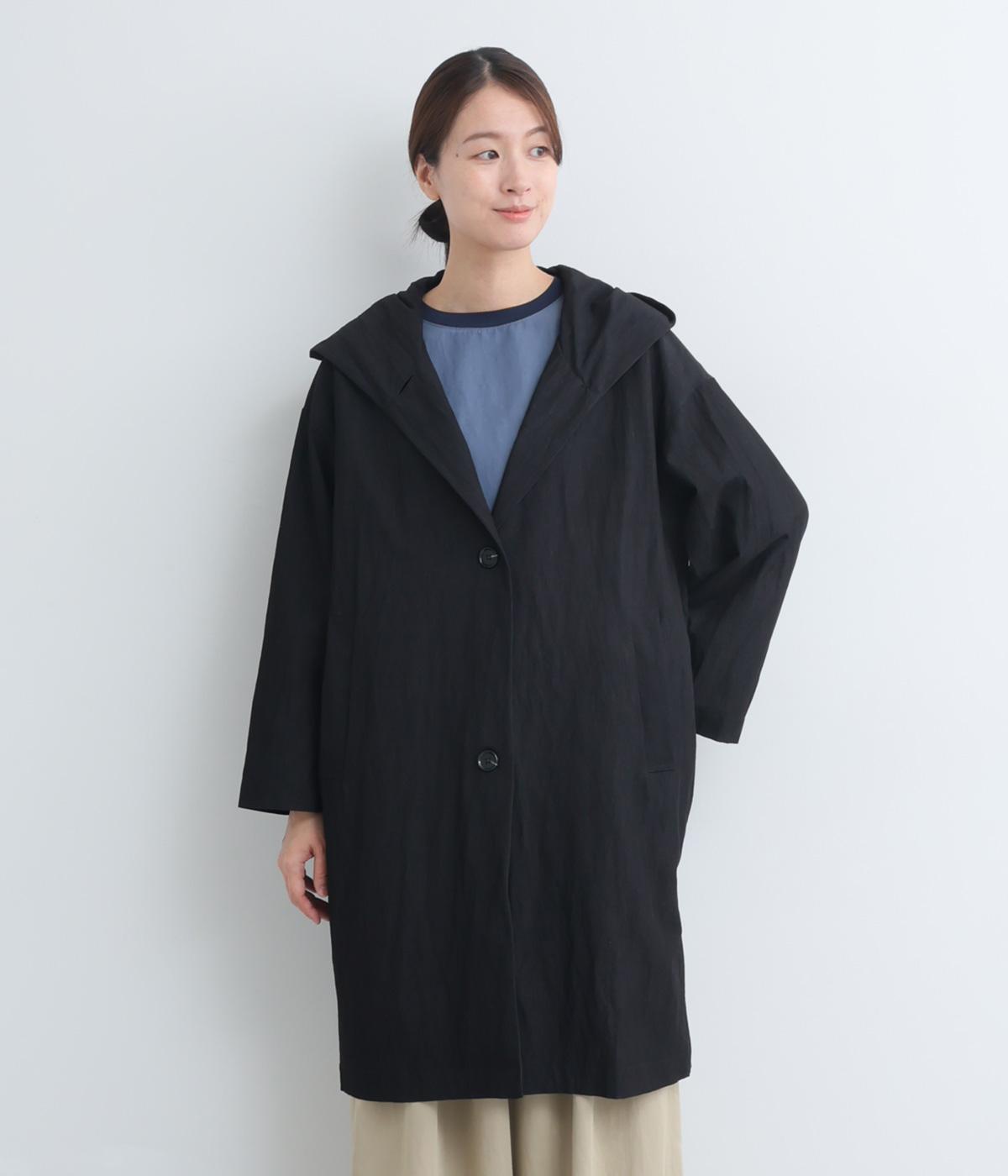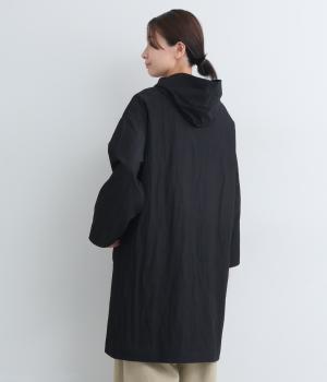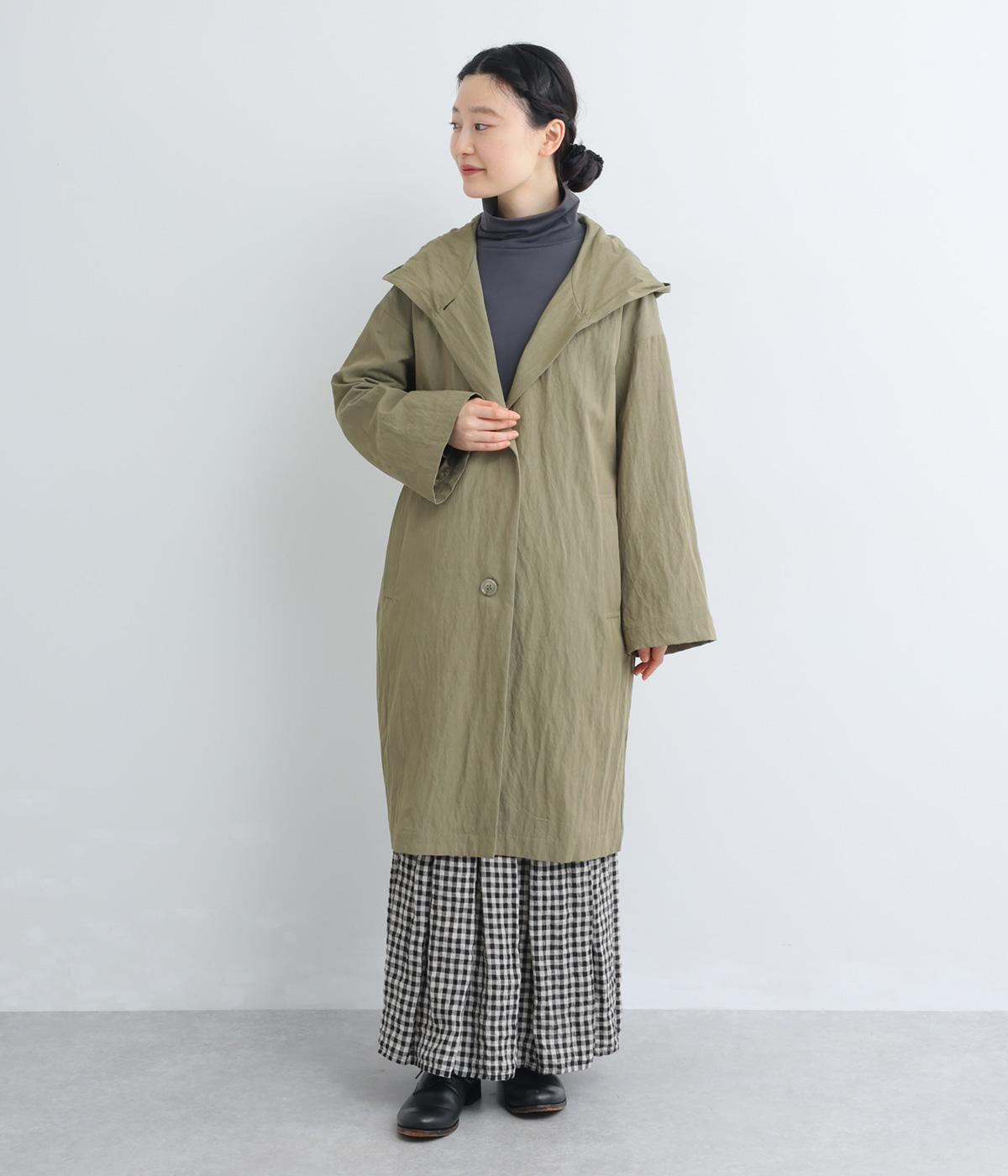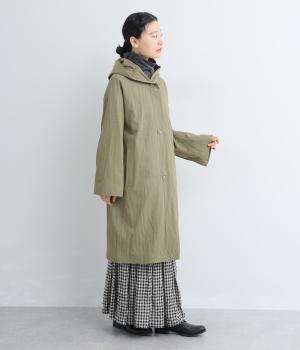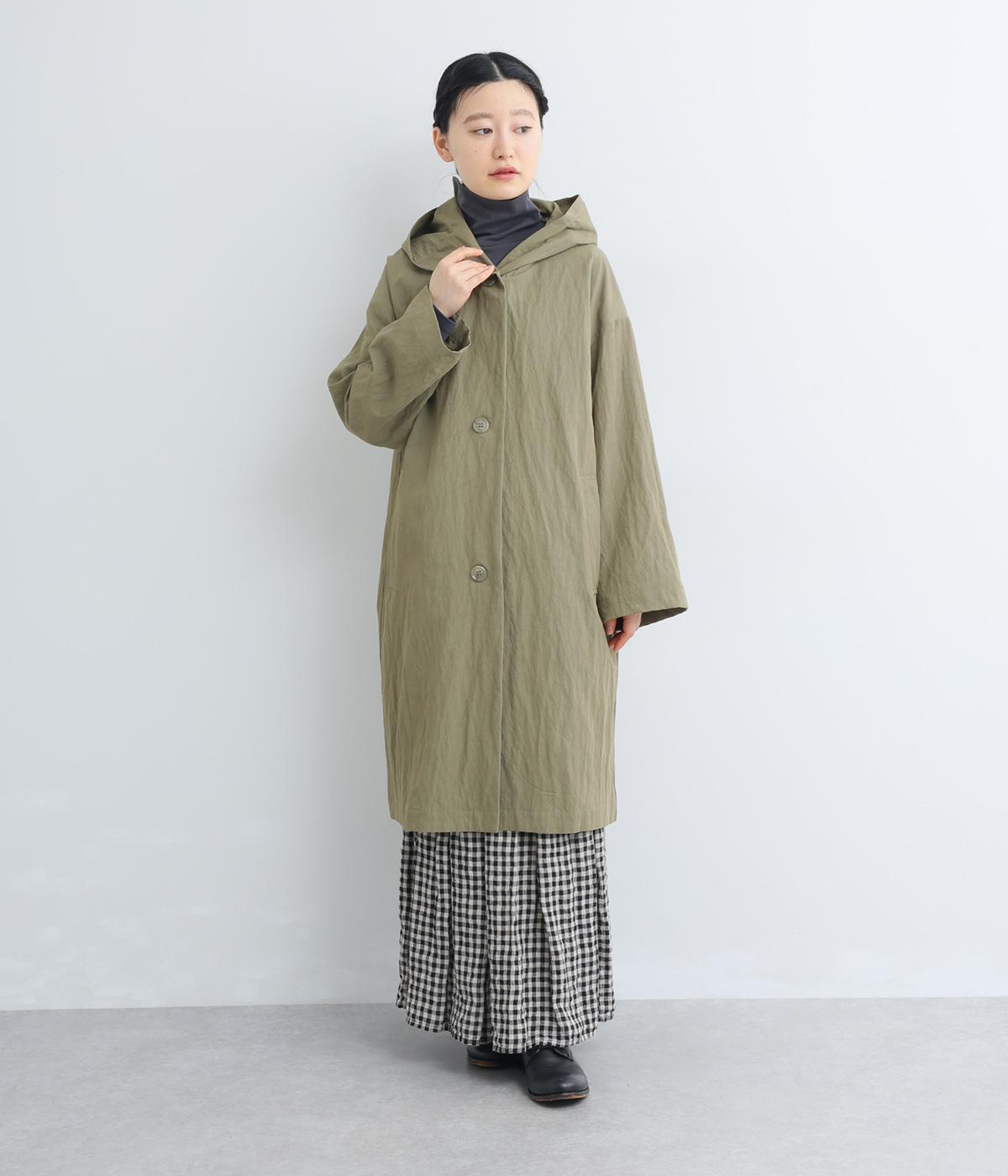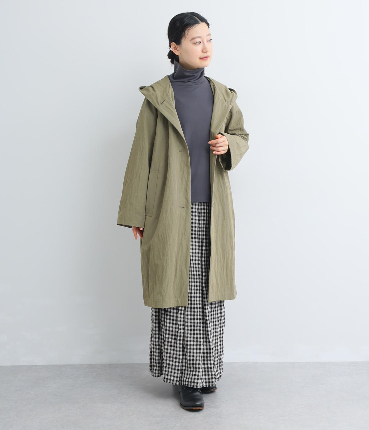 すっきりとしたタテシルエットにニュアンスのある生地感で、シンプルながらもサマになる一着。カジュアルさを醸すフードは、ボタンのあけ具合によって大きな襟のように見えたり印象チェンジのアレンジがたのしめます。