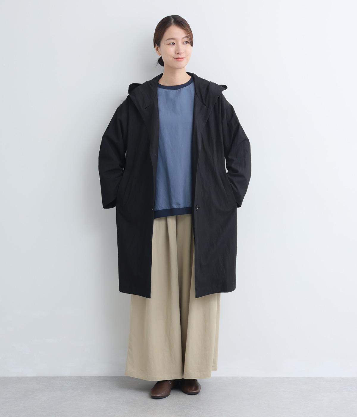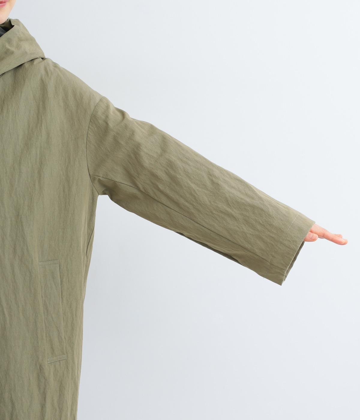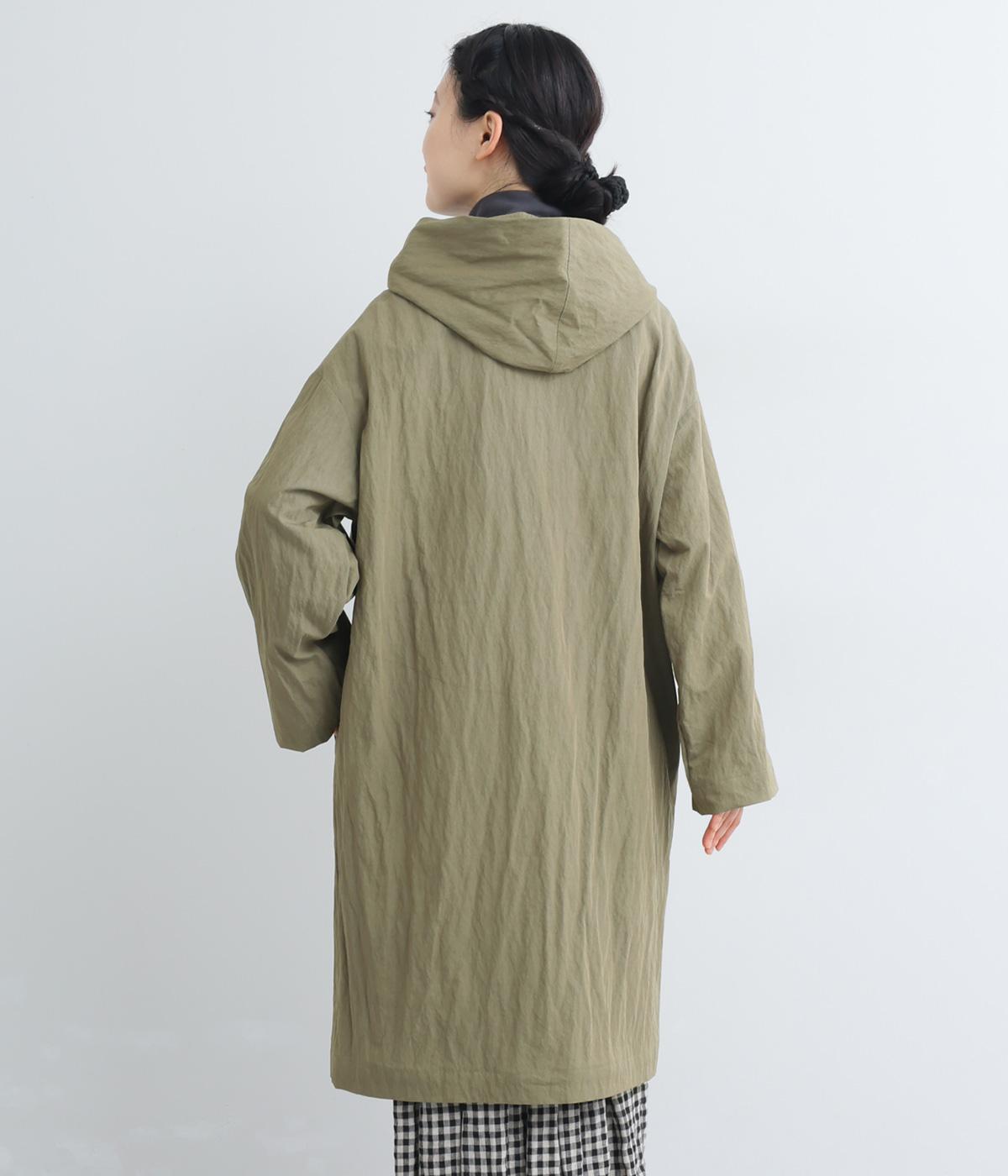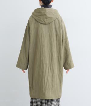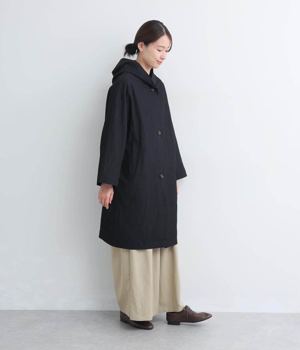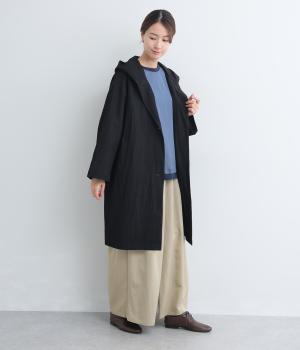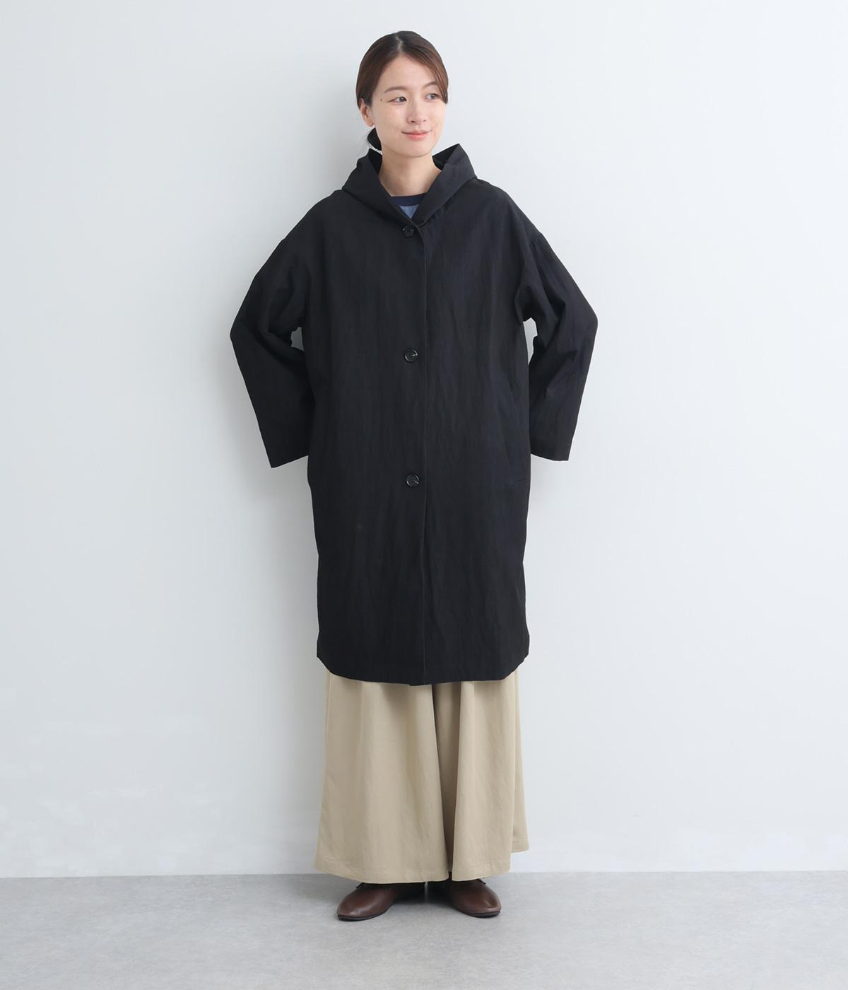 すっきりとしたタテシルエットにニュアンスのある生地感で、シンプルながらもサマになる一着。カジュアルさを醸すフードは、ボタンのあけ具合によって大きな襟のように見えたり印象チェンジのアレンジがたのしめます。