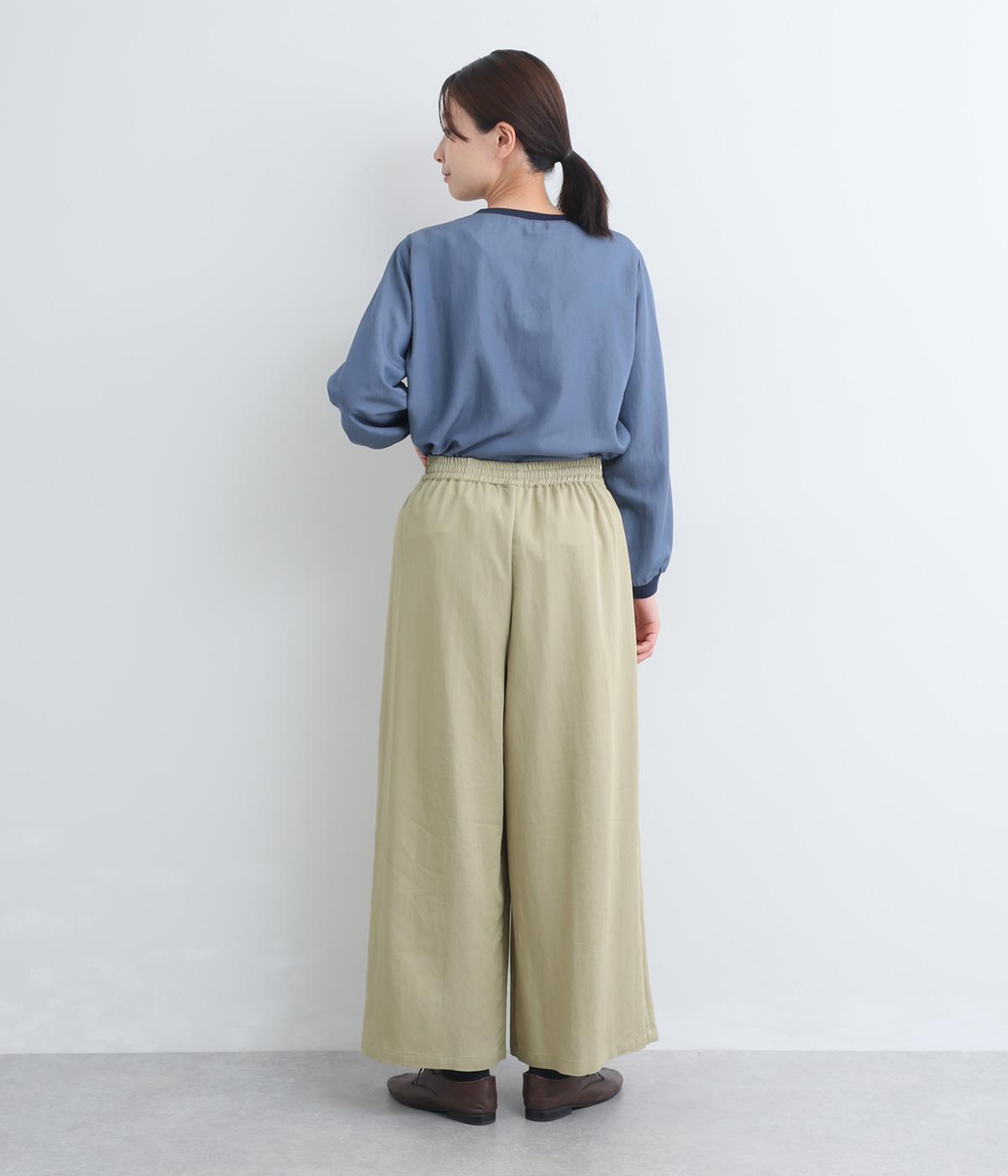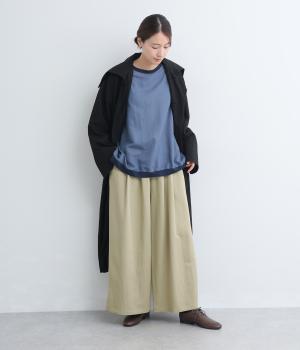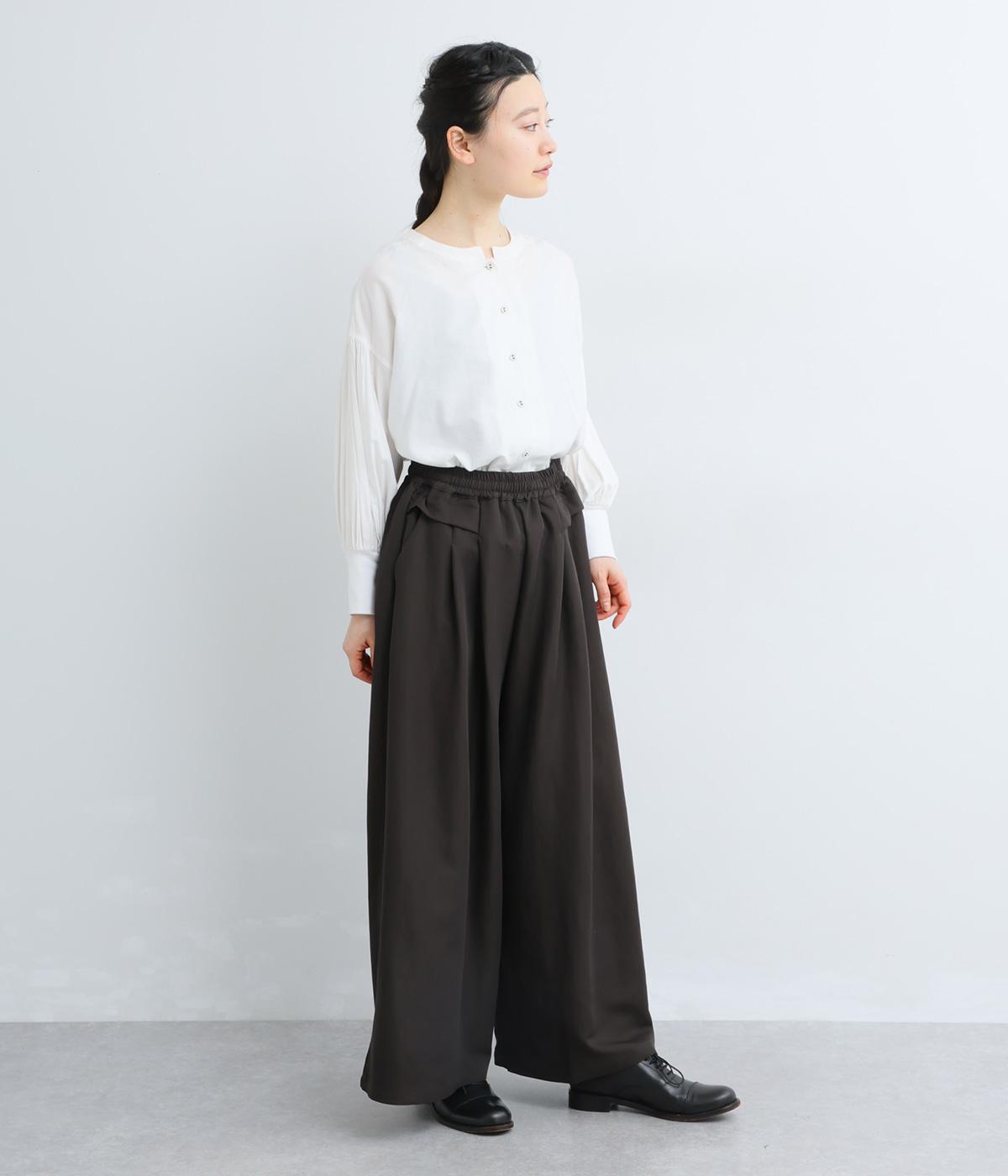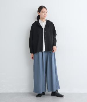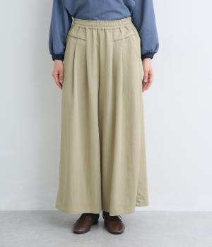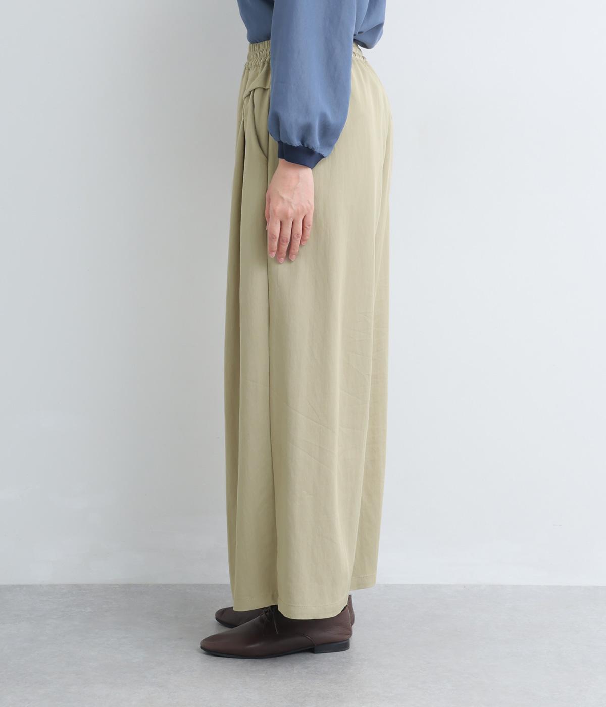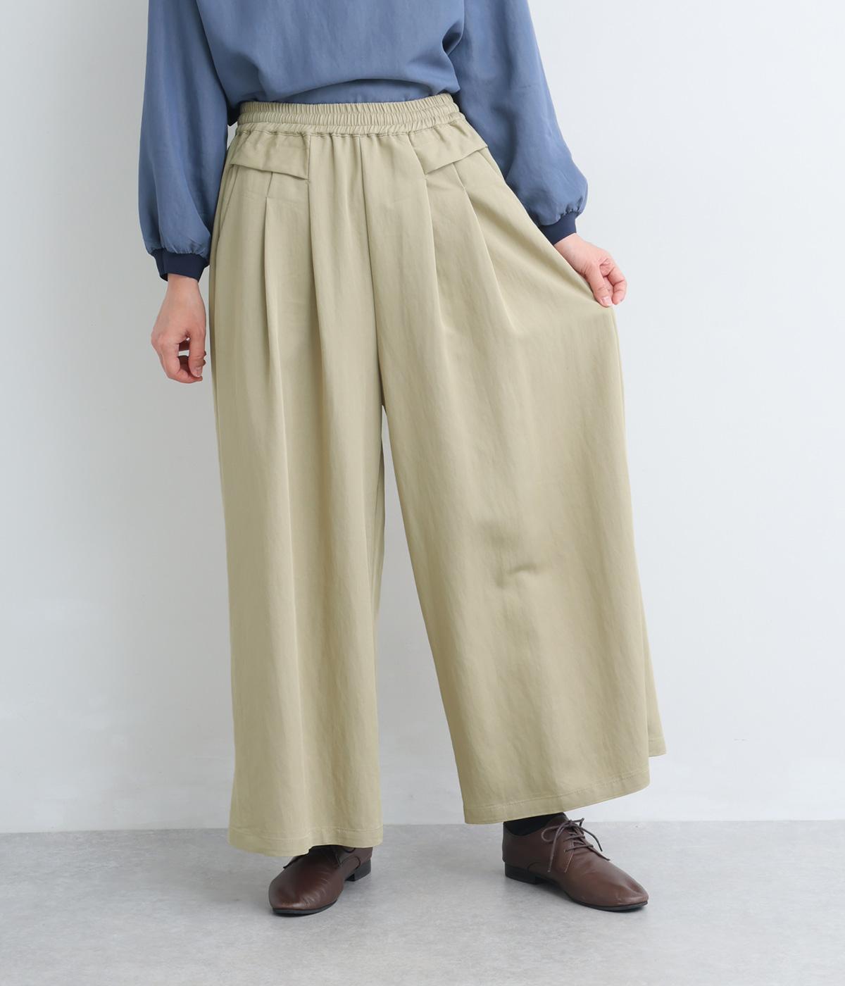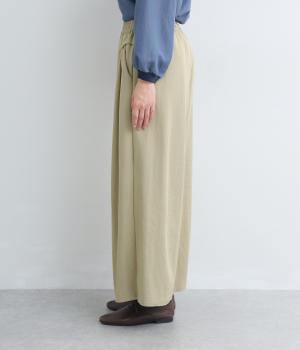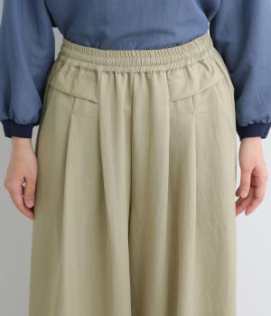 ゆったりとしてきれいなドレープ感が魅力のワイドパンツ。フラップのように折り込んだタックまわりのディテールが特徴的で、さり気なくデザインを盛り込んでいます。ウエストはオールゴム&内紐のイージー仕様でデイリーに最適。