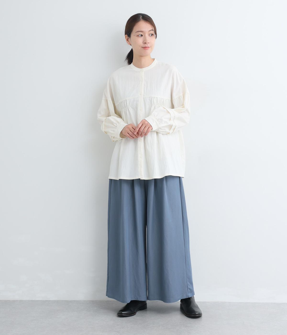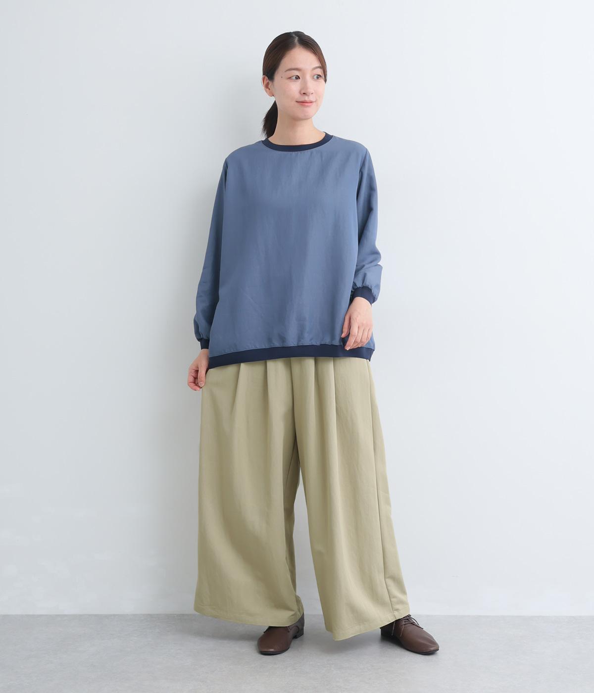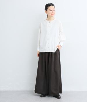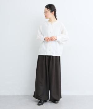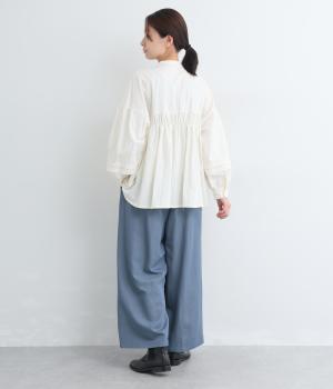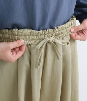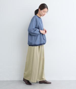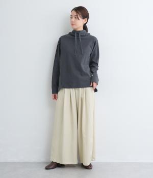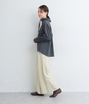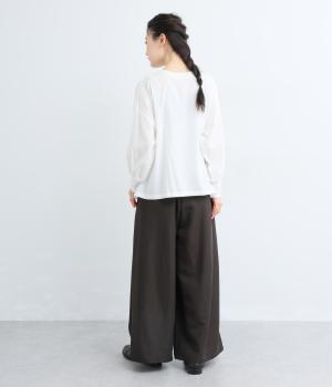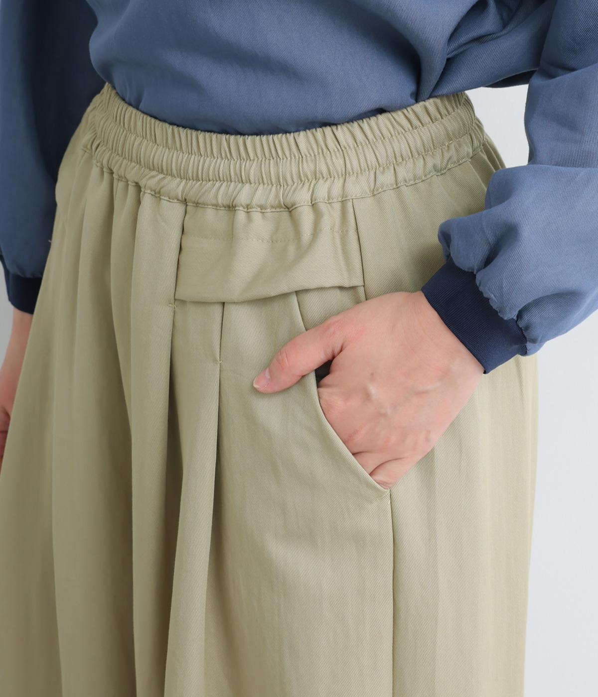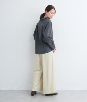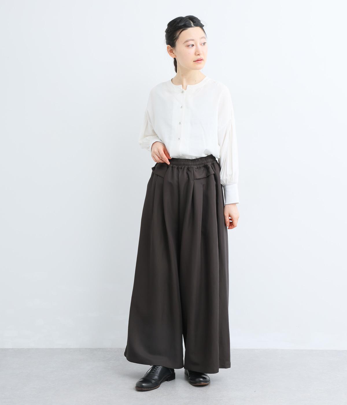 ゆったりとしてきれいなドレープ感が魅力のワイドパンツ。フラップのように折り込んだタックまわりのディテールが特徴的で、さり気なくデザインを盛り込んでいます。ウエストはオールゴム&内紐のイージー仕様でデイリーに最適。