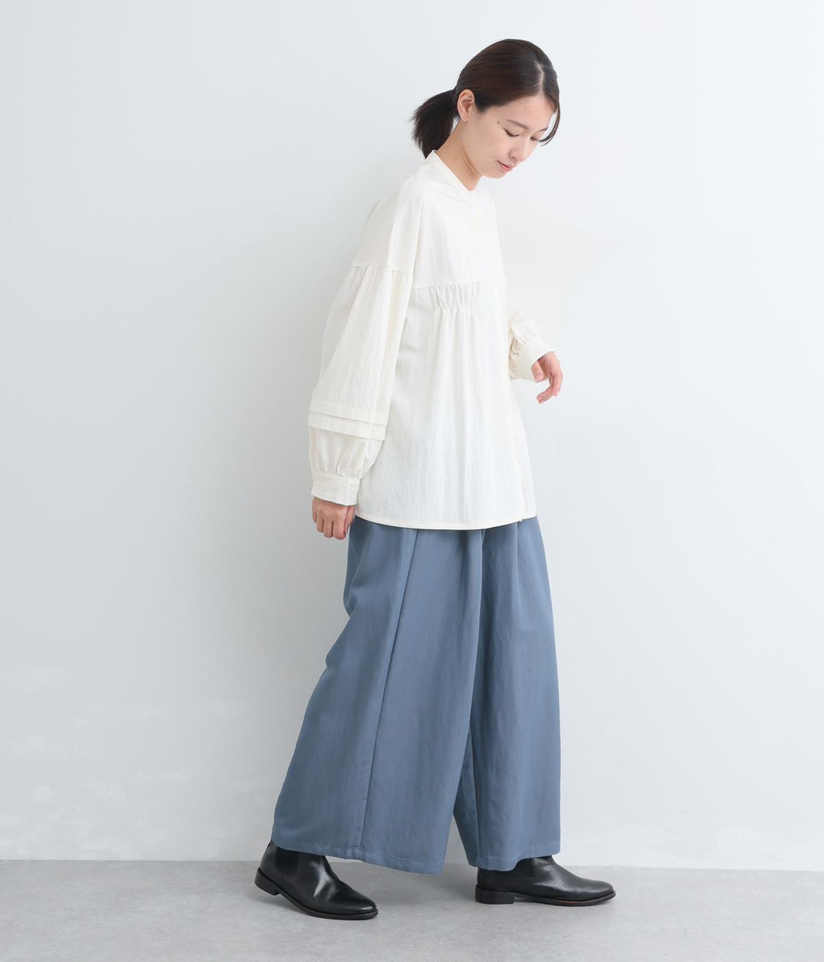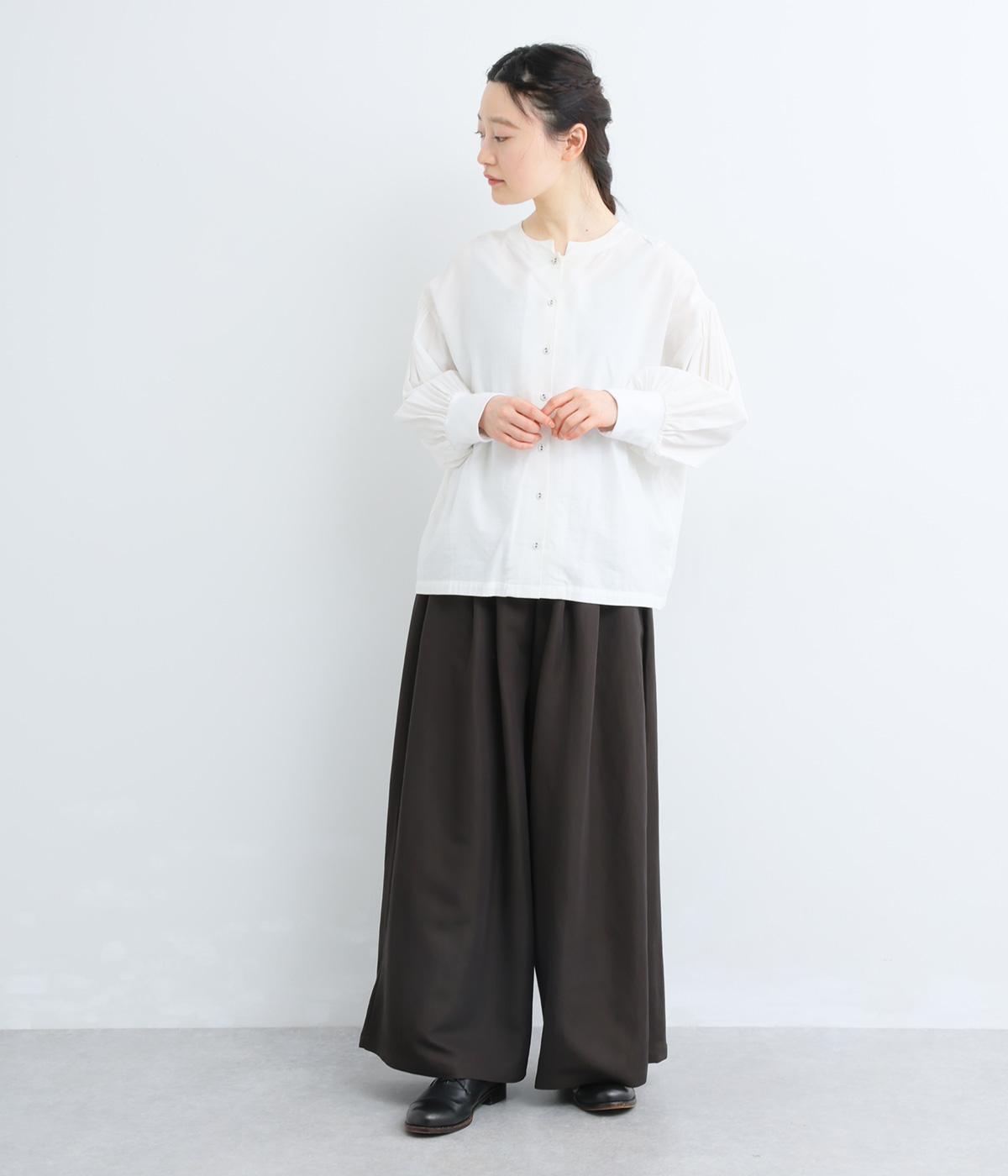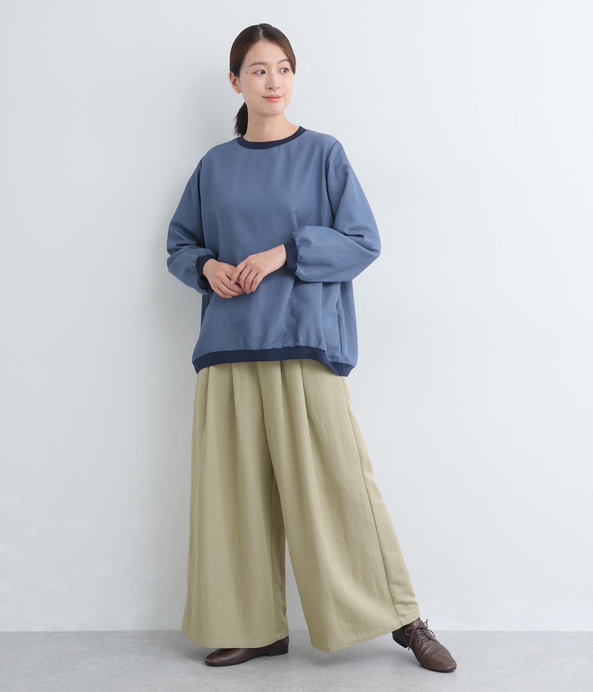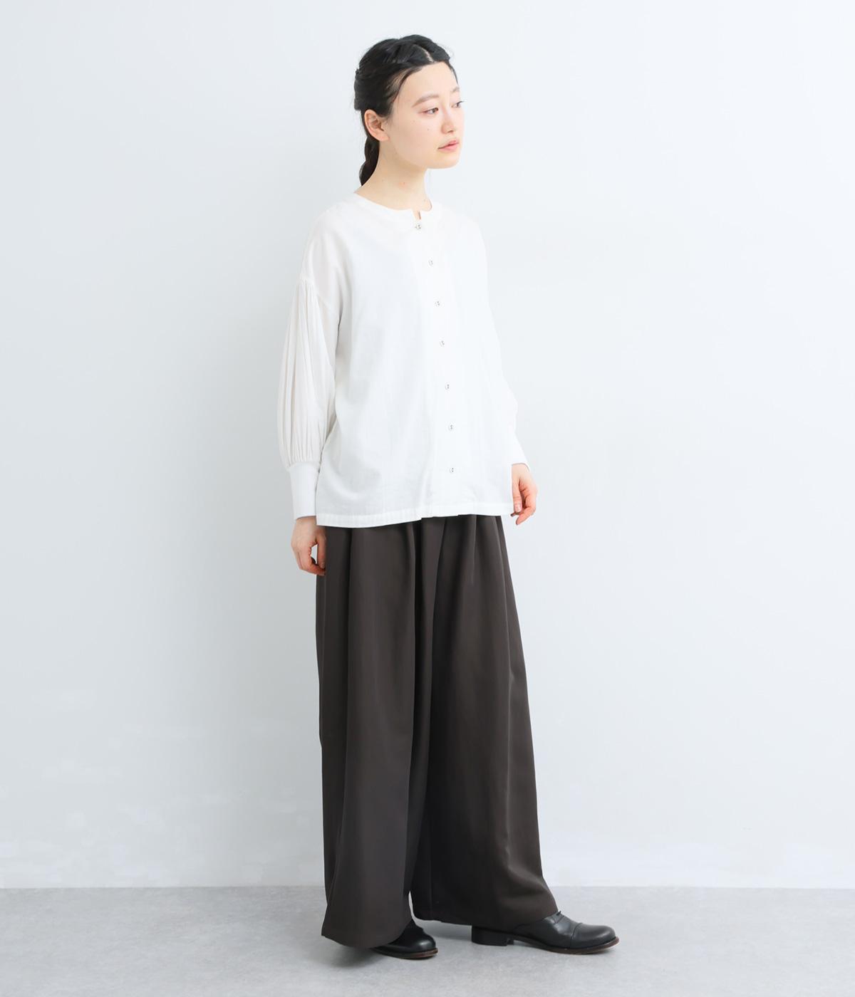 ゆったりとしてきれいなドレープ感が魅力のワイドパンツ。フラップのように折り込んだタックまわりのディテールが特徴的で、さり気なくデザインを盛り込んでいます。ウエストはオールゴム&内紐のイージー仕様でデイリーに最適。