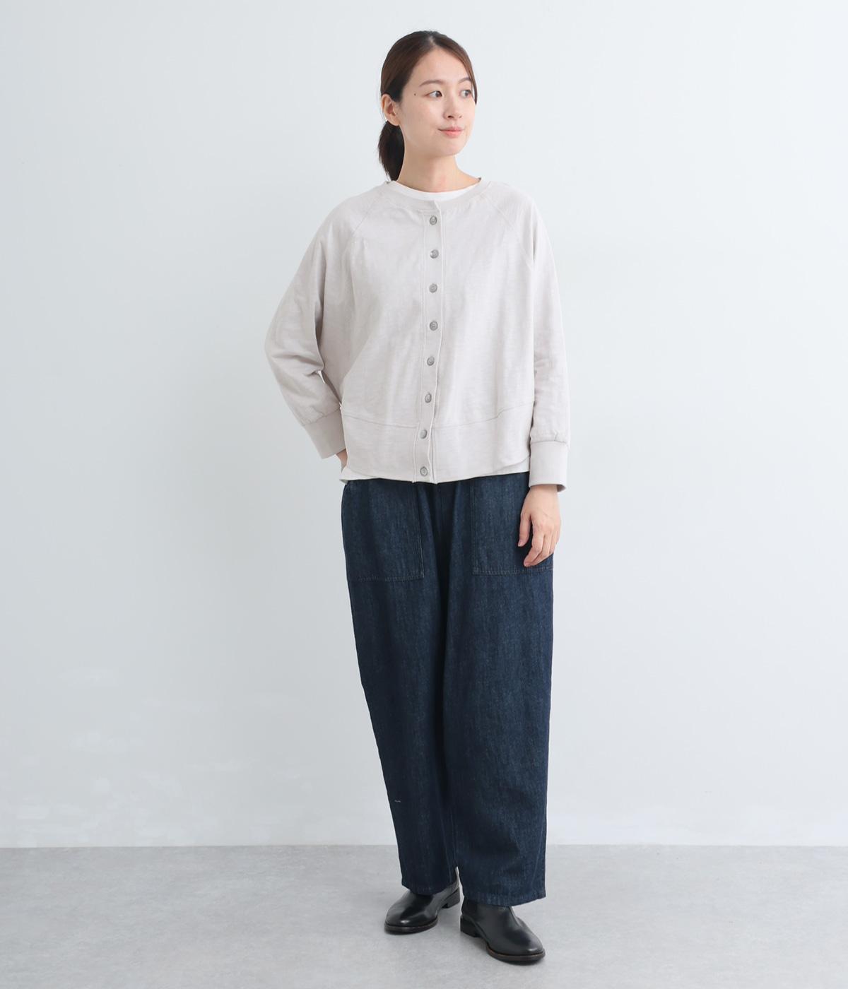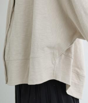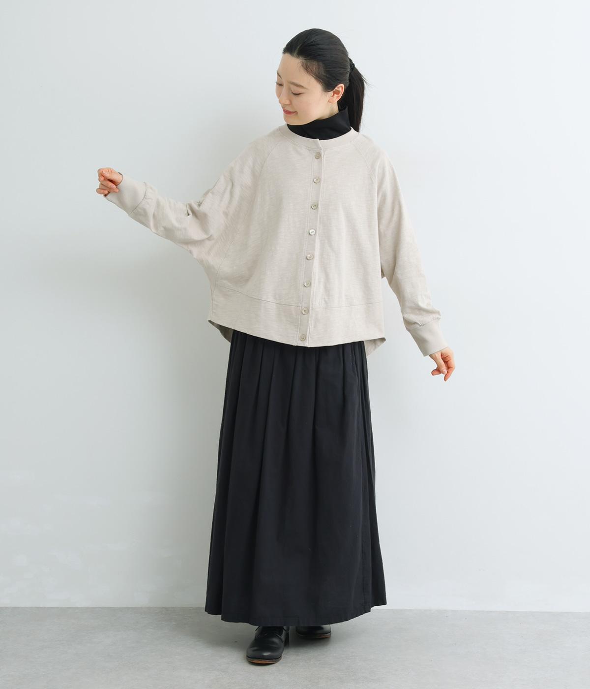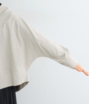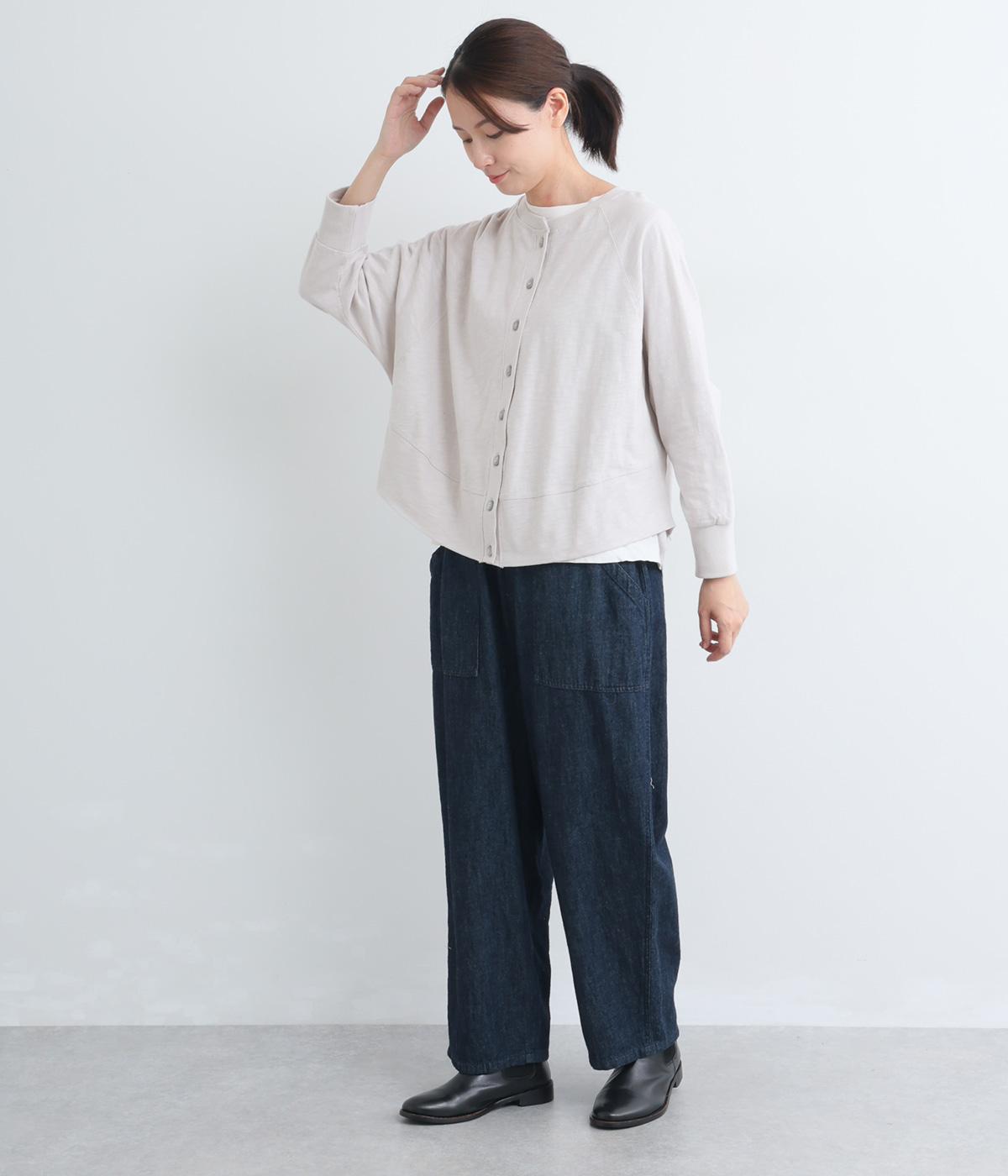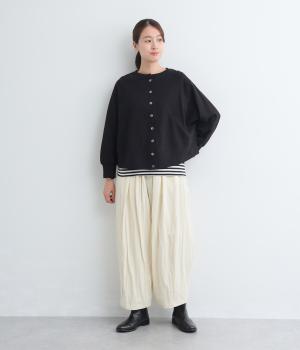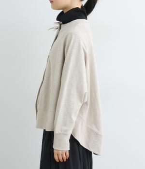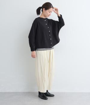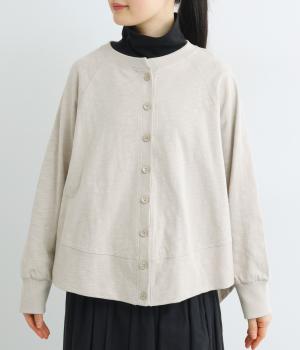 ゆったりとしたドルマンスリーブに、体を包み込むような後ろ裾が特徴的なカーディガン。カットソー生地でカジュアルに羽織りやすく、それでいてスタイリング全体をやわらかな雰囲気にまとめてくれます。襟ぐりと袖口はリブでメリハリを。