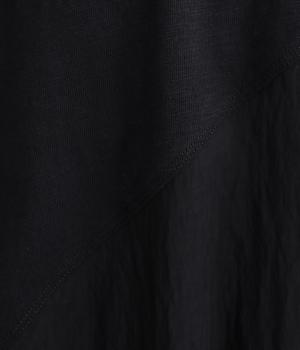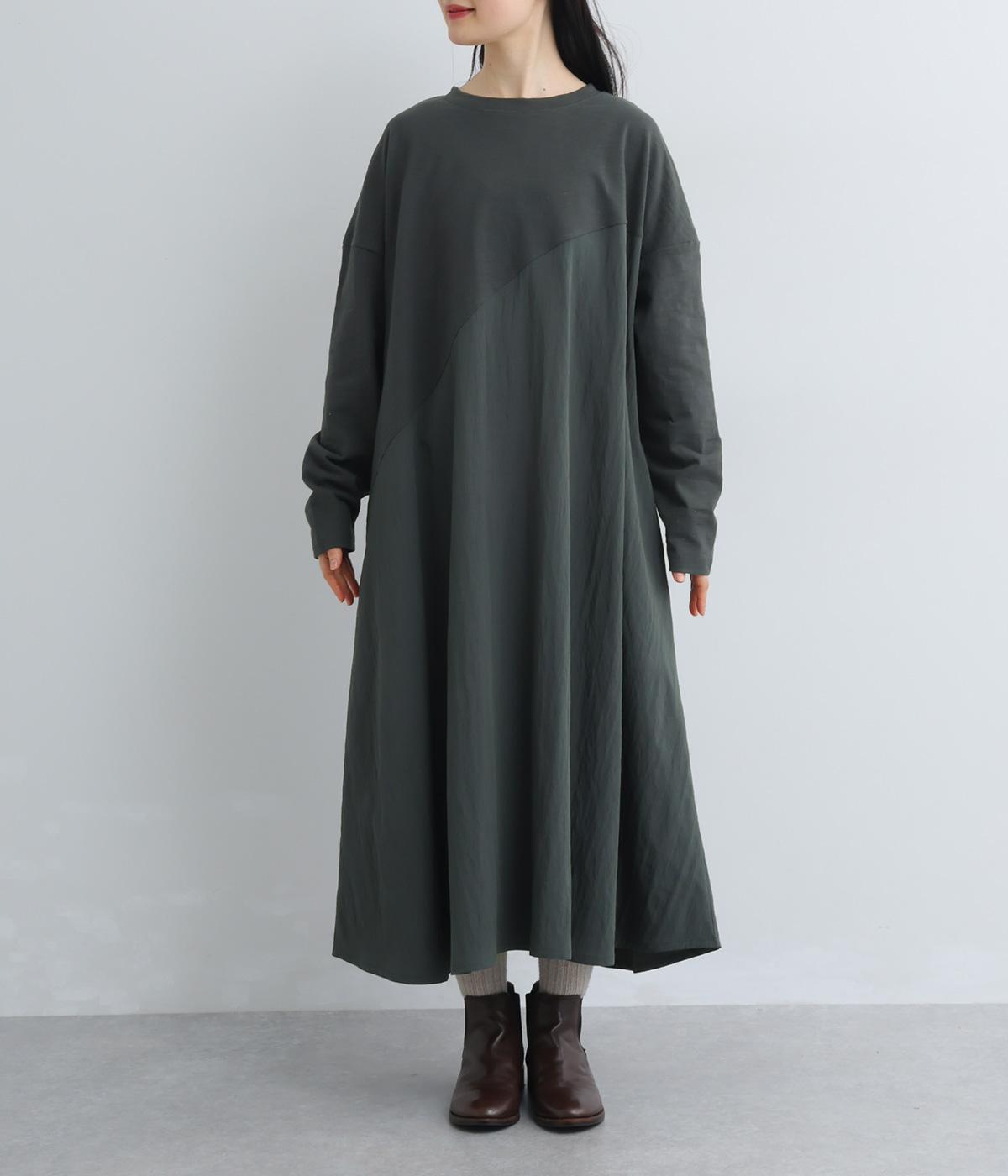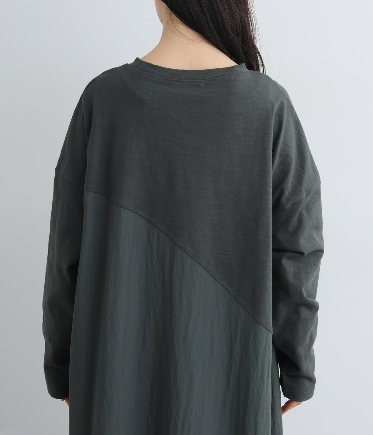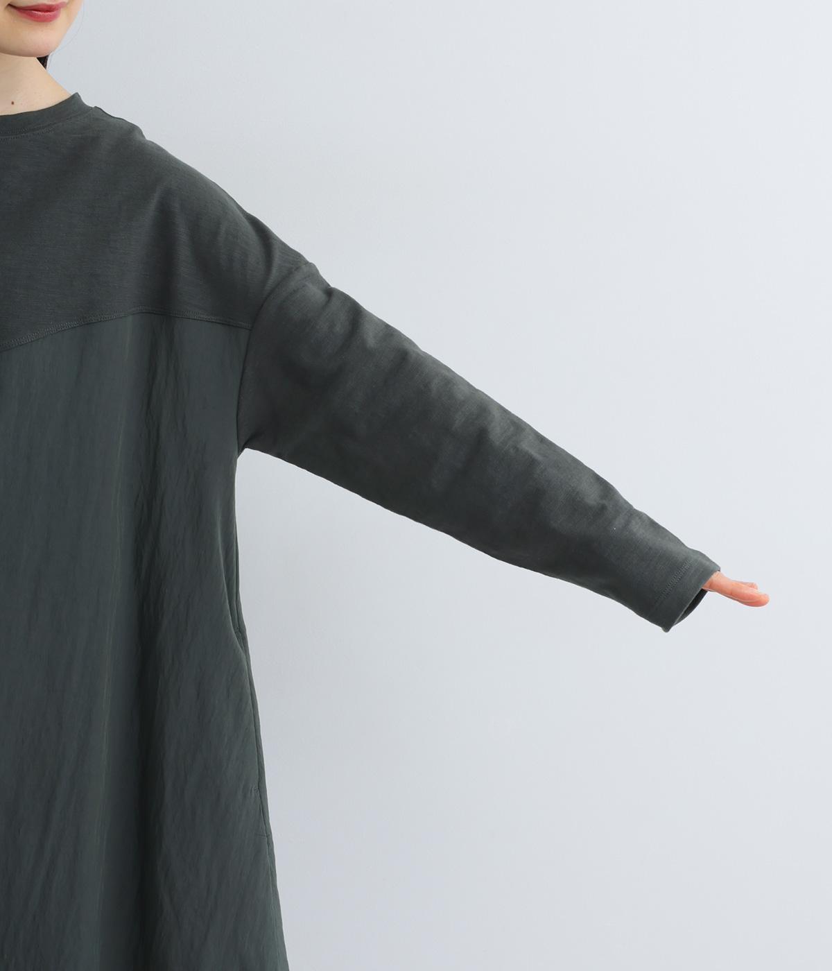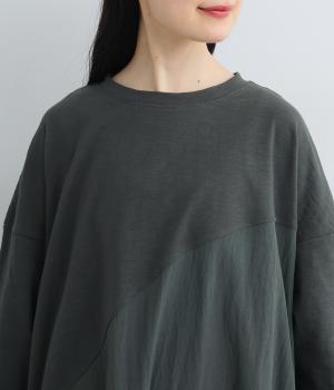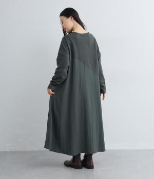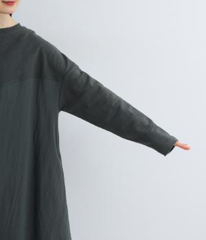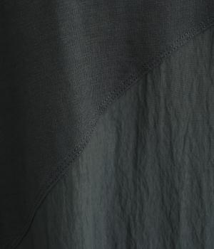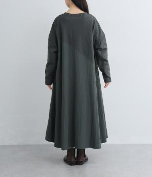 カットソーワンピースをシャリ感のあるレーヨンナイロンに切り替えて、軽やかさをお洒落感を足しました。動きの多い袖や上身頃に天竺生地を配しているので着心地よく、裾まわりは自然なドレープが生まれて優雅な印象を与えてくれます。