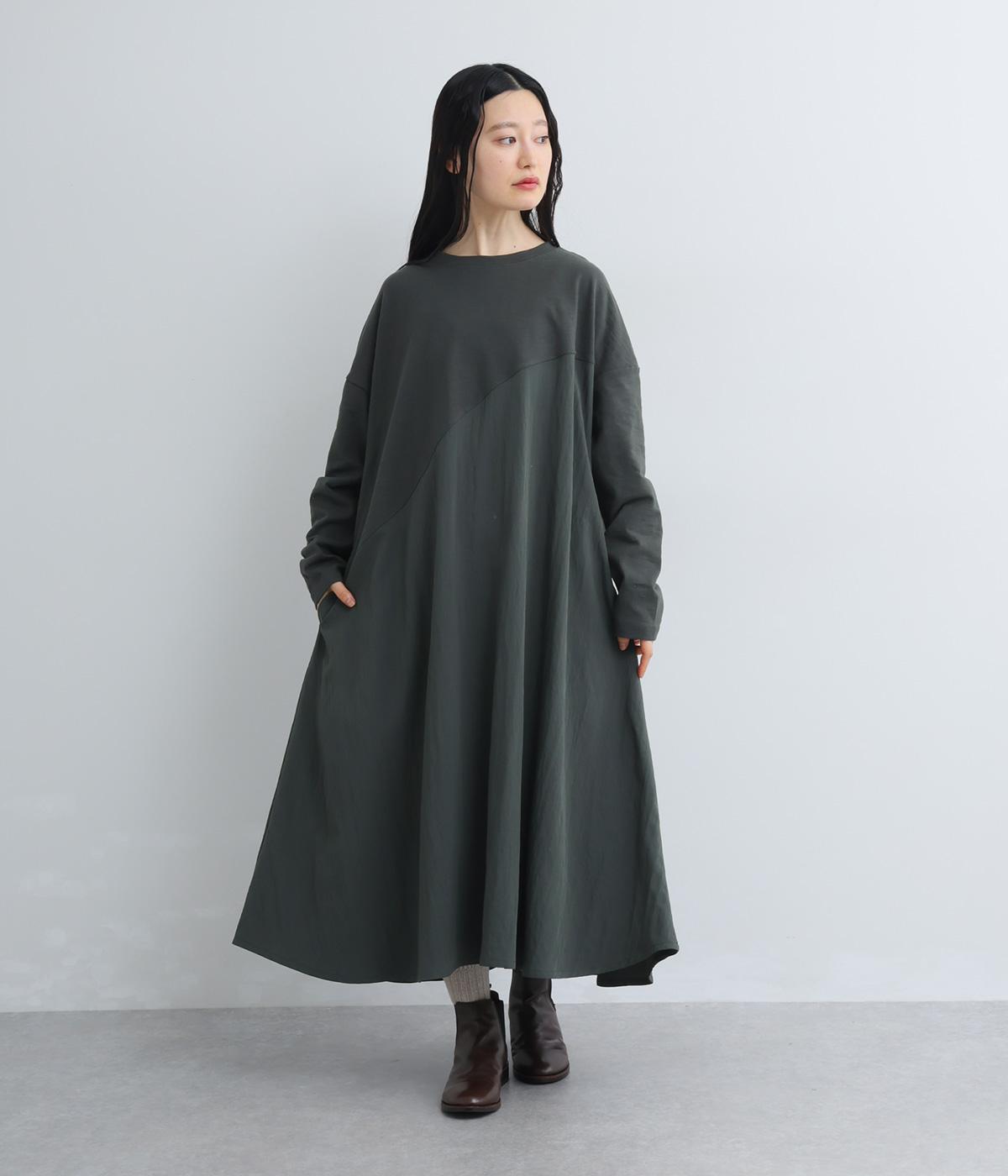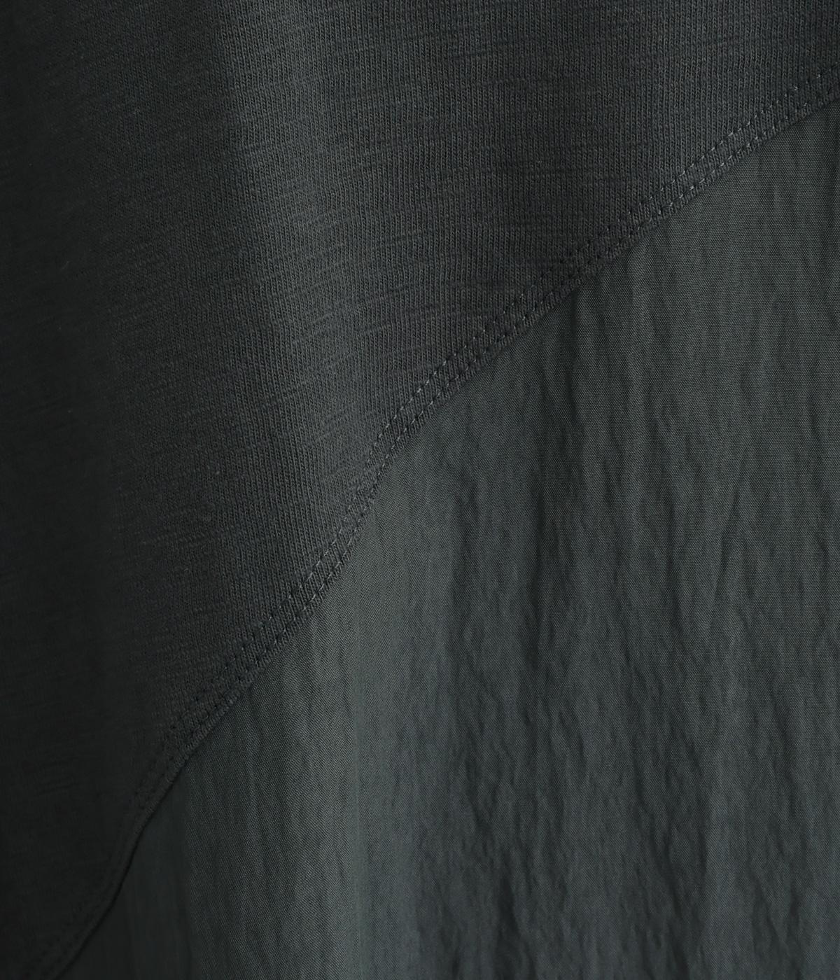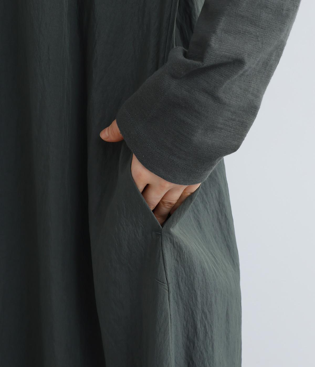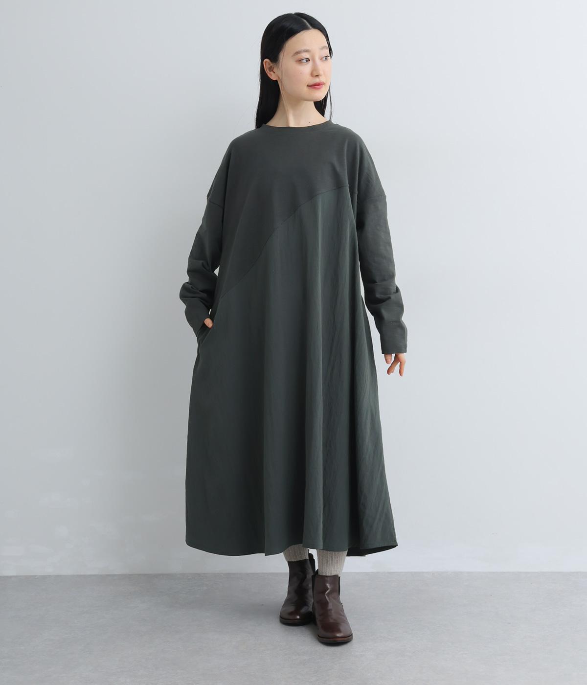 カットソーワンピースをシャリ感のあるレーヨンナイロンに切り替えて、軽やかさをお洒落感を足しました。動きの多い袖や上身頃に天竺生地を配しているので着心地よく、裾まわりは自然なドレープが生まれて優雅な印象を与えてくれます。
