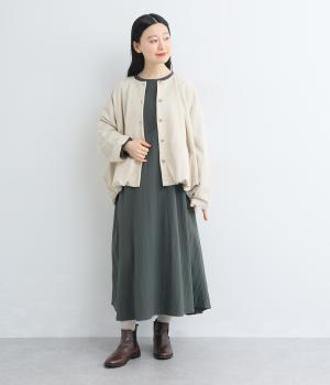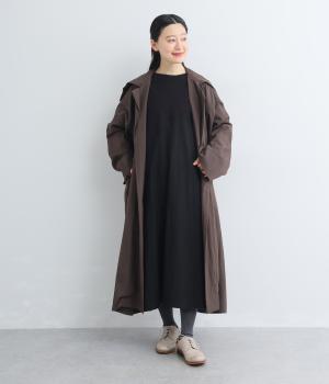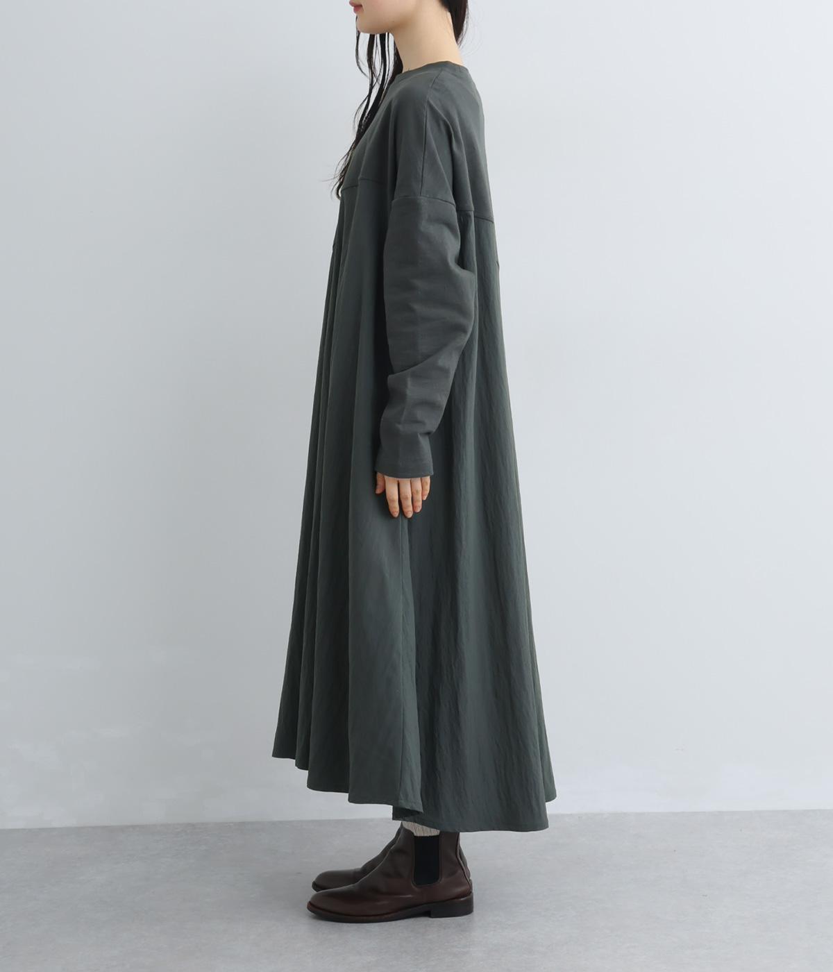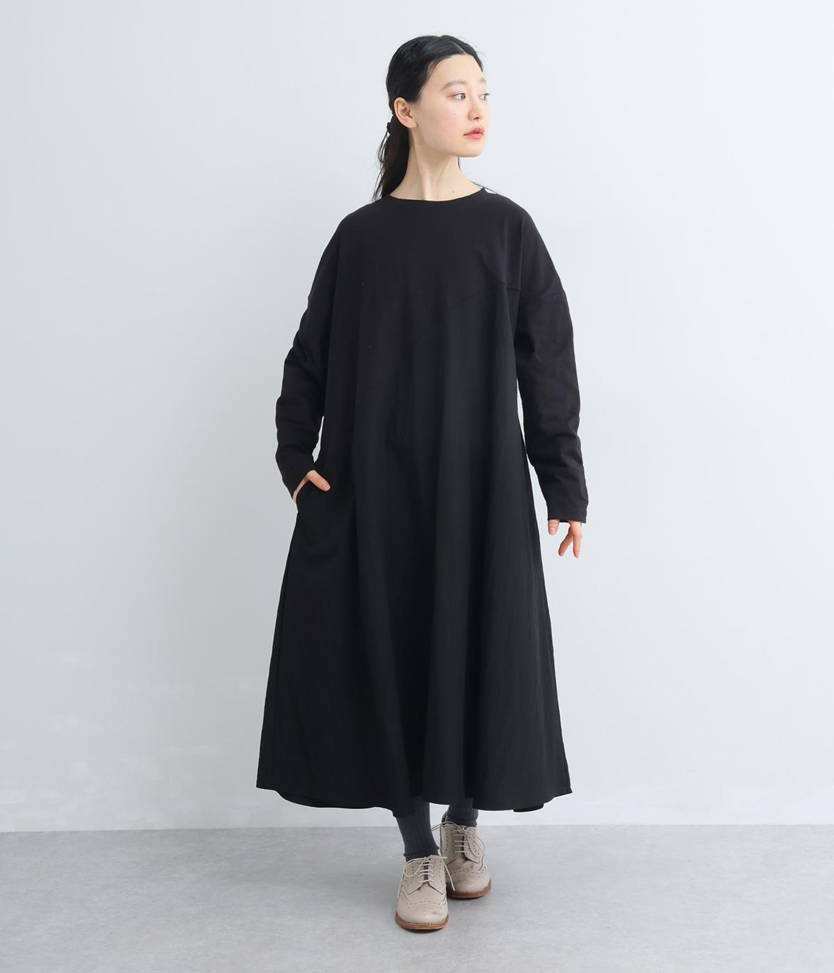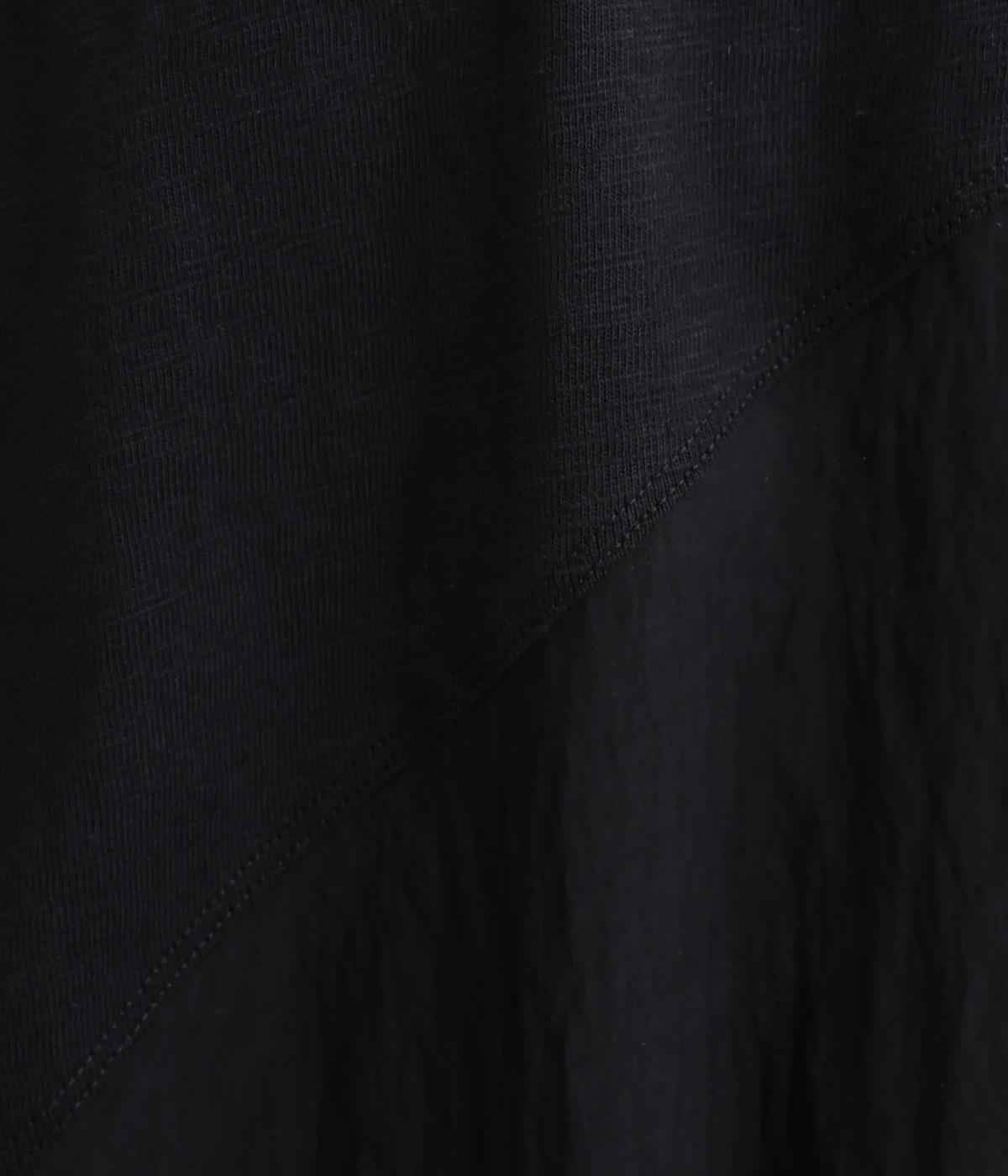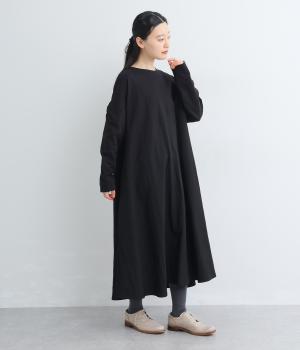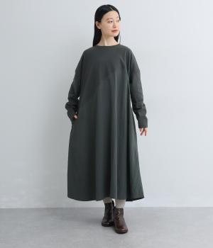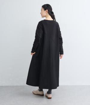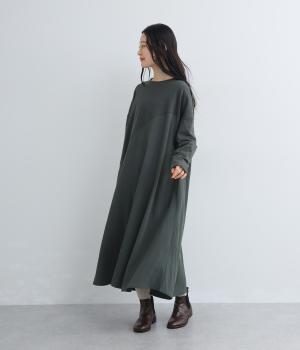 カットソーワンピースをシャリ感のあるレーヨンナイロンに切り替えて、軽やかさをお洒落感を足しました。動きの多い袖や上身頃に天竺生地を配しているので着心地よく、裾まわりは自然なドレープが生まれて優雅な印象を与えてくれます。