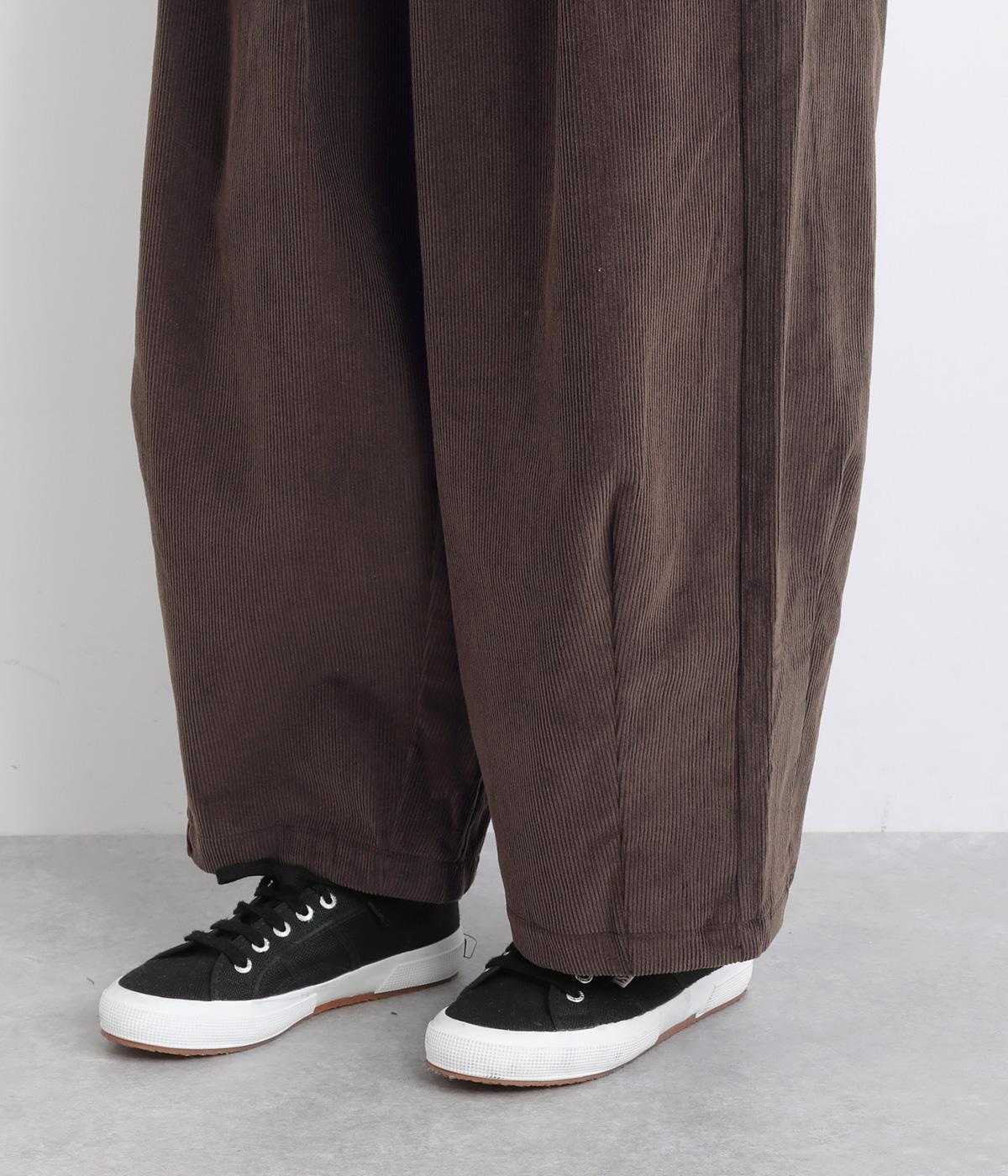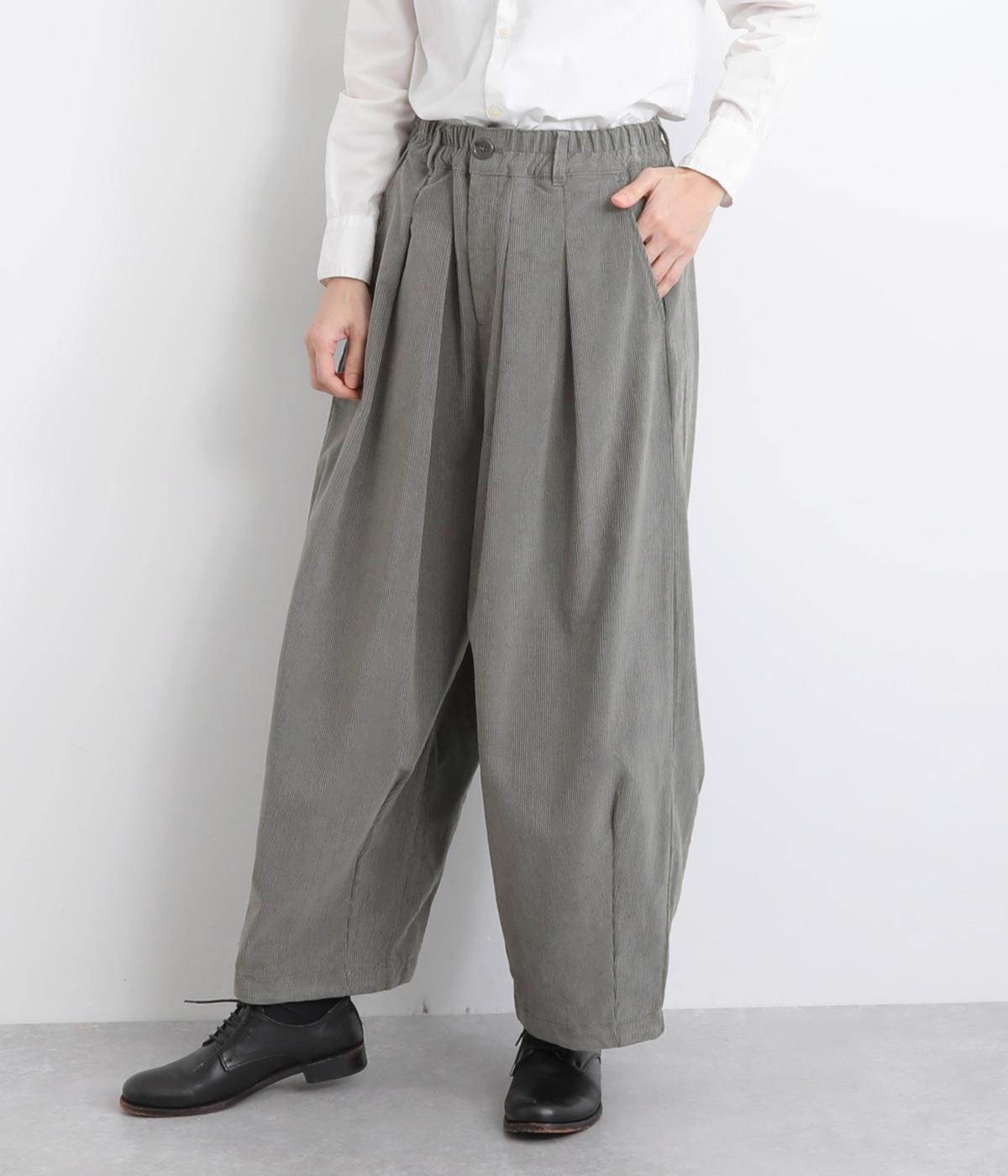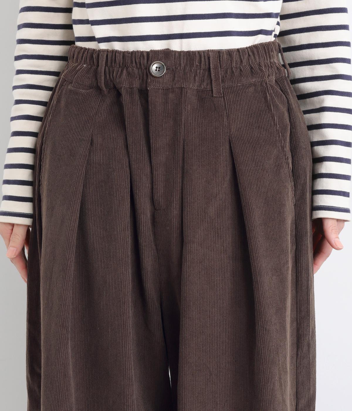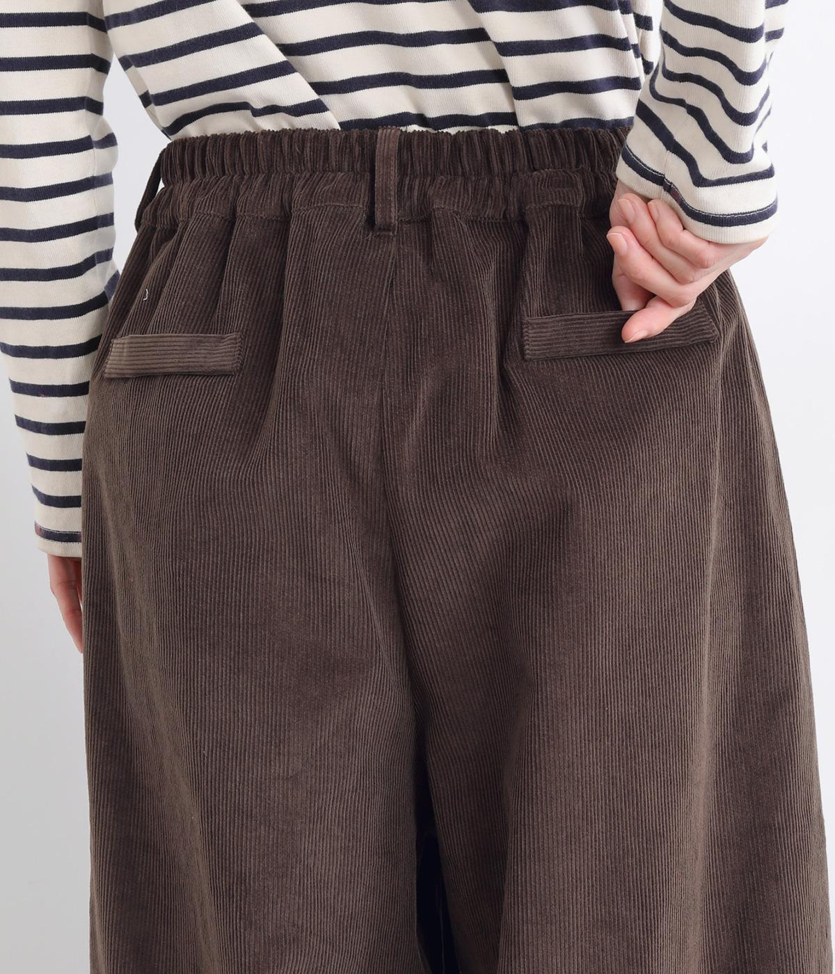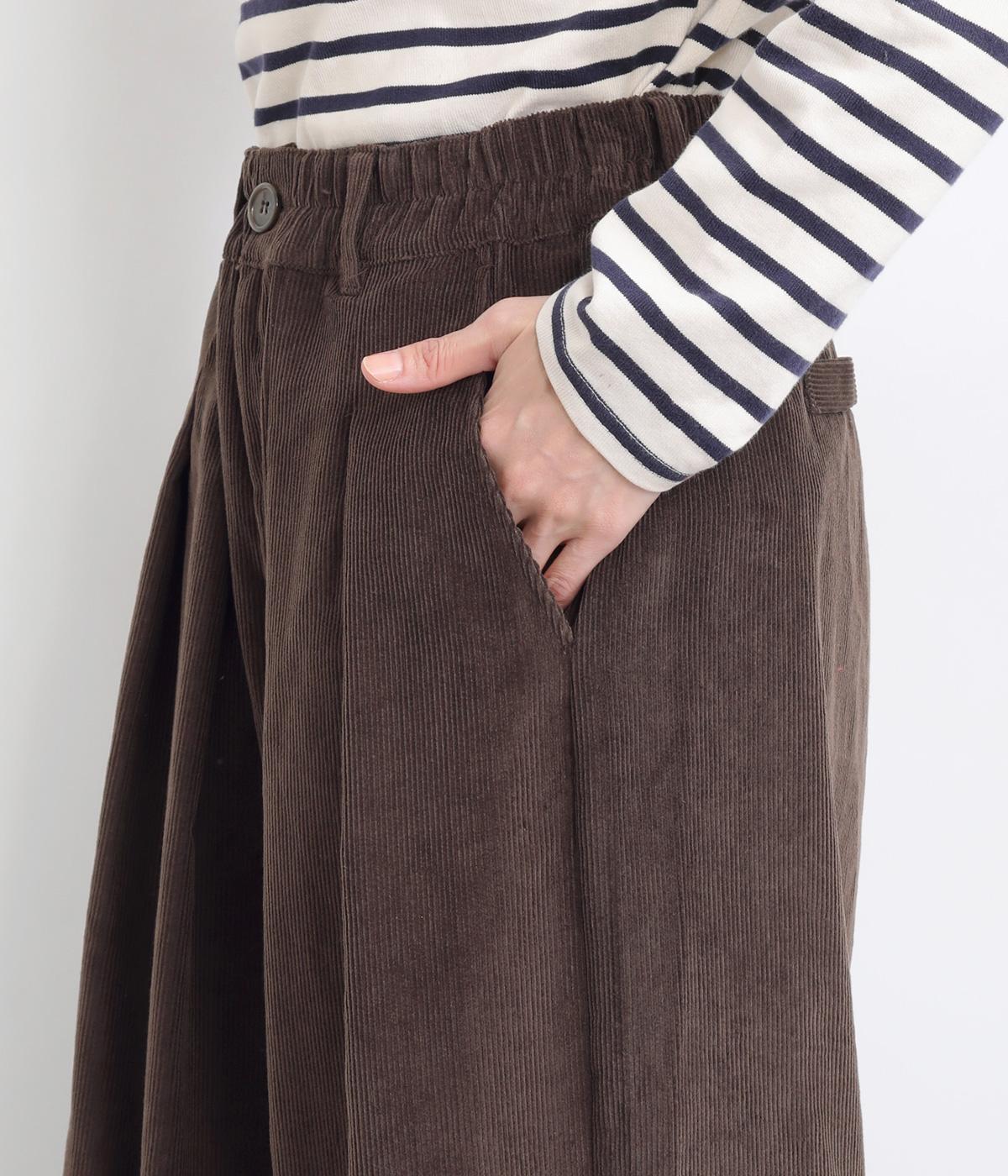 タックと裾の長めダーツで自然な立体感を持たせたワイドパンツ。コーデュロイ生地がいい雰囲気を醸し、シンプルな装いでもこなれ感のある大人スタイルが完成。前ファスナーで脱ぎはきしやすく、ウエストゴムでフィット感も◎。