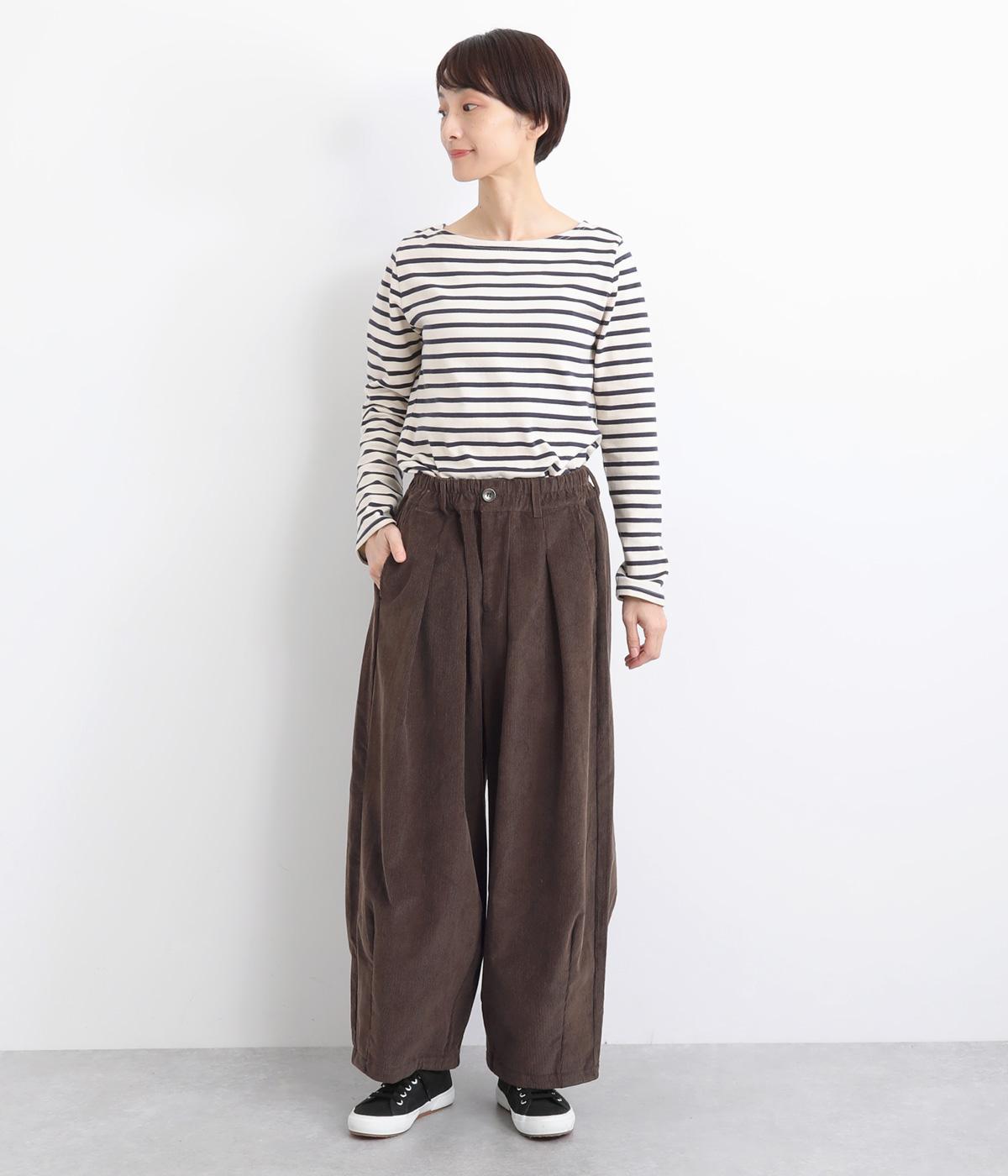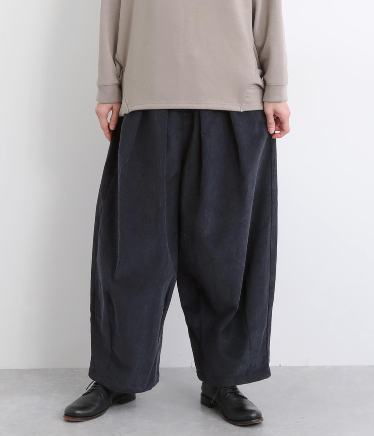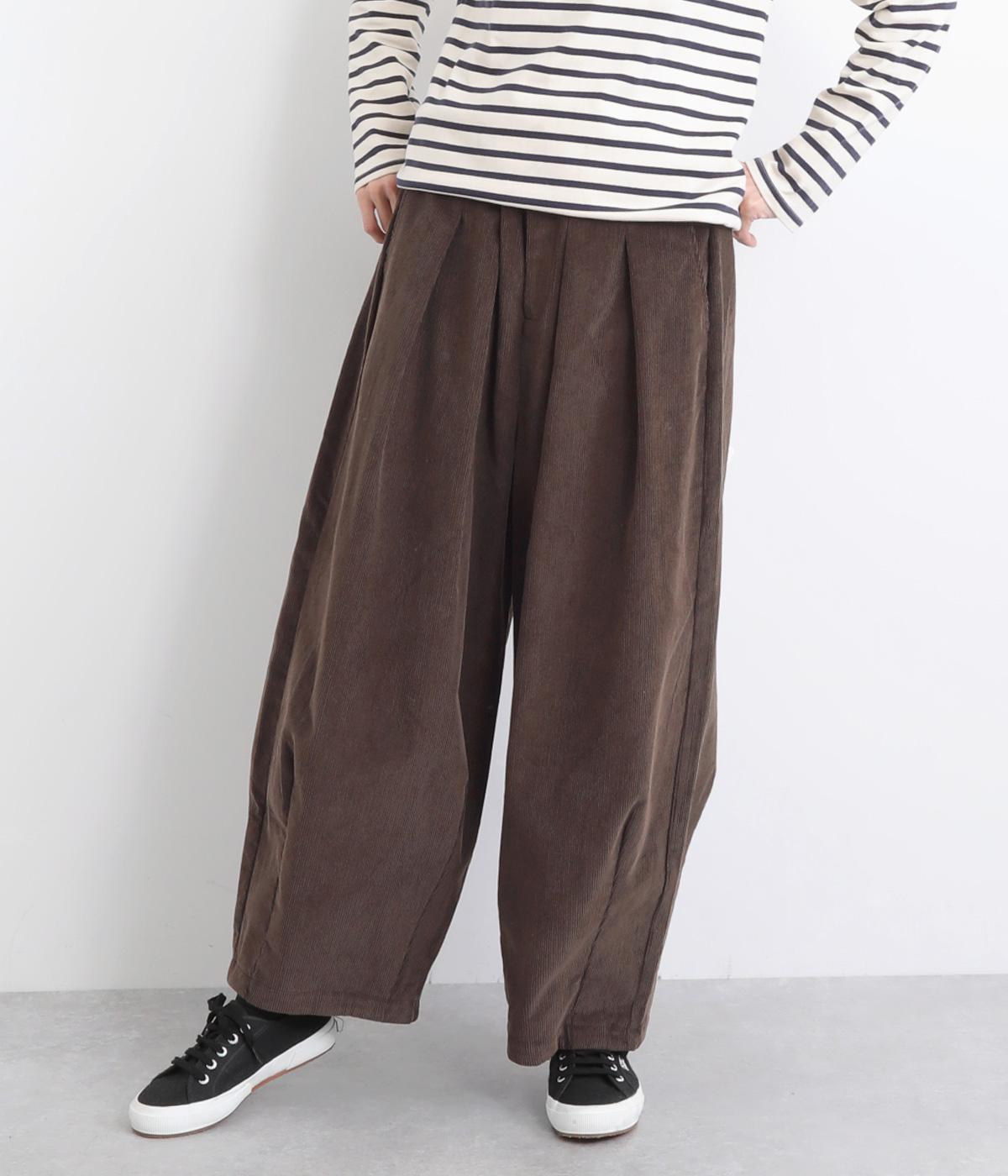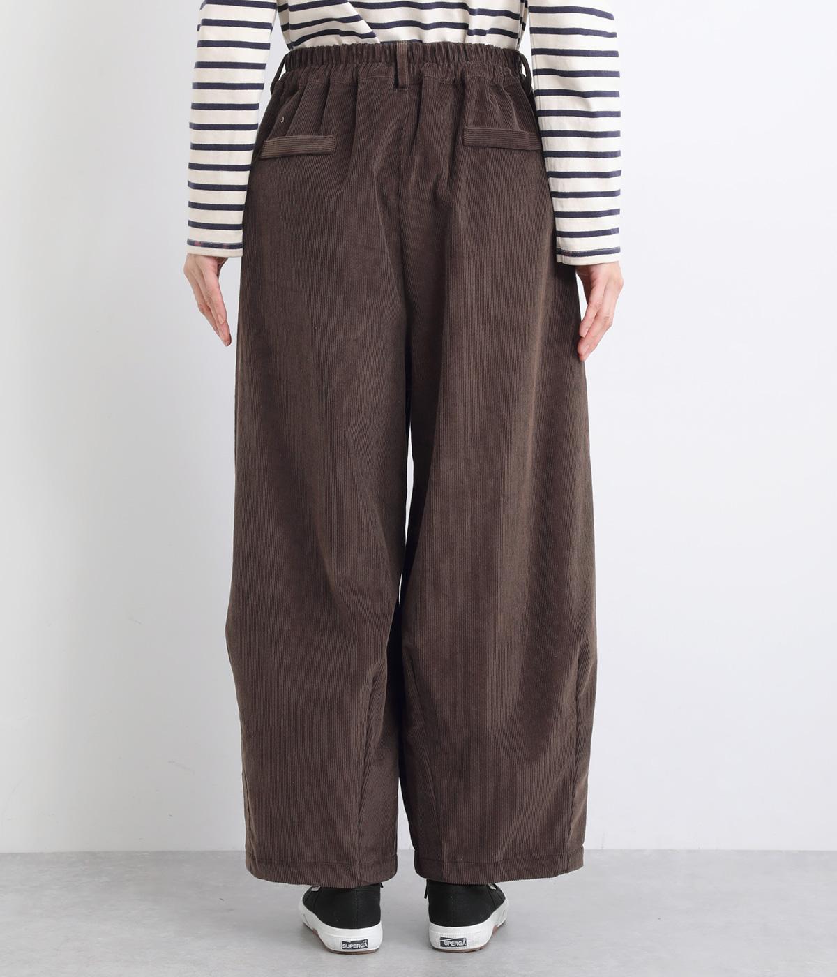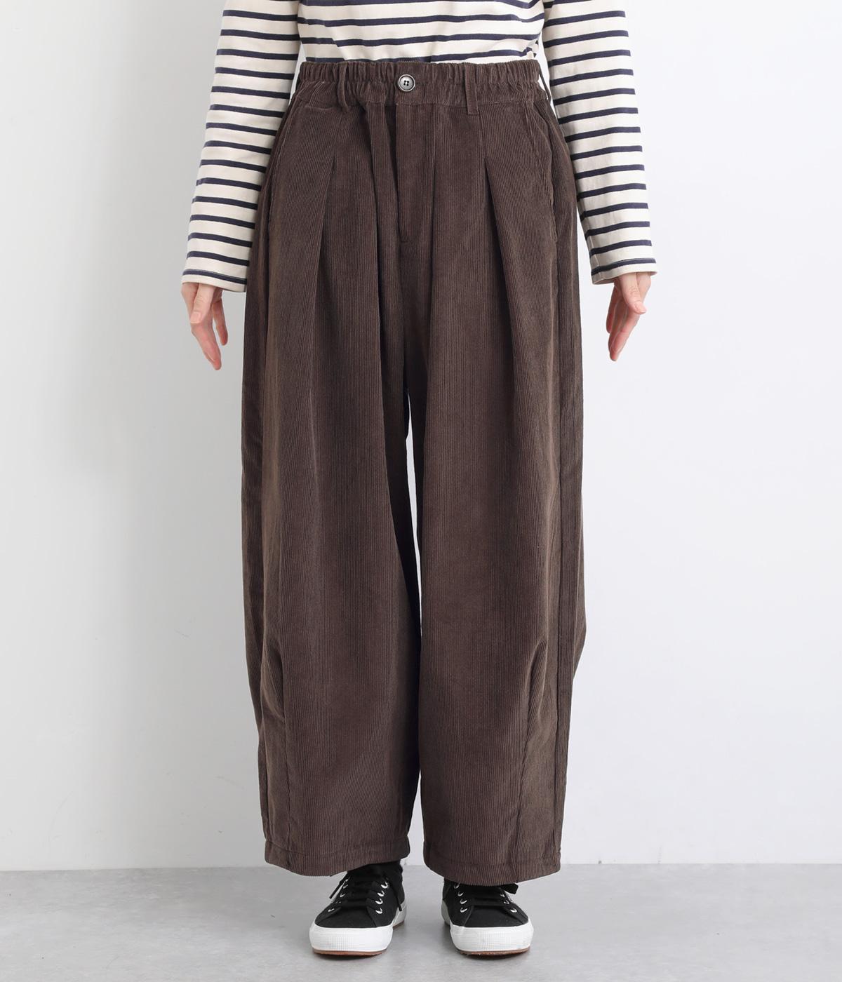 タックと裾の長めダーツで自然な立体感を持たせたワイドパンツ。コーデュロイ生地がいい雰囲気を醸し、シンプルな装いでもこなれ感のある大人スタイルが完成。前ファスナーで脱ぎはきしやすく、ウエストゴムでフィット感も◎。