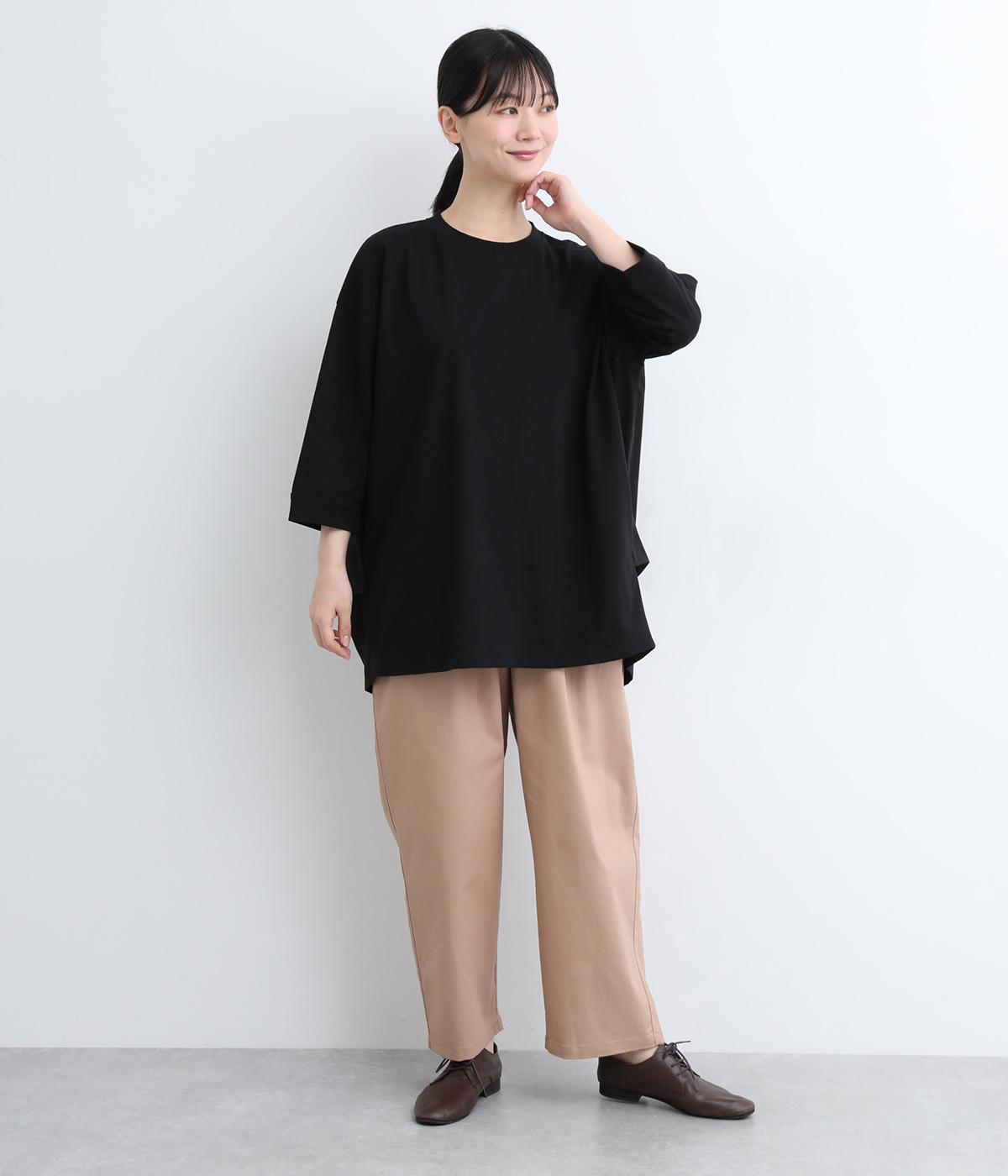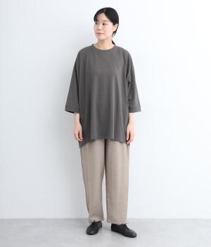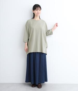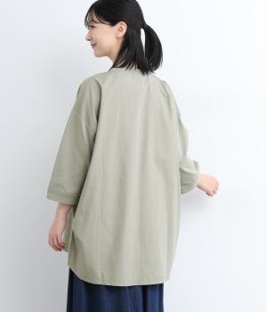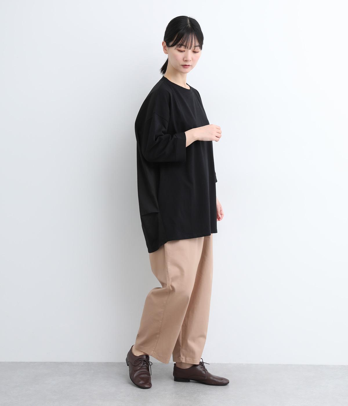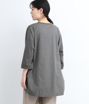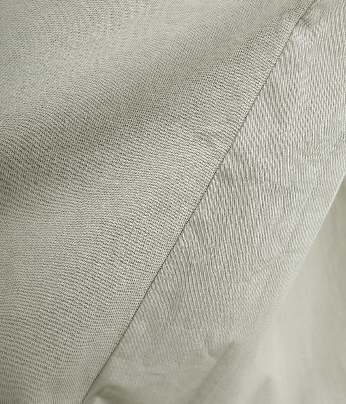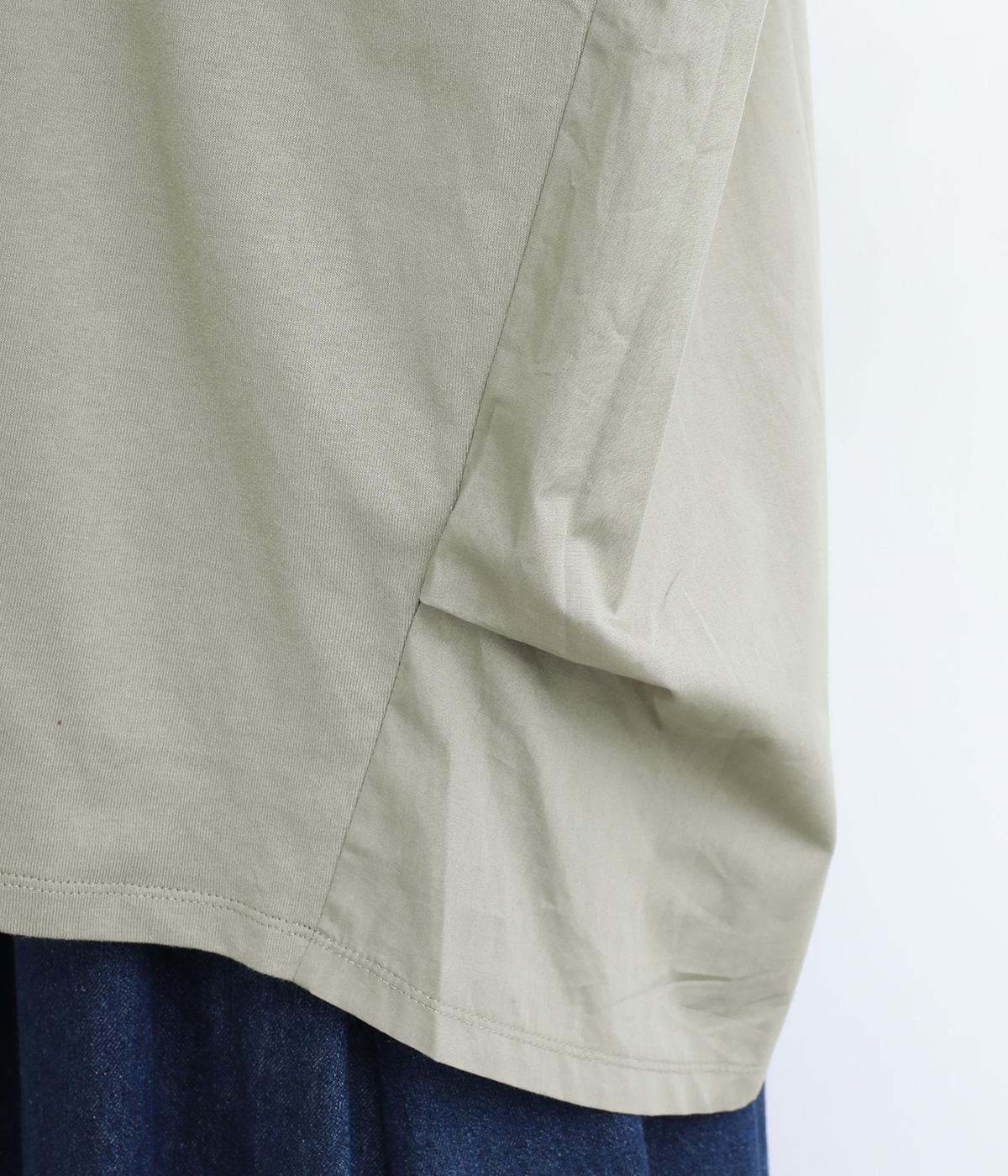 やわらかく伸縮性のあるコットン天竺素材を使用。背面の切り替えには、さらりとした風合いのコットンボイル地を切り替えました。同色異素材切り替えで、さりげない表情の変化が楽しめます。
