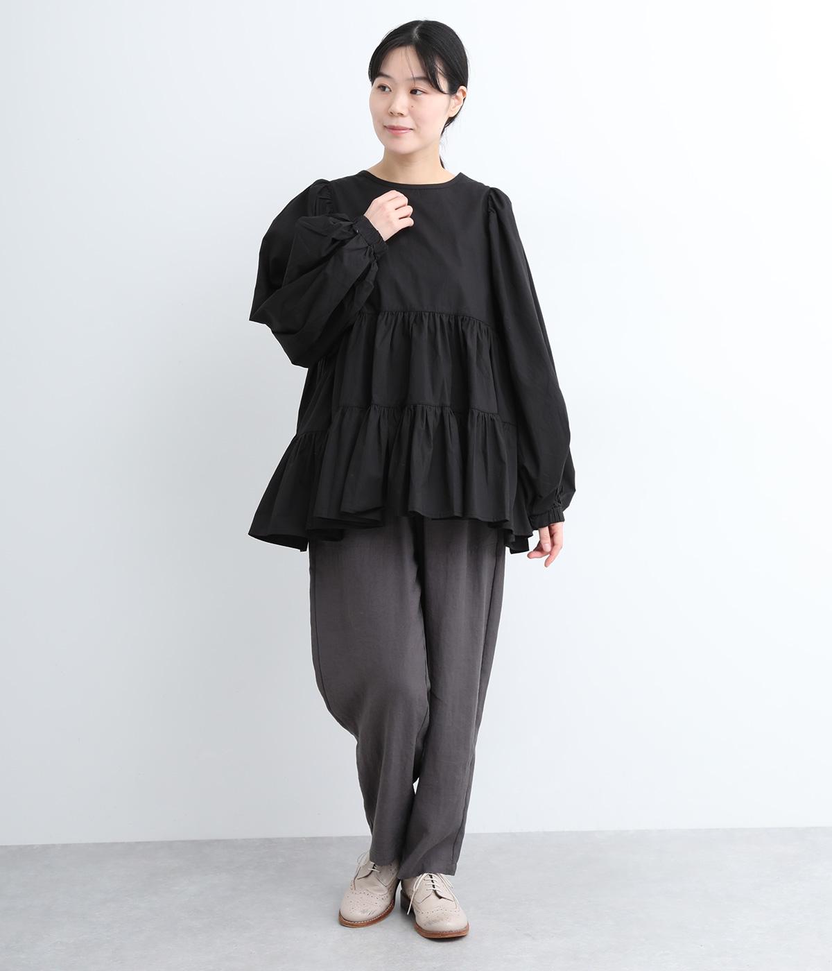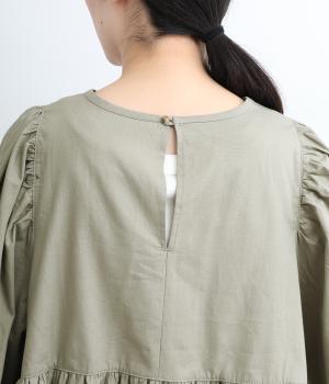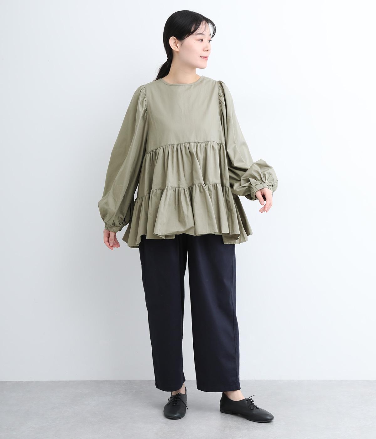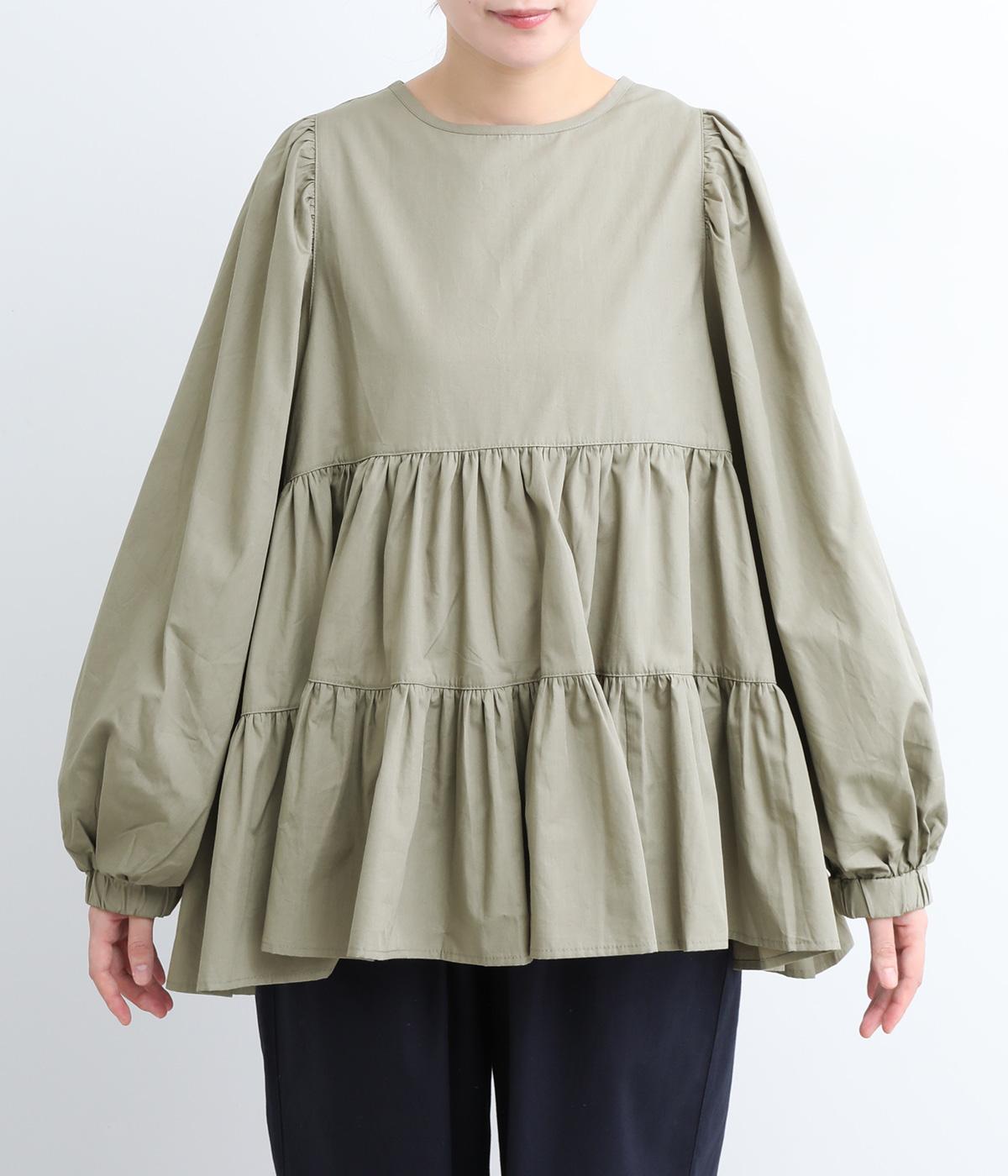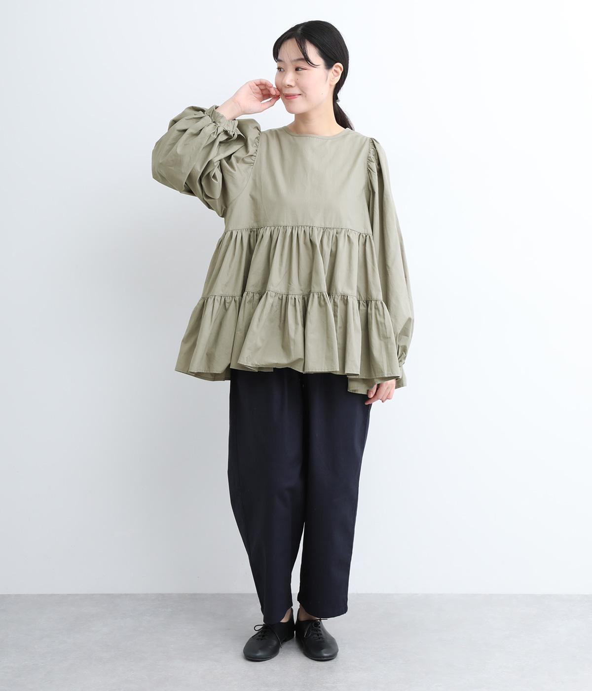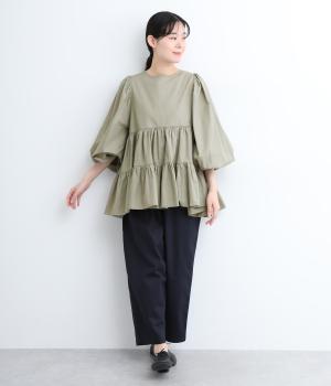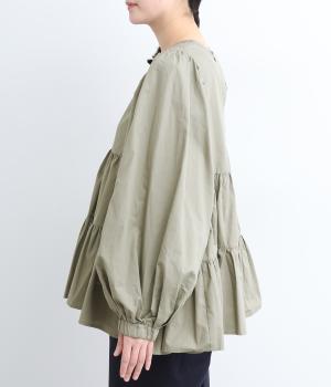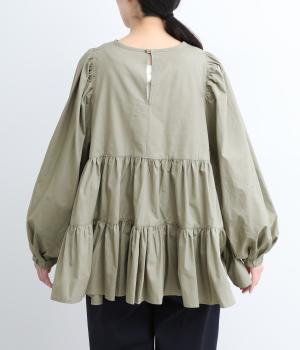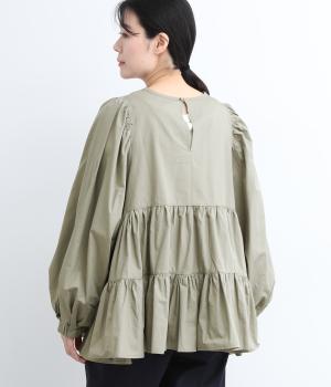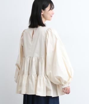 切り替えとギャザーを重ねたボリュームたっぷりのティアードデザインです。シンプルにボトムと合わせるだけで華やかな印象に。袖口ゴム入りでバルーン袖にアレンジするのもおすすめ。