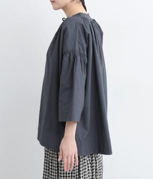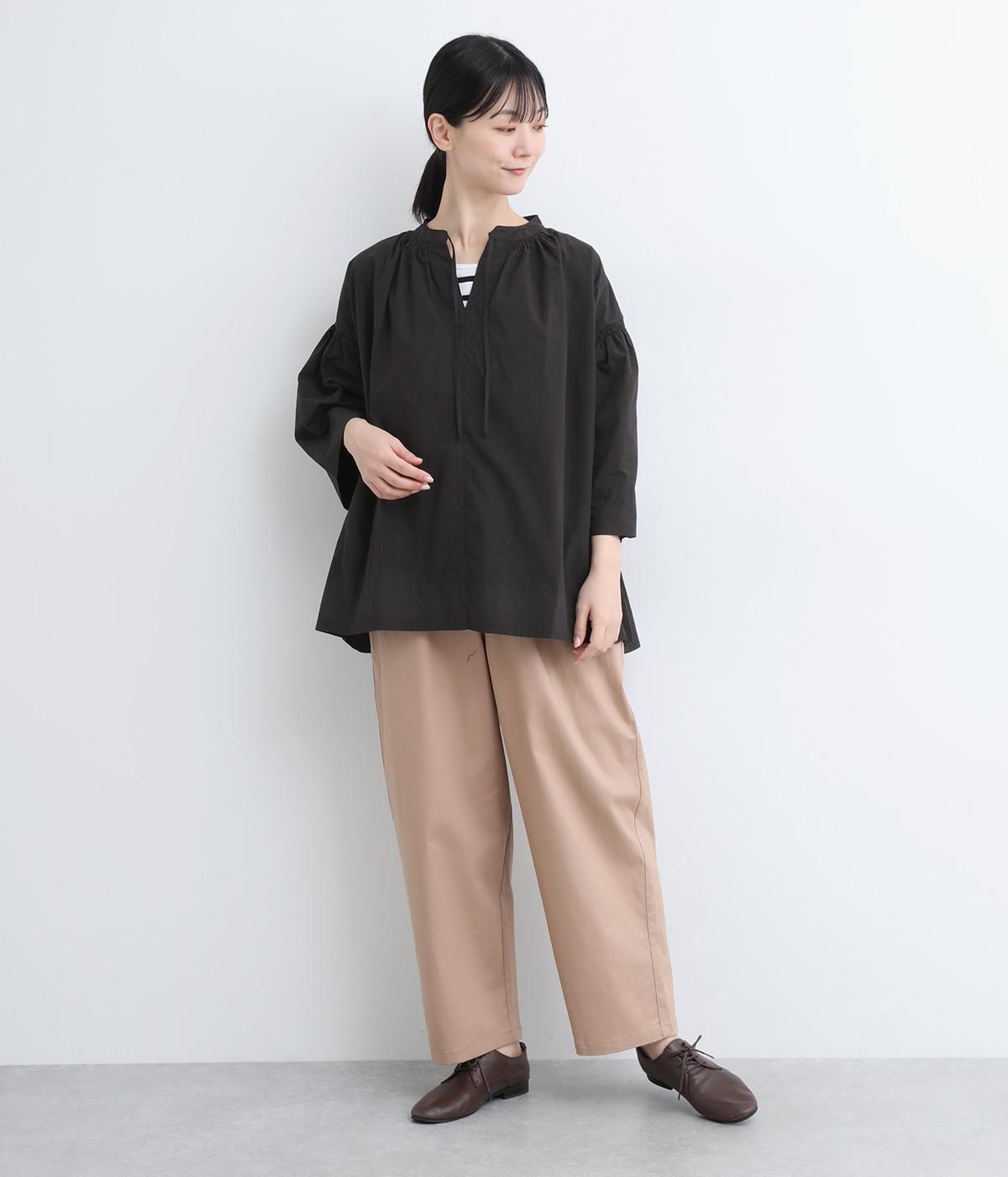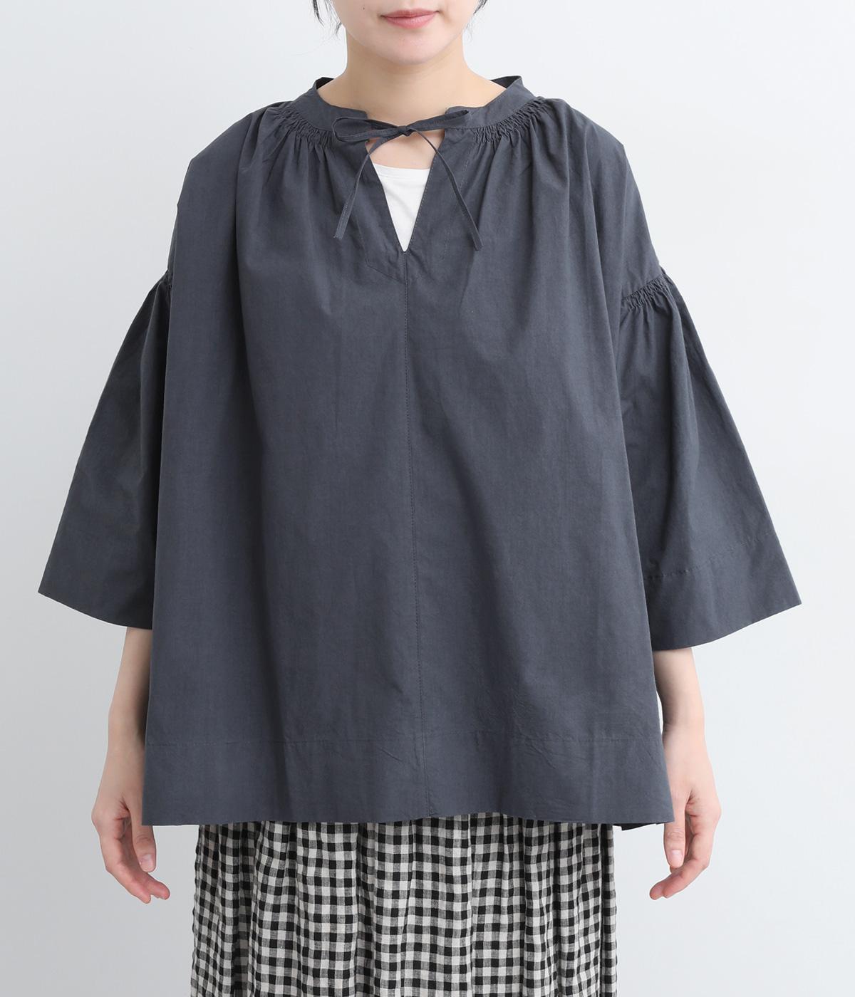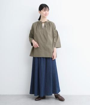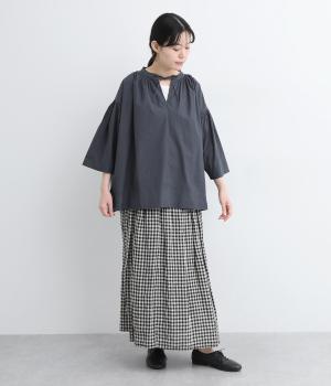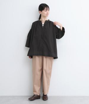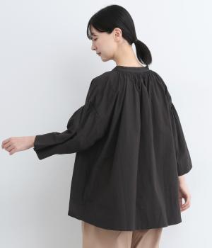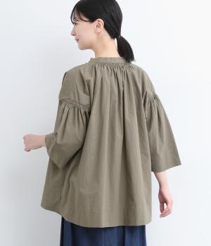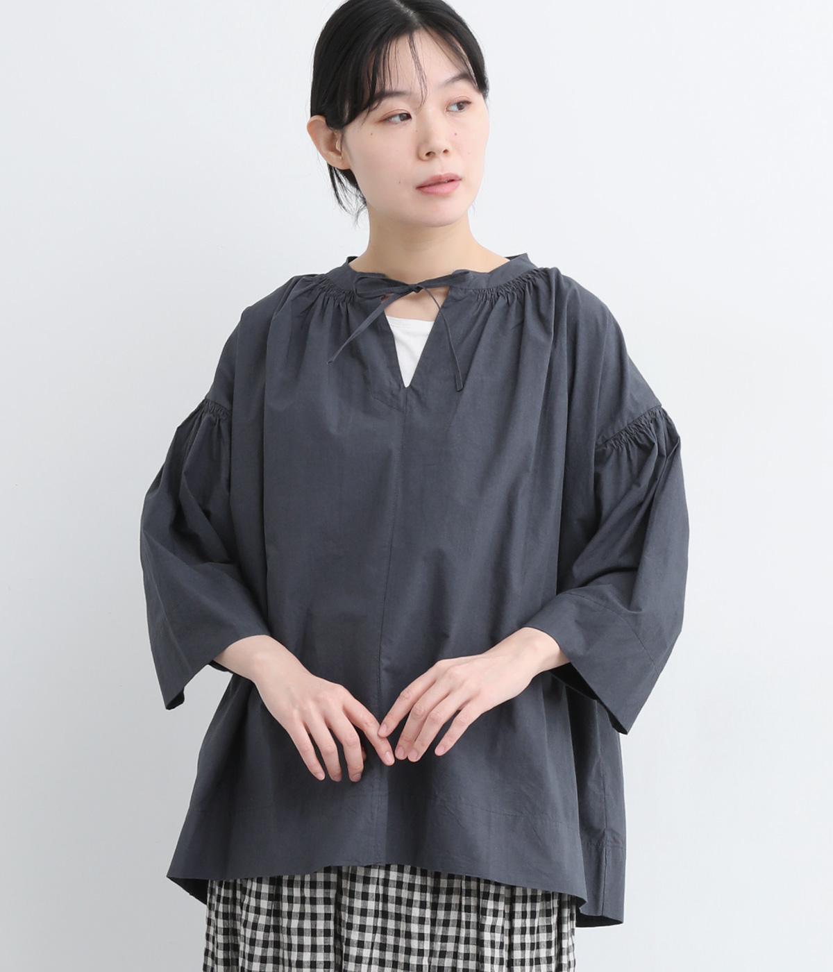ネックのスリットが顔まわりをきれいに映すプルオーバーブラウス。襟もとや肩にはシャーリングを施した、ディテールにこだわった一枚です。ドロップショルダーにフレアな袖ラインが、大人の抜け感を漂わせます。