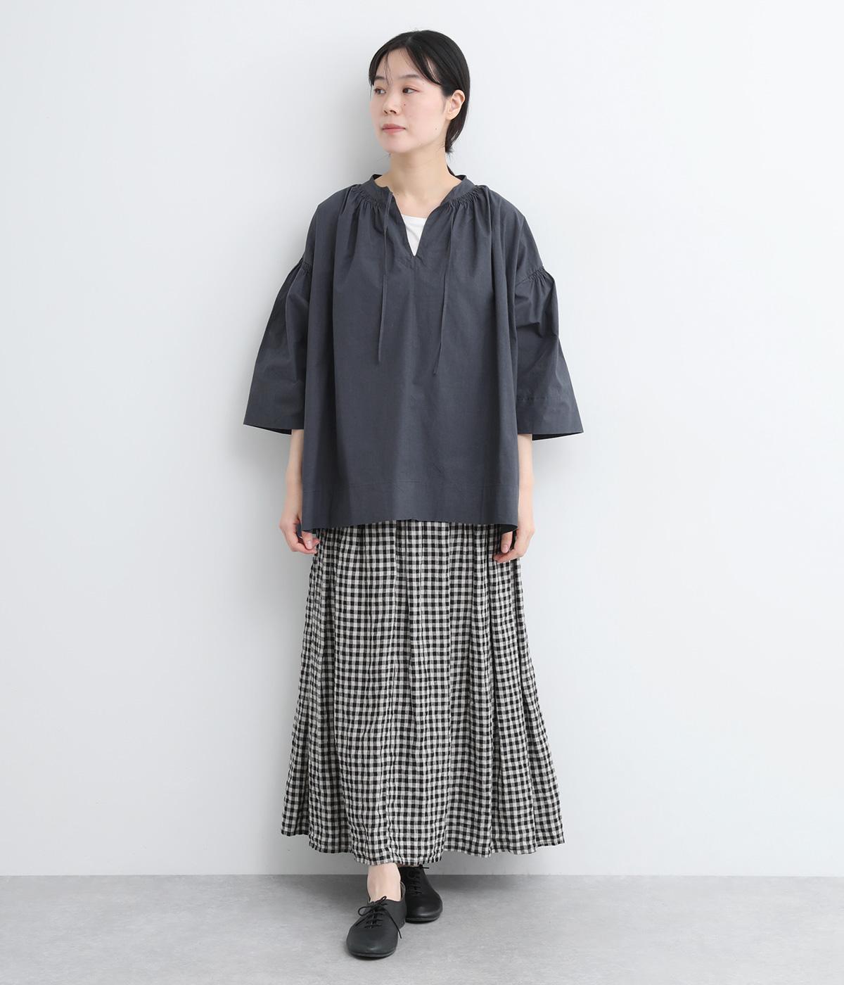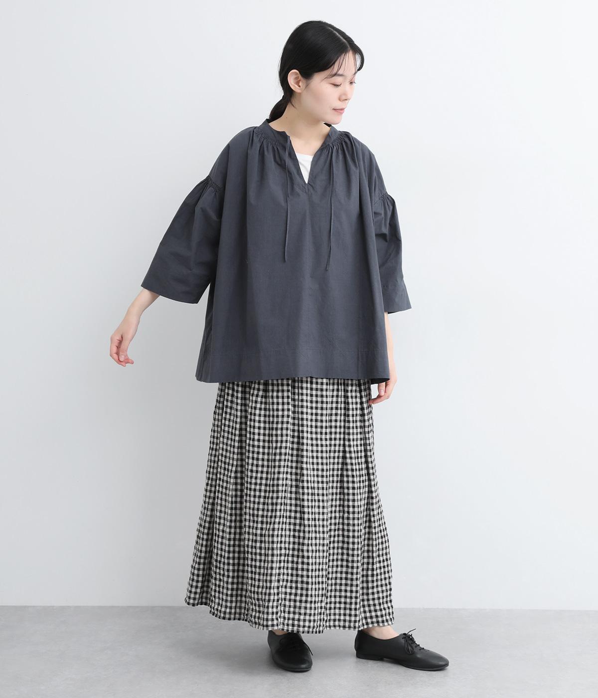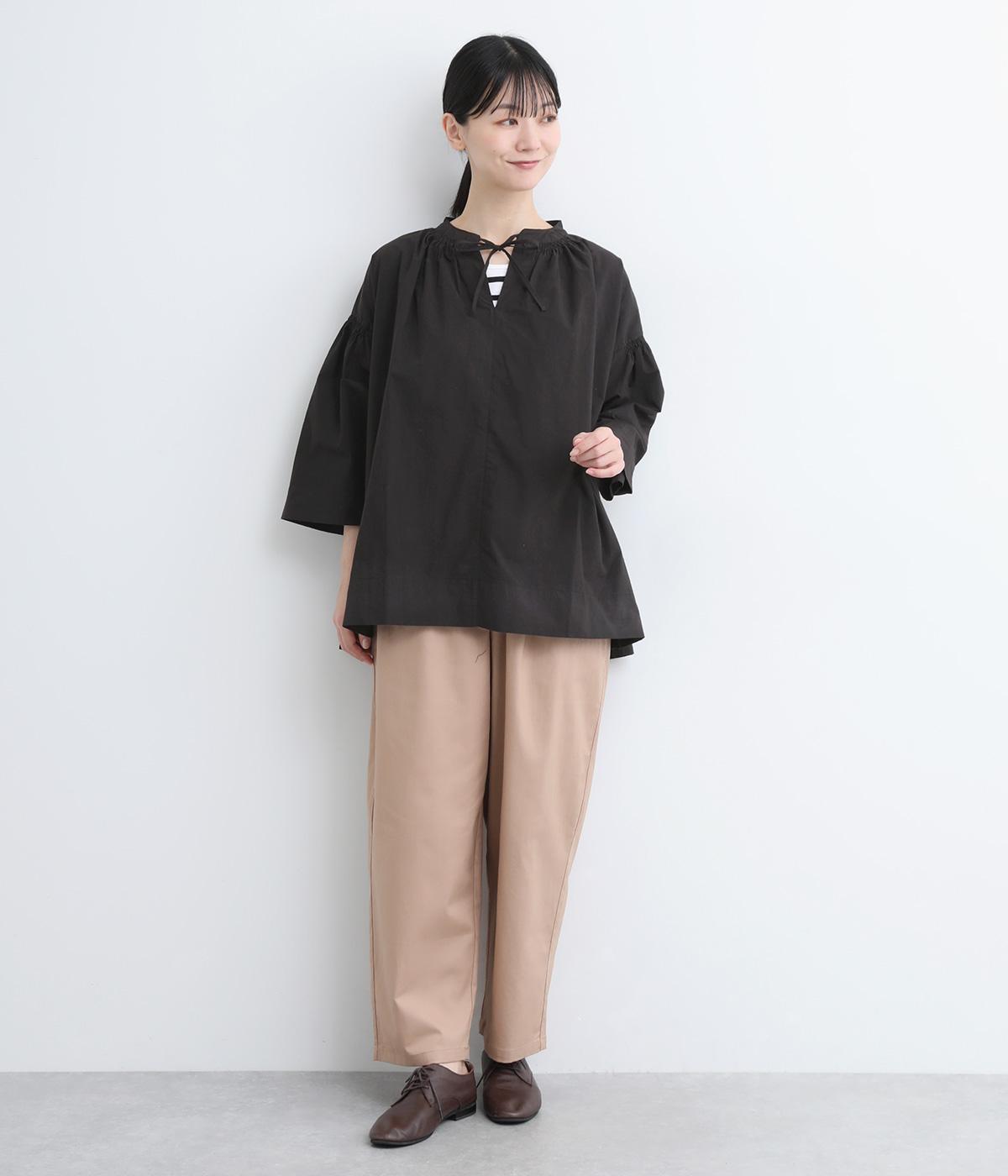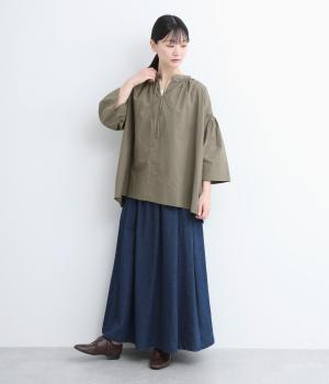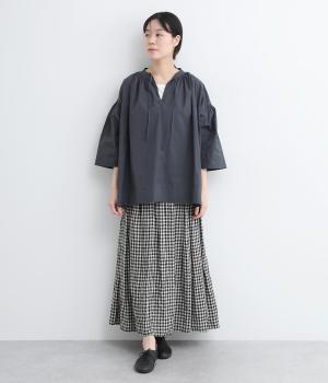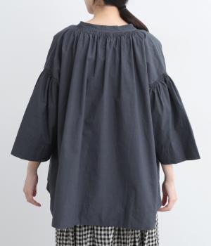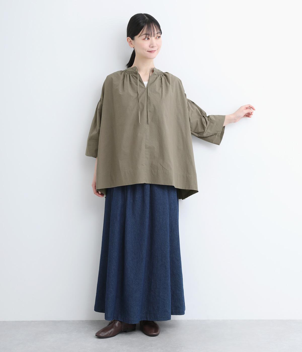 ネックのスリットが顔まわりをきれいに映すプルオーバーブラウス。襟もとや肩にはシャーリングを施した、ディテールにこだわった一枚です。ドロップショルダーにフレアな袖ラインが、大人の抜け感を漂わせます。